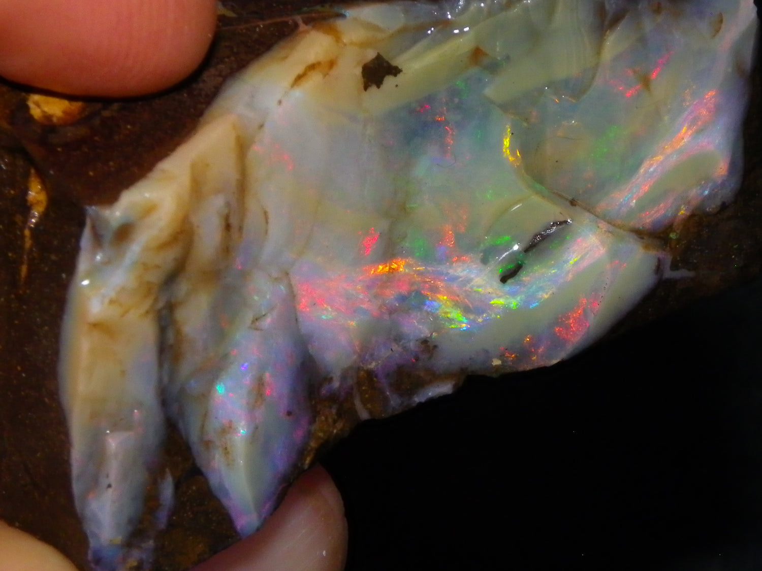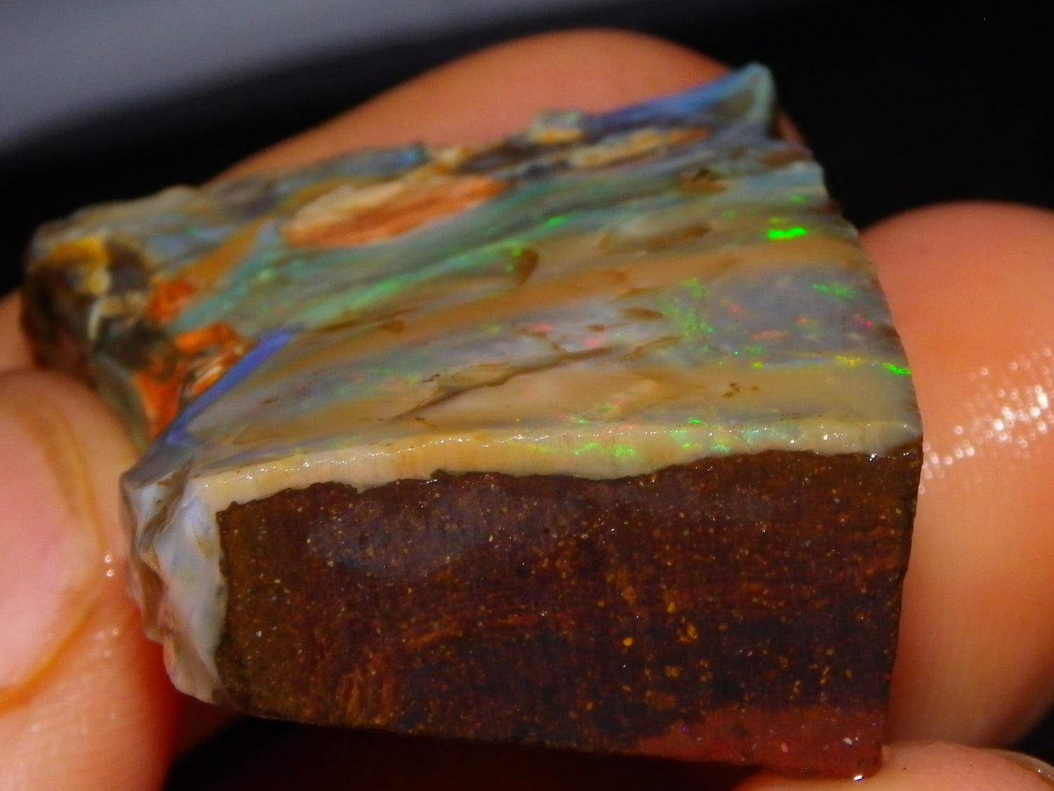 I have for sale 2 nice Boulder Opal Rough/Split Specimens from Winton, Queensland. They weigh 400cts in total. These are Ironstone base with Crystal/Milky Opal on the top face. There is one vien with slight greens. The half bowl shaped stone has lots of multicolours running around the opal. Pink/Gold/Orange/Greens, Turns more potchy/caramel, no colour in one corner. The face is not flat, stepped opal, could get some Small Cabs if sliced/diced up. But i think clean up as a specimen. Patch of colour on one side too. The second piece has some lovely pastel Bars/mixed pattern and Fires with some Caramel potch lines aswell. Some natutal fractures in a few places and a pit. Both great specimens, maybe clean up for cabinet display or try and cut them. Thanks for looking.