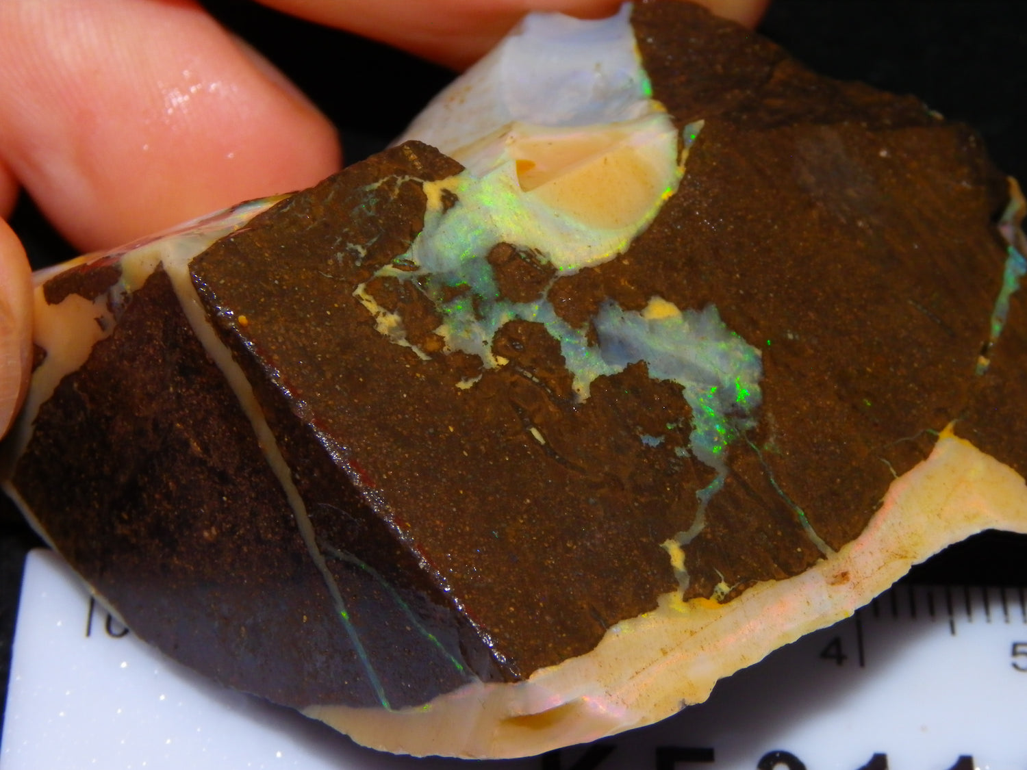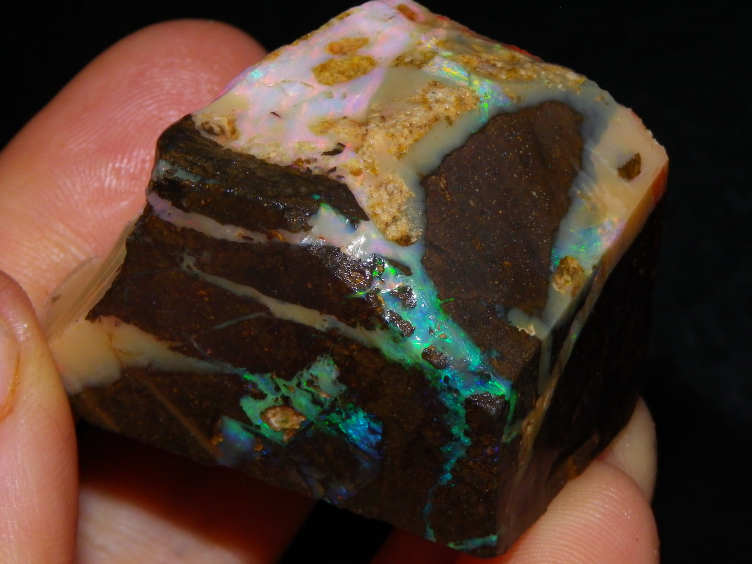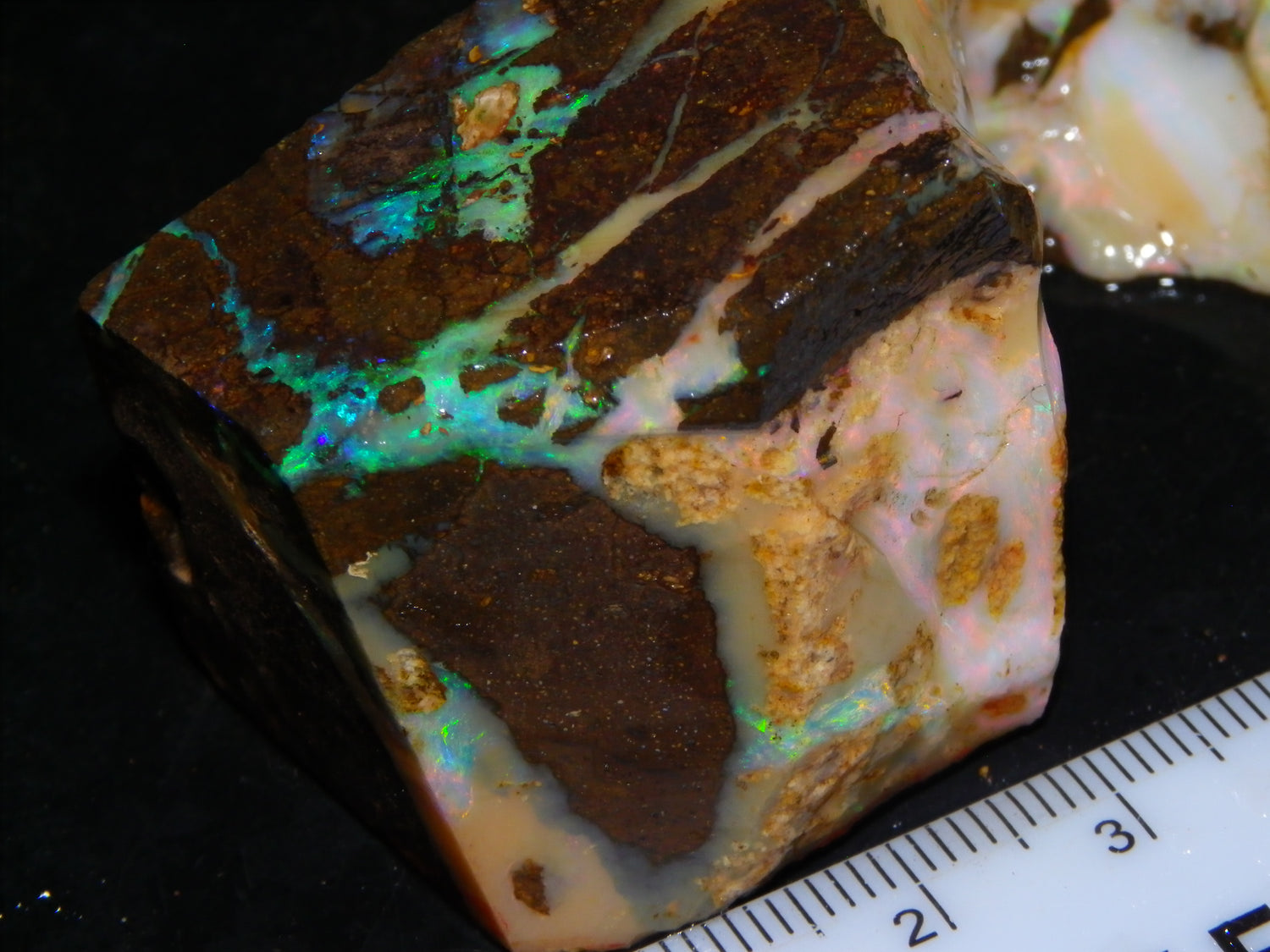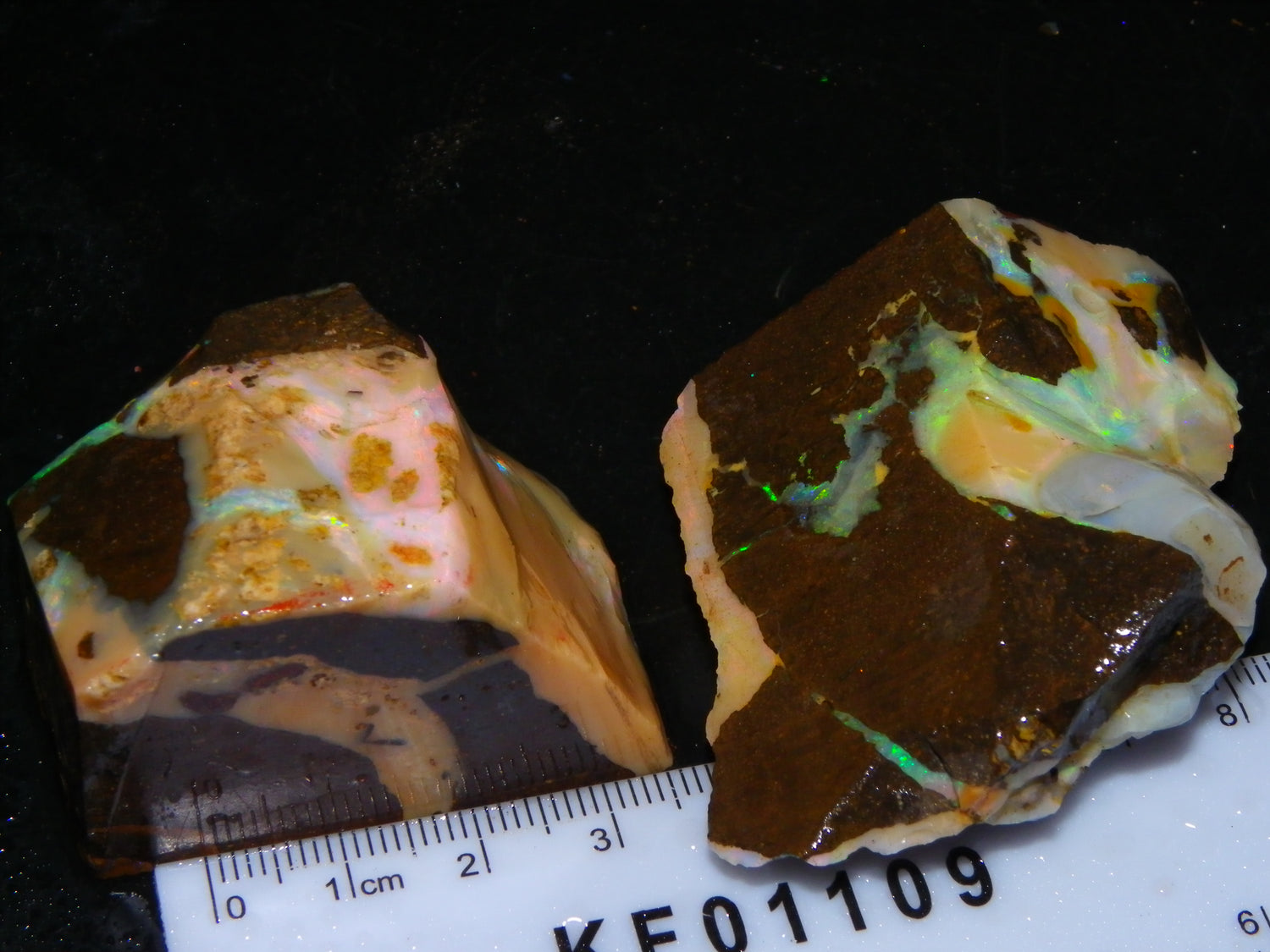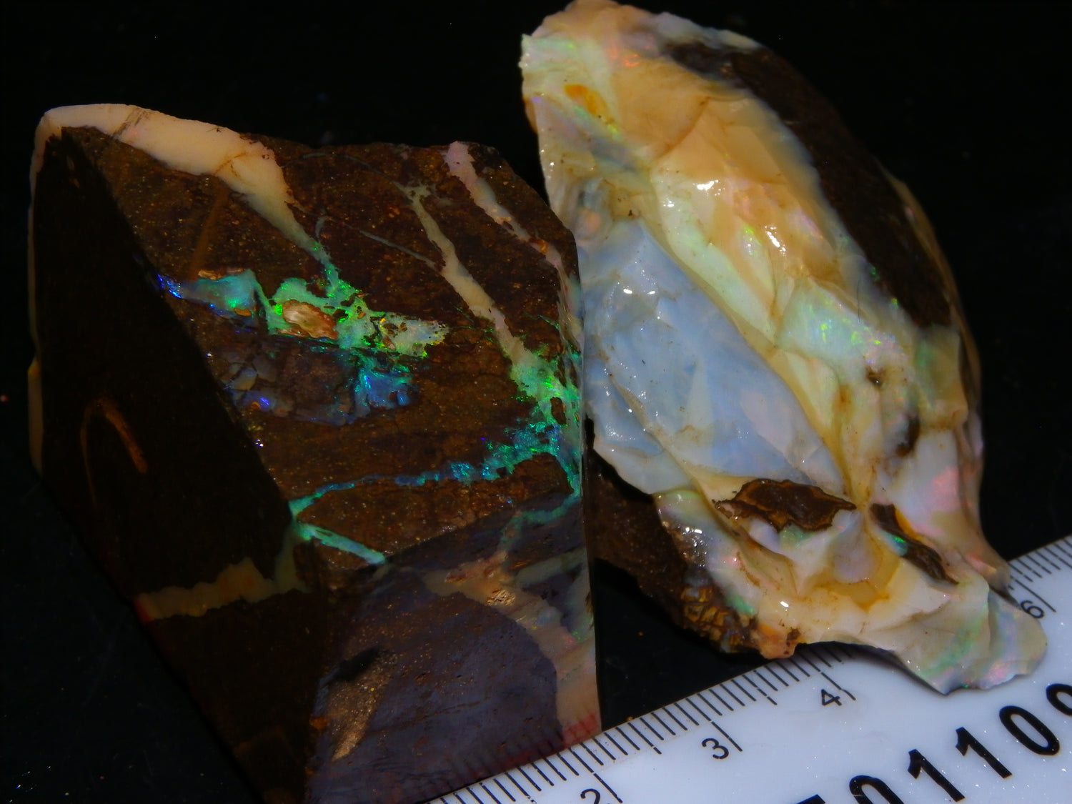 I have for sale 2 chunky Rough/Sliced Boulder Opal specimens, Projects from Winton Area, Queensland Australia. These weigh 705cts in total. These both have a lot of Opal in them. Also Potch/Ironstone. Mixed Crystal/White/Caramel material. First has Caramel potch wrapped around 2 sides, and a thick potch bar under that. It has a bar of Multicolour, clean opal sat through the middle. That changes from Pink/Gold to Green/Blues on the other side. The other has a mix of opal sat around the ironstone core. Veins all over, and some Bars of Green/Golds goind a good way into it. Interesting parcel. 2 Great Specimens as they are. Or slice up, and you should get a few decent cabs from these. Thanks for looking.