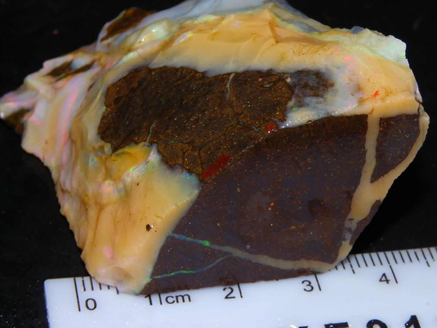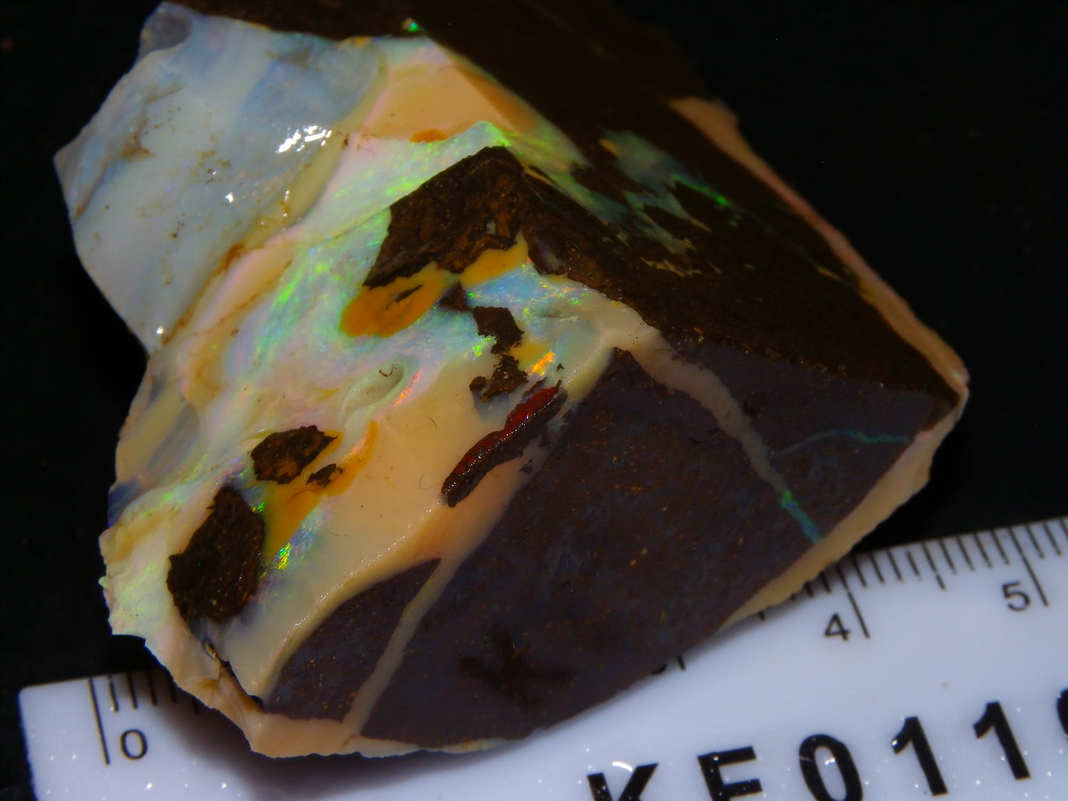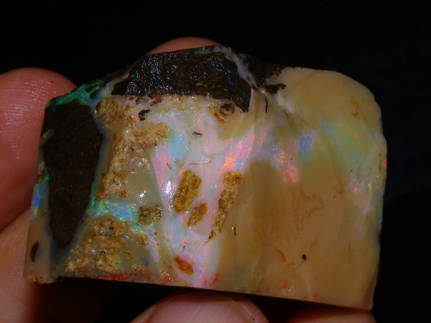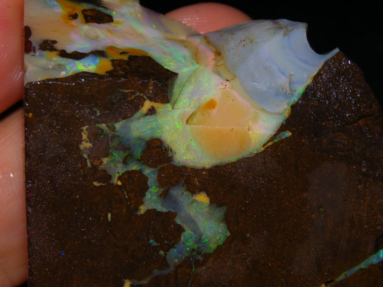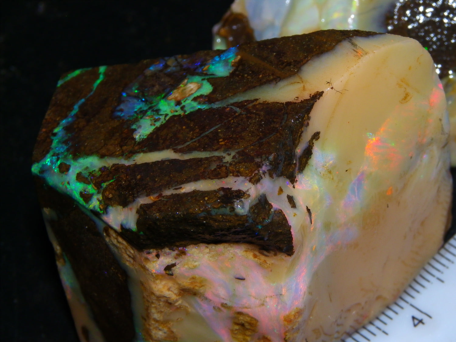I have for sale 2 chunky Rough/Sliced Boulder Opal specimens, Projects from Winton Area, Queensland Australia. These weigh 705cts in total. These both have a lot of Opal in them. Also Potch/Ironstone. Mixed Crystal/White/Caramel material. First has Caramel potch wrapped around 2 sides, and a thick potch bar under that. It has a bar of Multicolour, clean opal sat through the middle. That changes from Pink/Gold to Green/Blues on the other side. The other has a mix of opal sat around the ironstone core. Veins all over, and some Bars of Green/Golds goind a good way into it. Interesting parcel. 2 Great Specimens as they are. Or slice up, and you should get a few decent cabs from these. Thanks for looking.