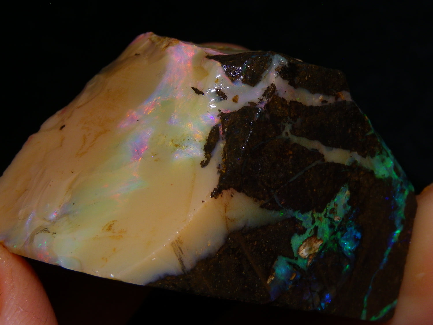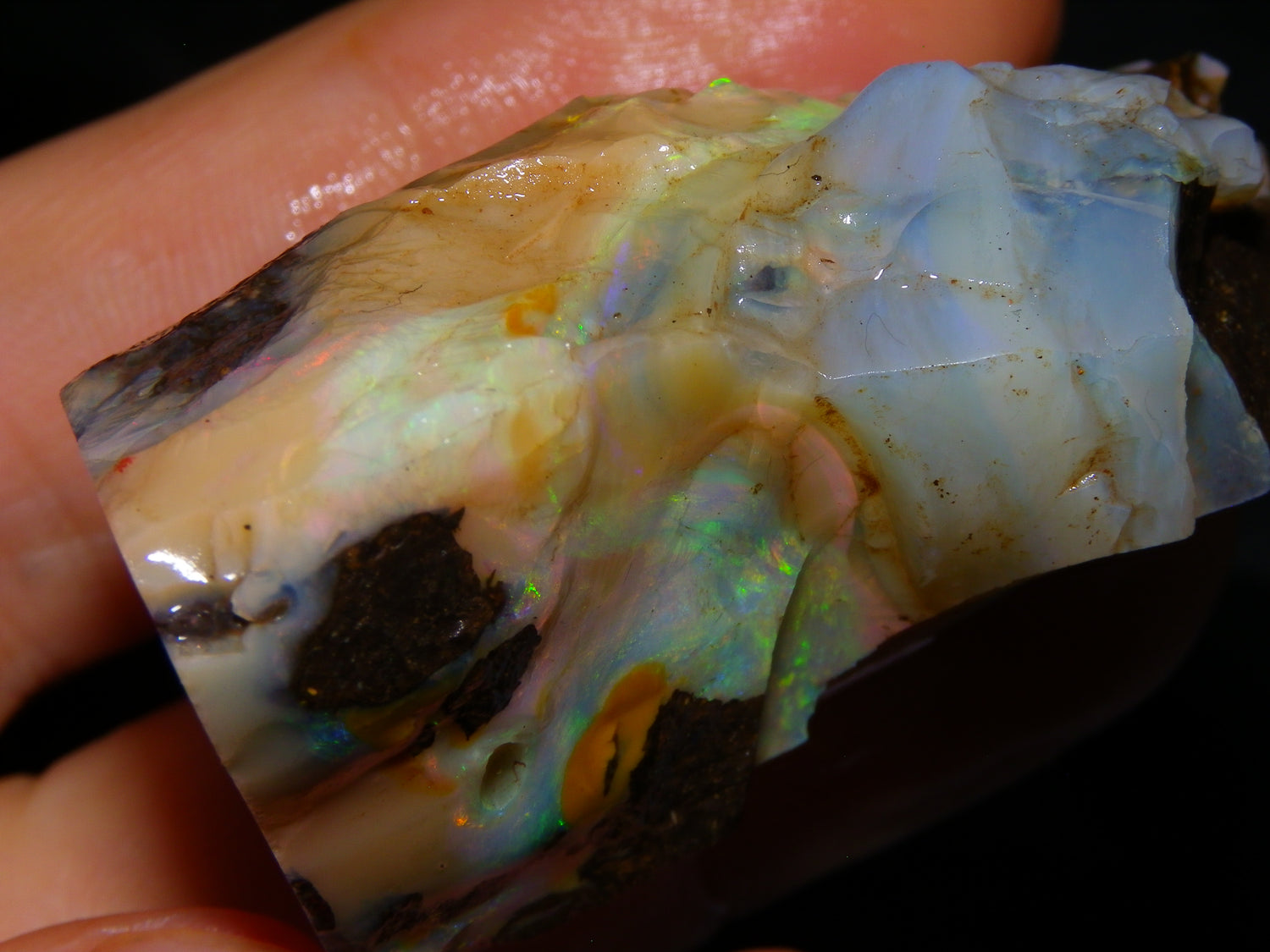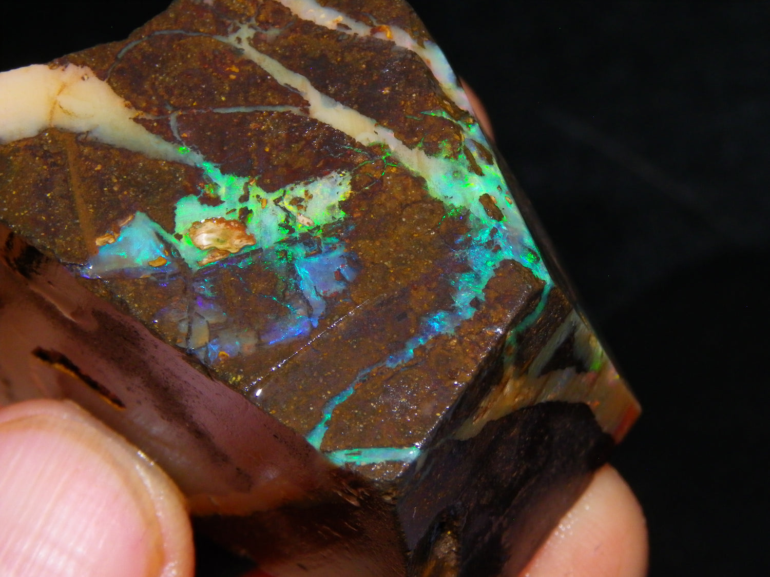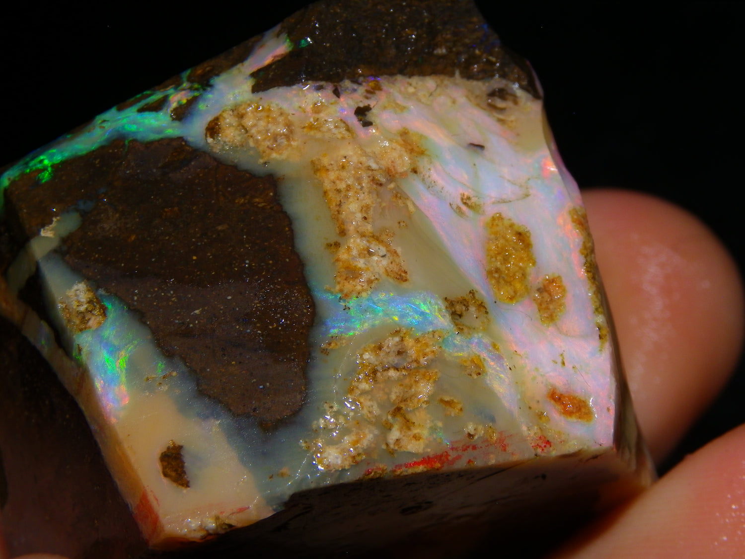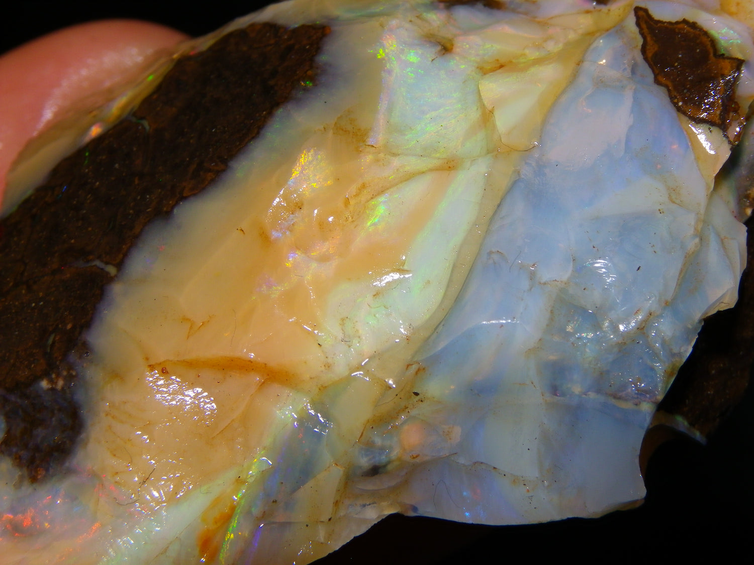 I have for sale 2 chunky Rough/Sliced Boulder Opal specimens, Projects from Winton Area, Queensland Australia. These weigh 705cts in total. These both have a lot of Opal in them. Also Potch/Ironstone. Mixed Crystal/White/Caramel material. First has Caramel potch wrapped around 2 sides, and a thick potch bar under that. It has a bar of Multicolour, clean opal sat through the middle. That changes from Pink/Gold to Green/Blues on the other side. The other has a mix of opal sat around the ironstone core. Veins all over, and some Bars of Green/Golds goind a good way into it. Interesting parcel. 2 Great Specimens as they are. Or slice up, and you should get a few decent cabs from these. Thanks for looking.