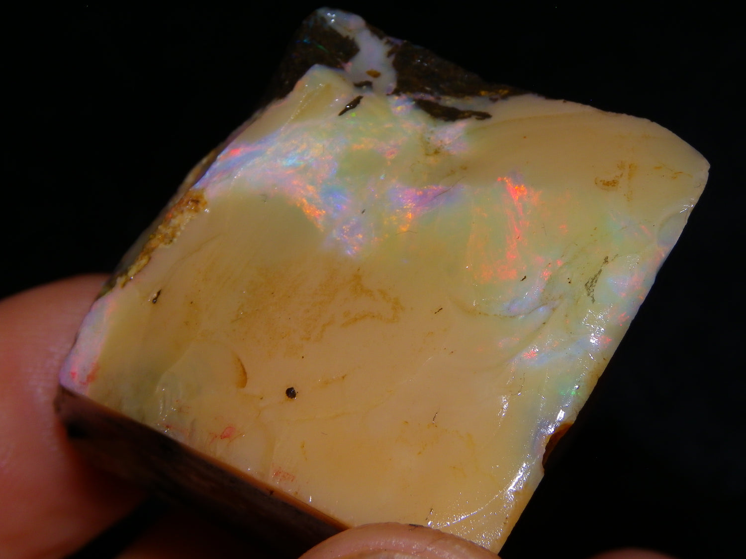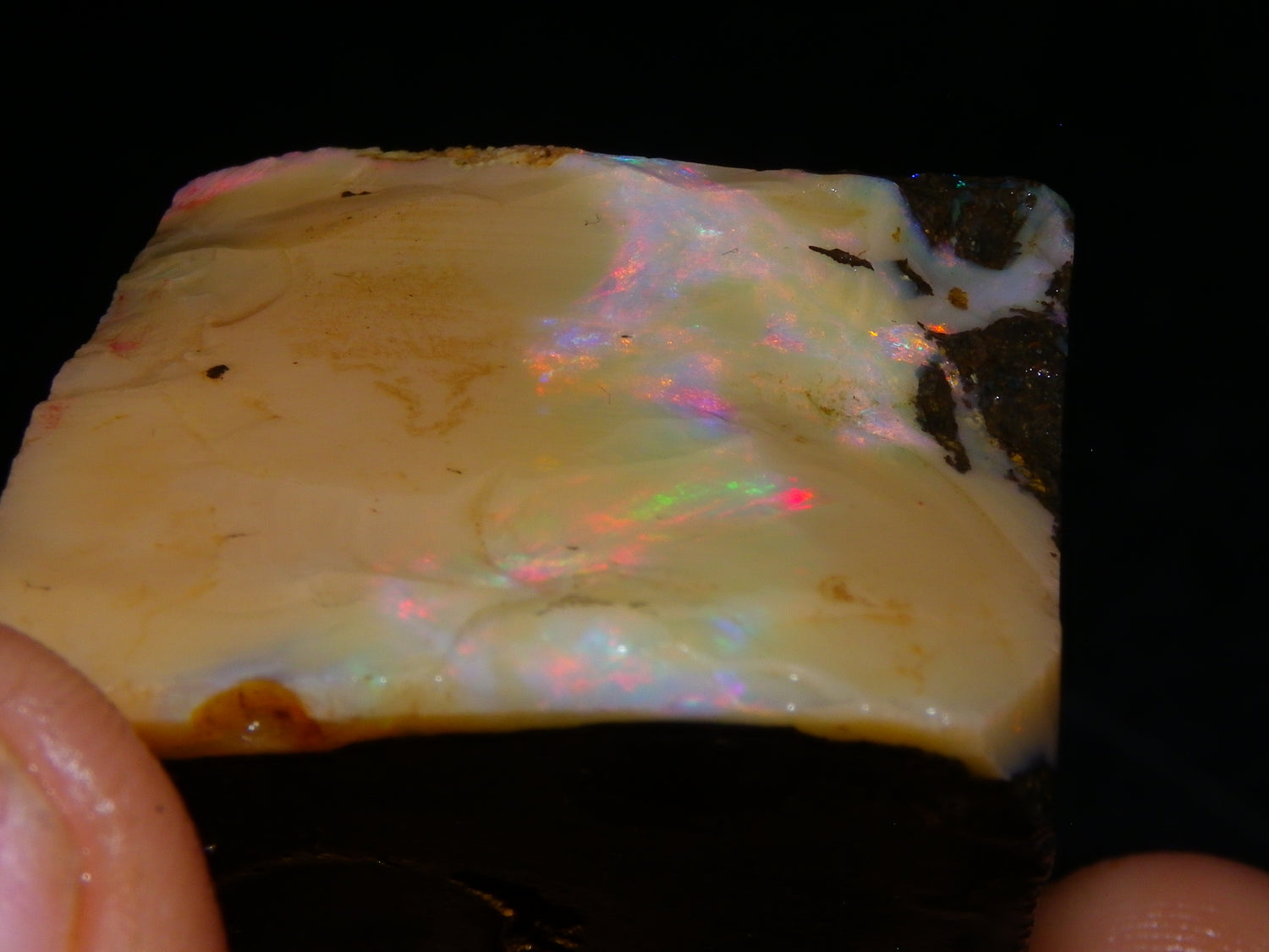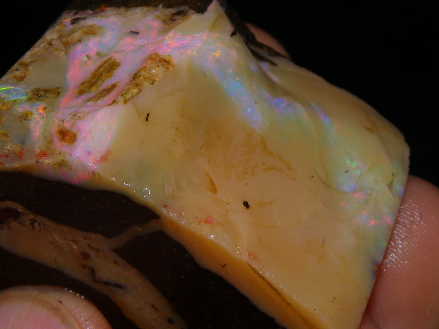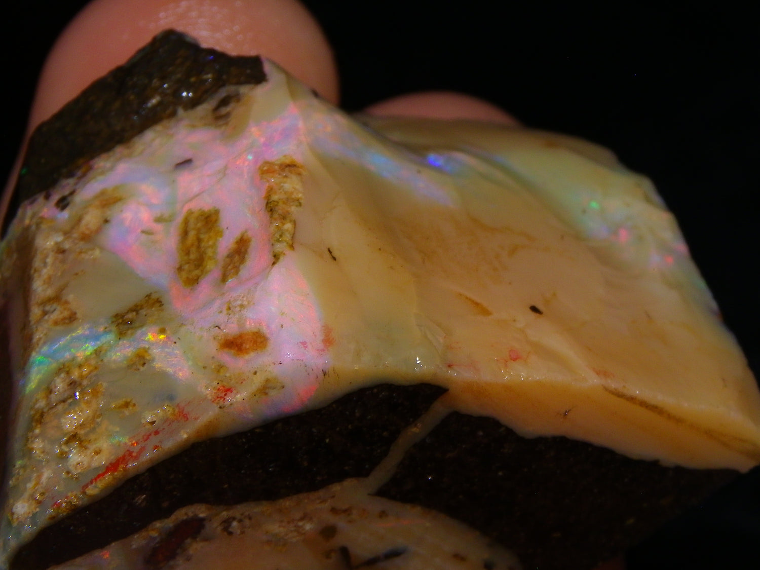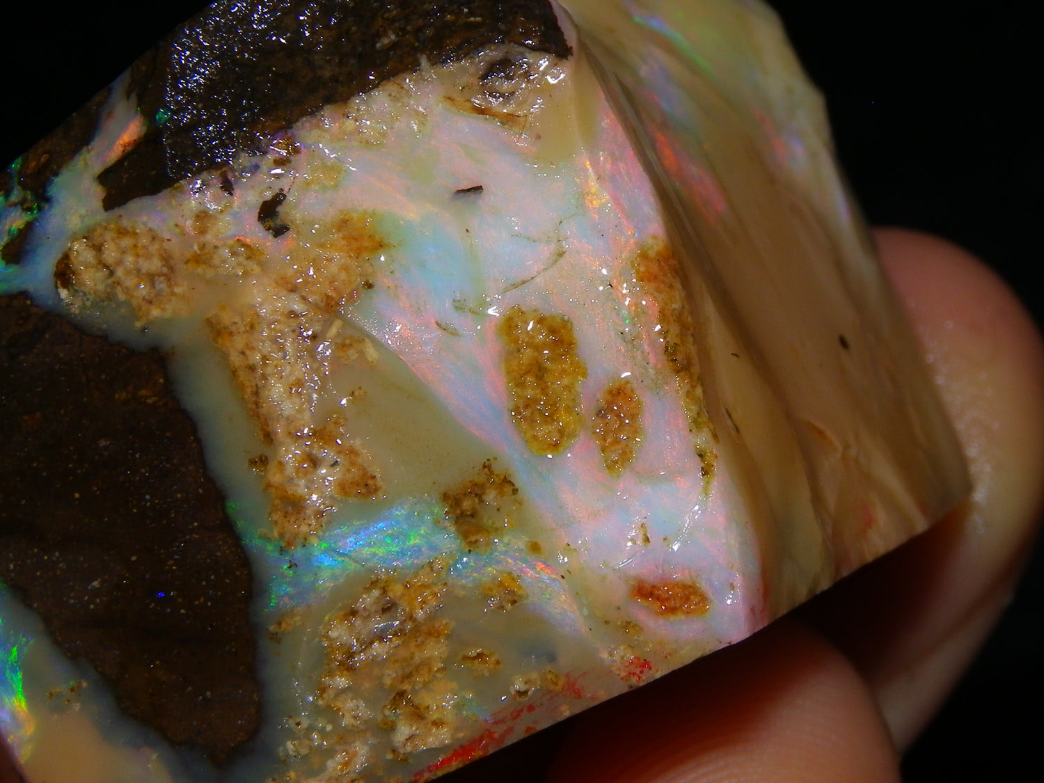 I have for sale 2 chunky Rough/Sliced Boulder Opal specimens, Projects from Winton Area, Queensland Australia. These weigh 705cts in total. These both have a lot of Opal in them. Also Potch/Ironstone. Mixed Crystal/White/Caramel material. First has Caramel potch wrapped around 2 sides, and a thick potch bar under that. It has a bar of Multicolour, clean opal sat through the middle. That changes from Pink/Gold to Green/Blues on the other side. The other has a mix of opal sat around the ironstone core. Veins all over, and some Bars of Green/Golds goind a good way into it. Interesting parcel. 2 Great Specimens as they are. Or slice up, and you should get a few decent cabs from these. Thanks for looking.