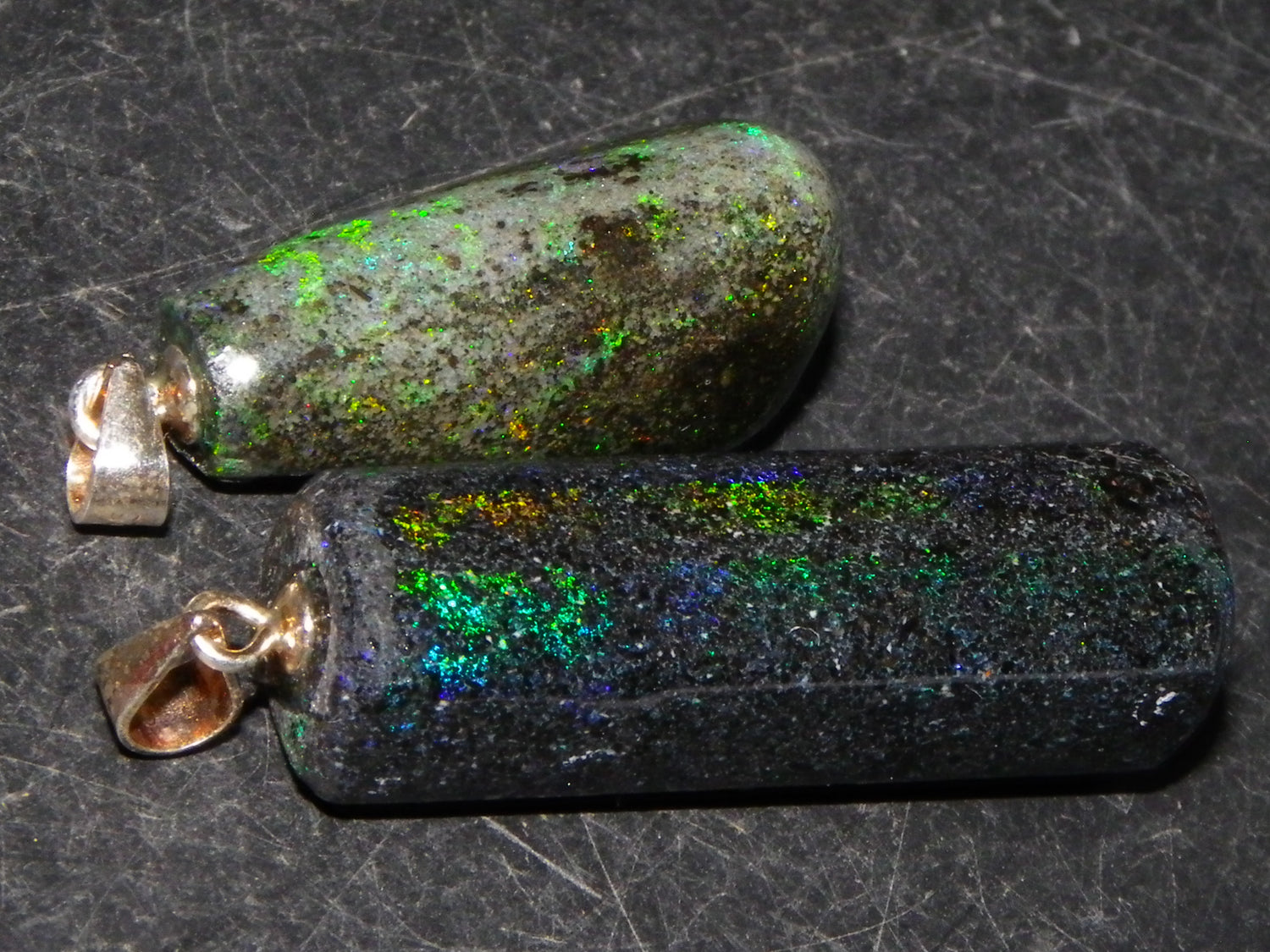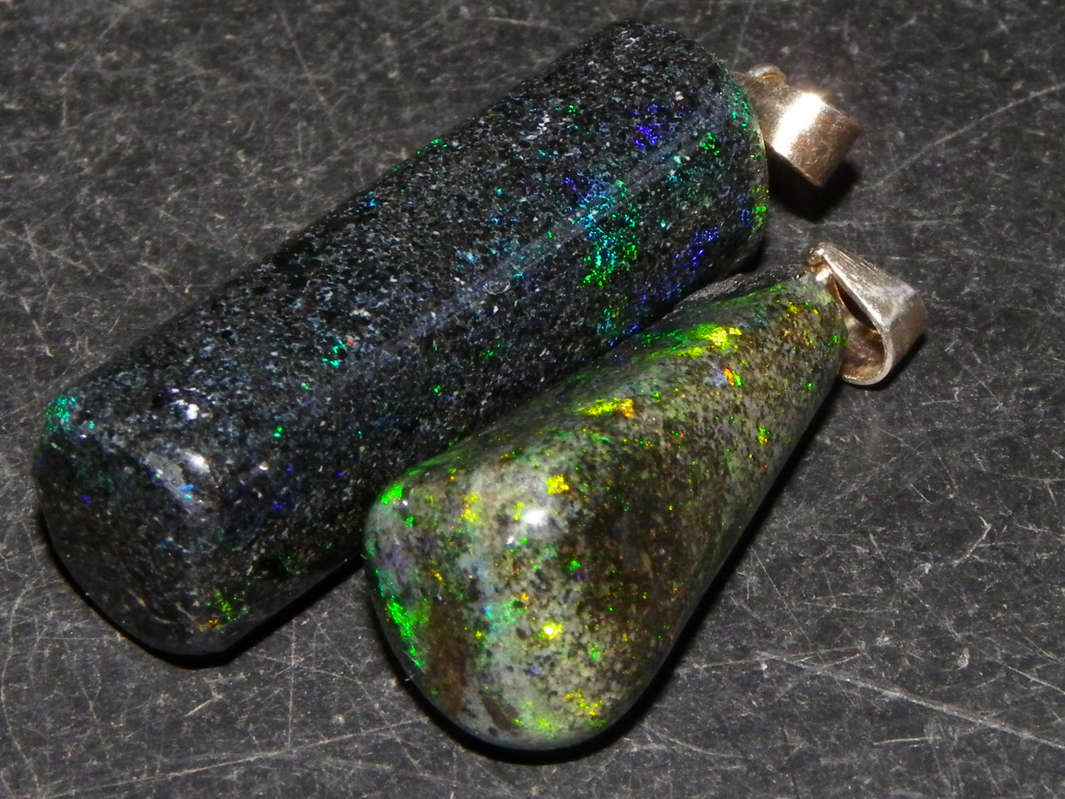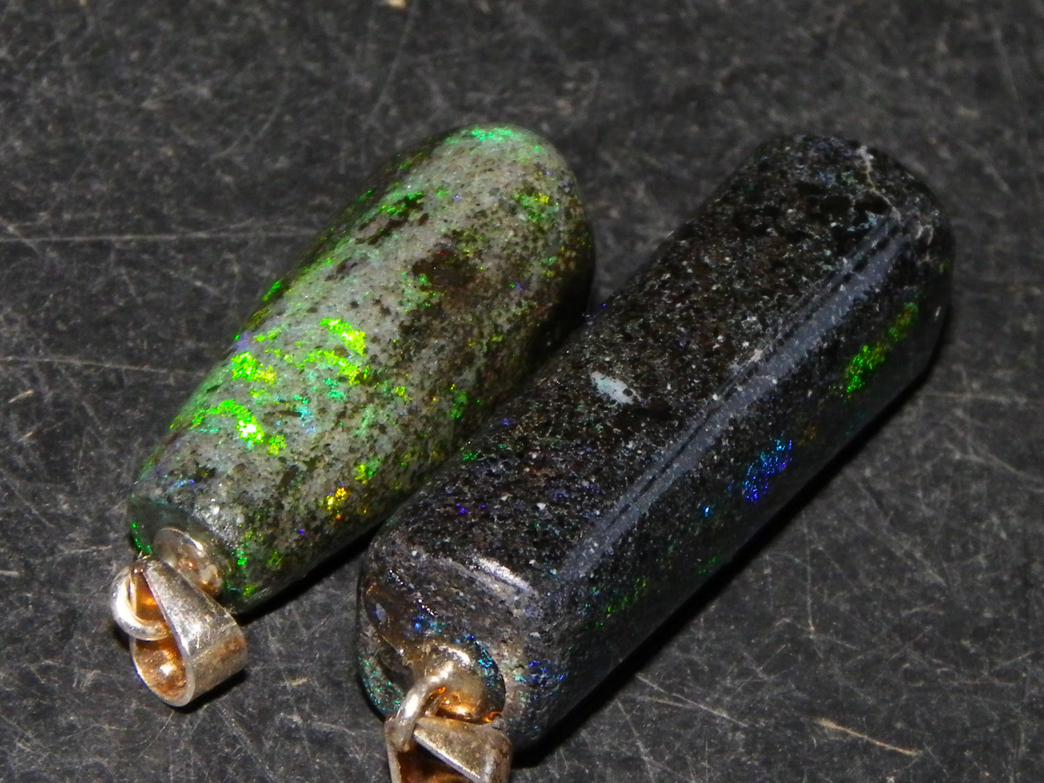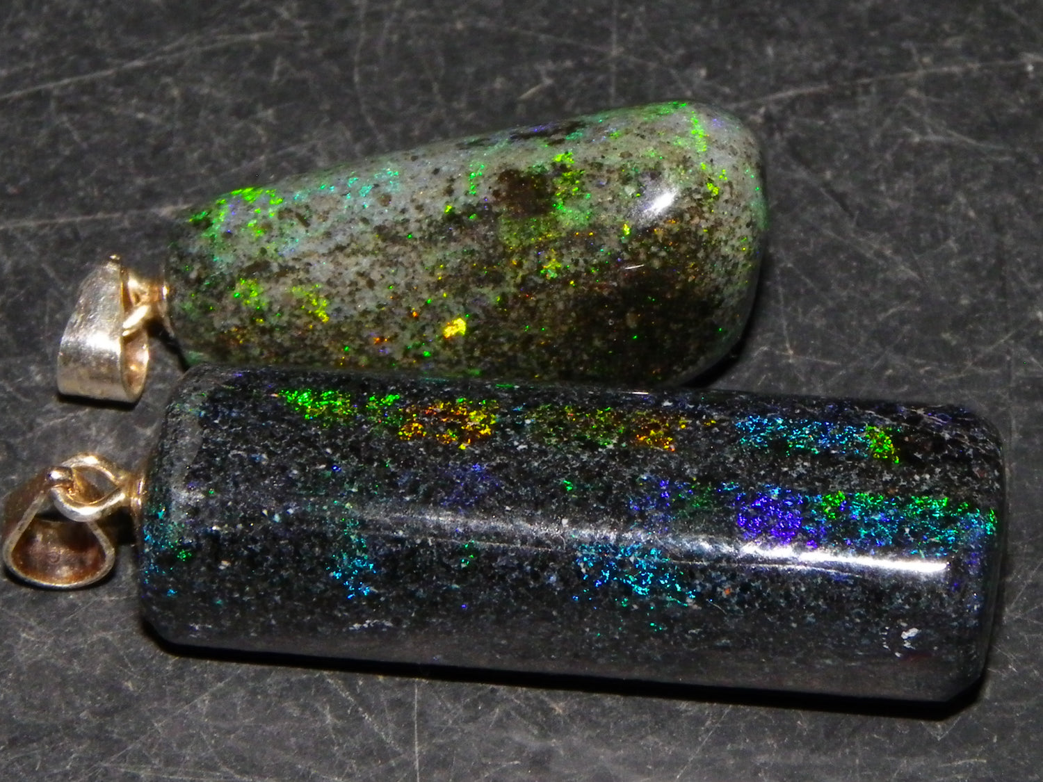 2 Nice Cut/Polished/Treated Andamooka Matrix Opals 31.7cts Silver 925 Pendants Blue/Green Fires