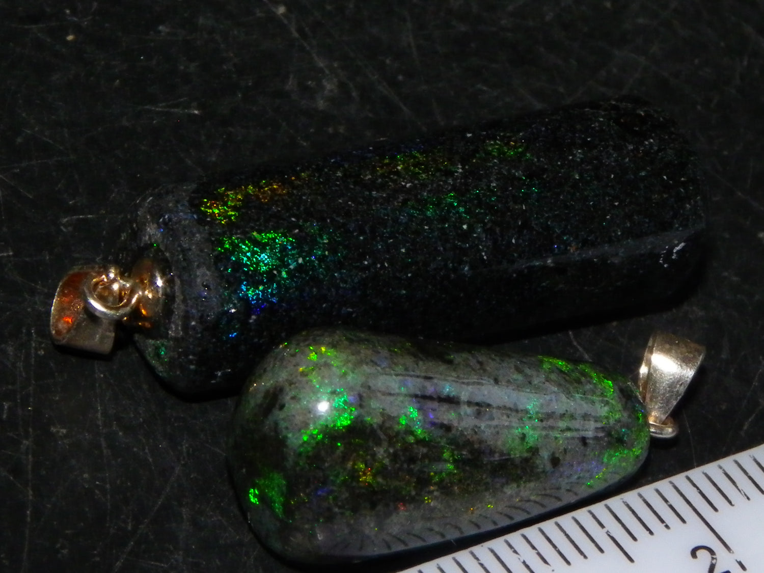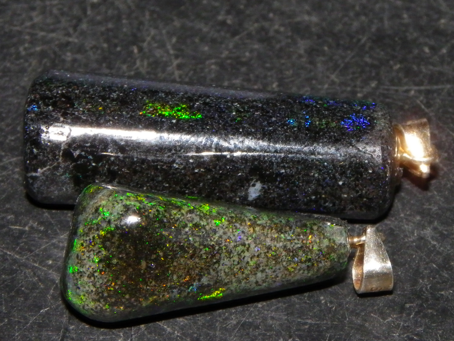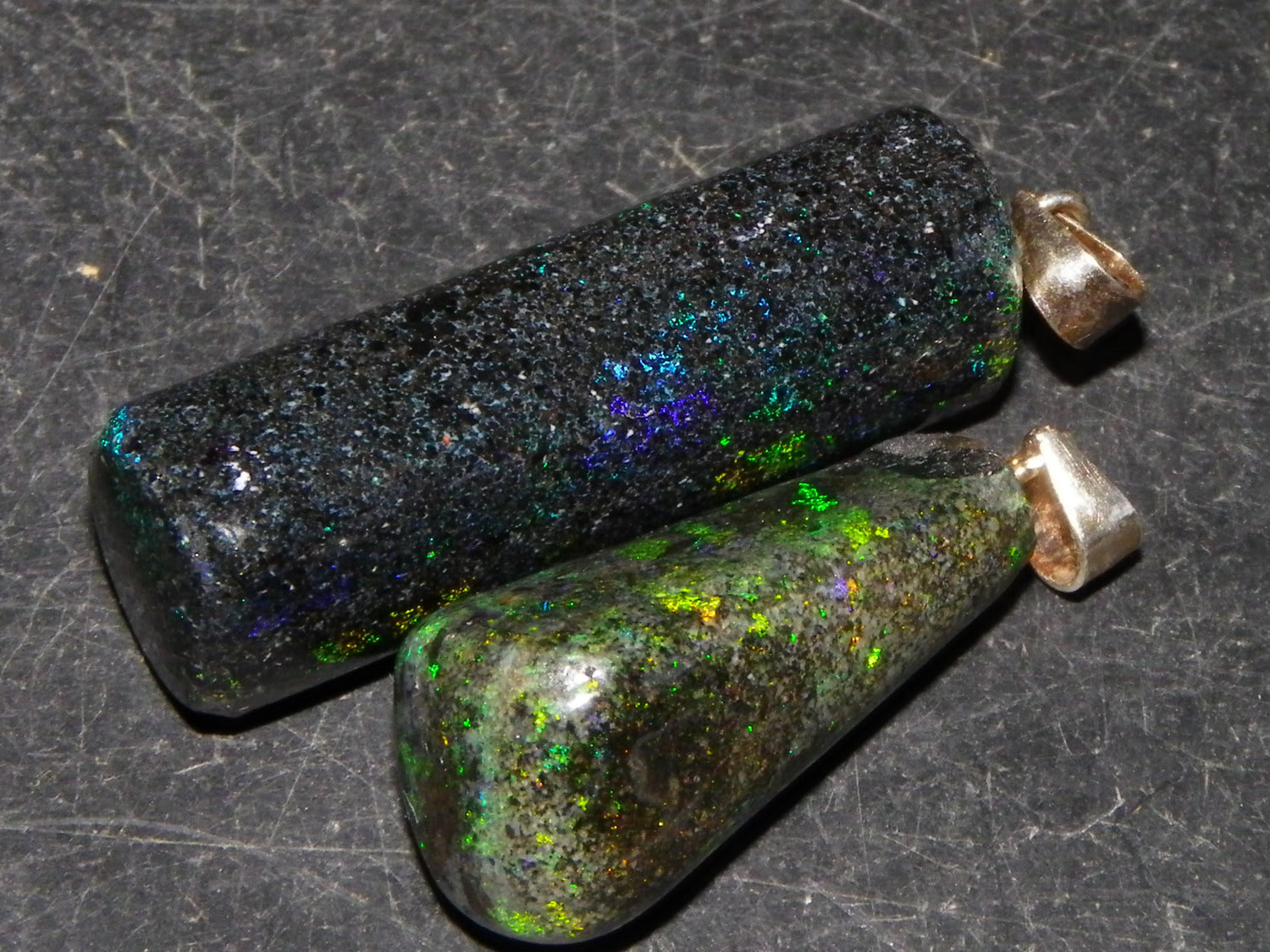 2 Nice Cut/Polished/Treated Andamooka Matrix Opals 31.7cts Silver 925 Pendants Blue/Green Fires