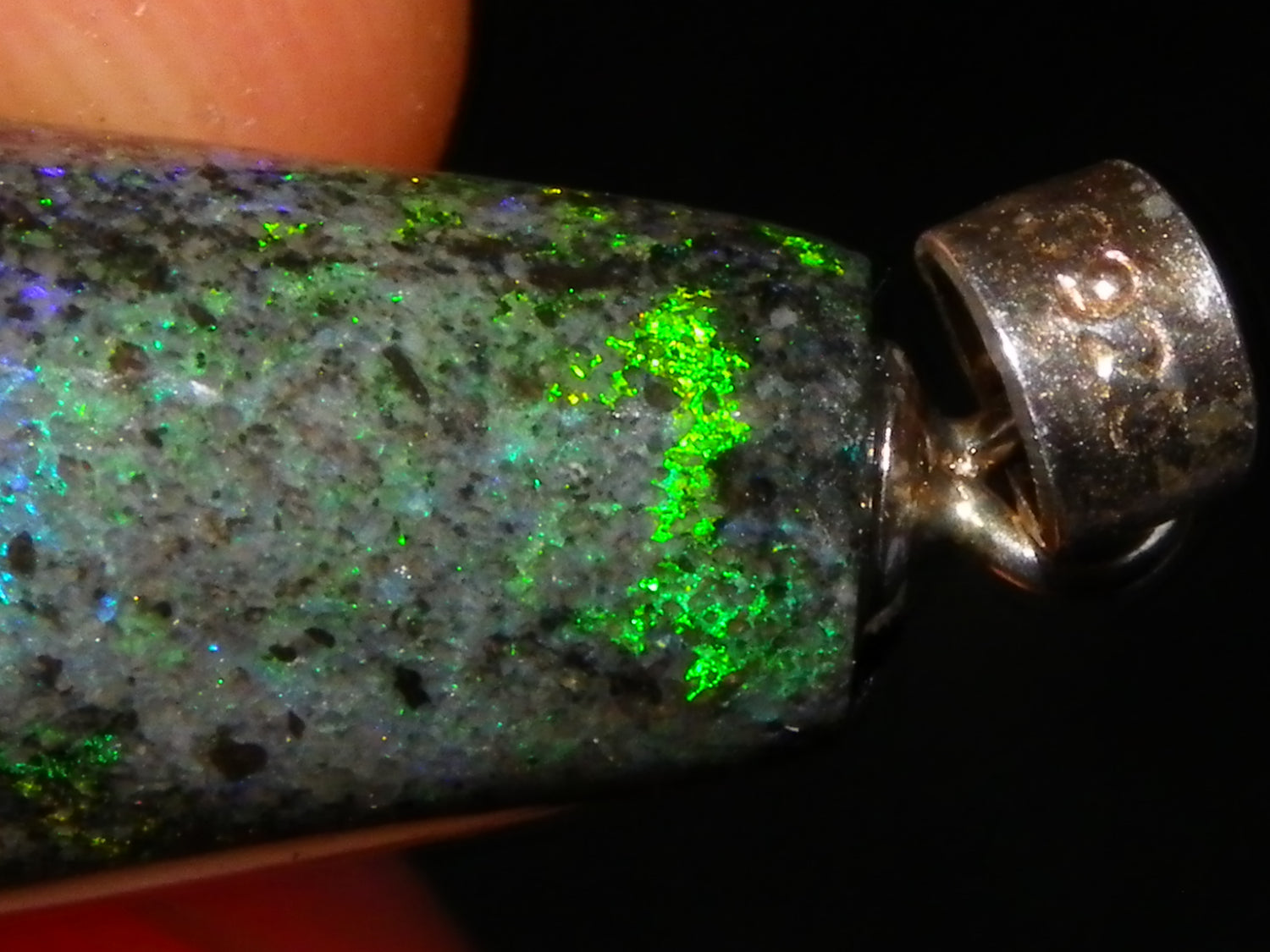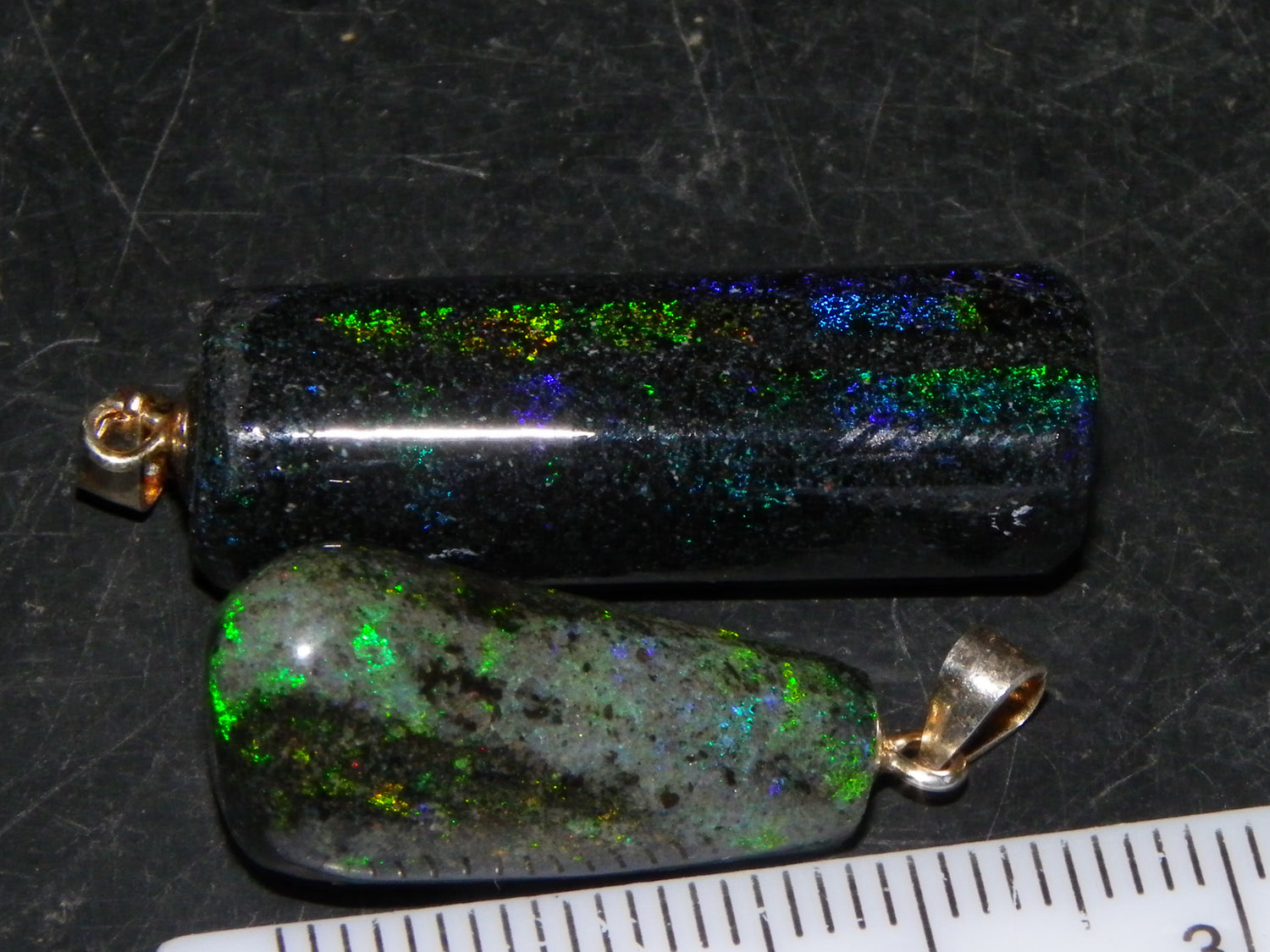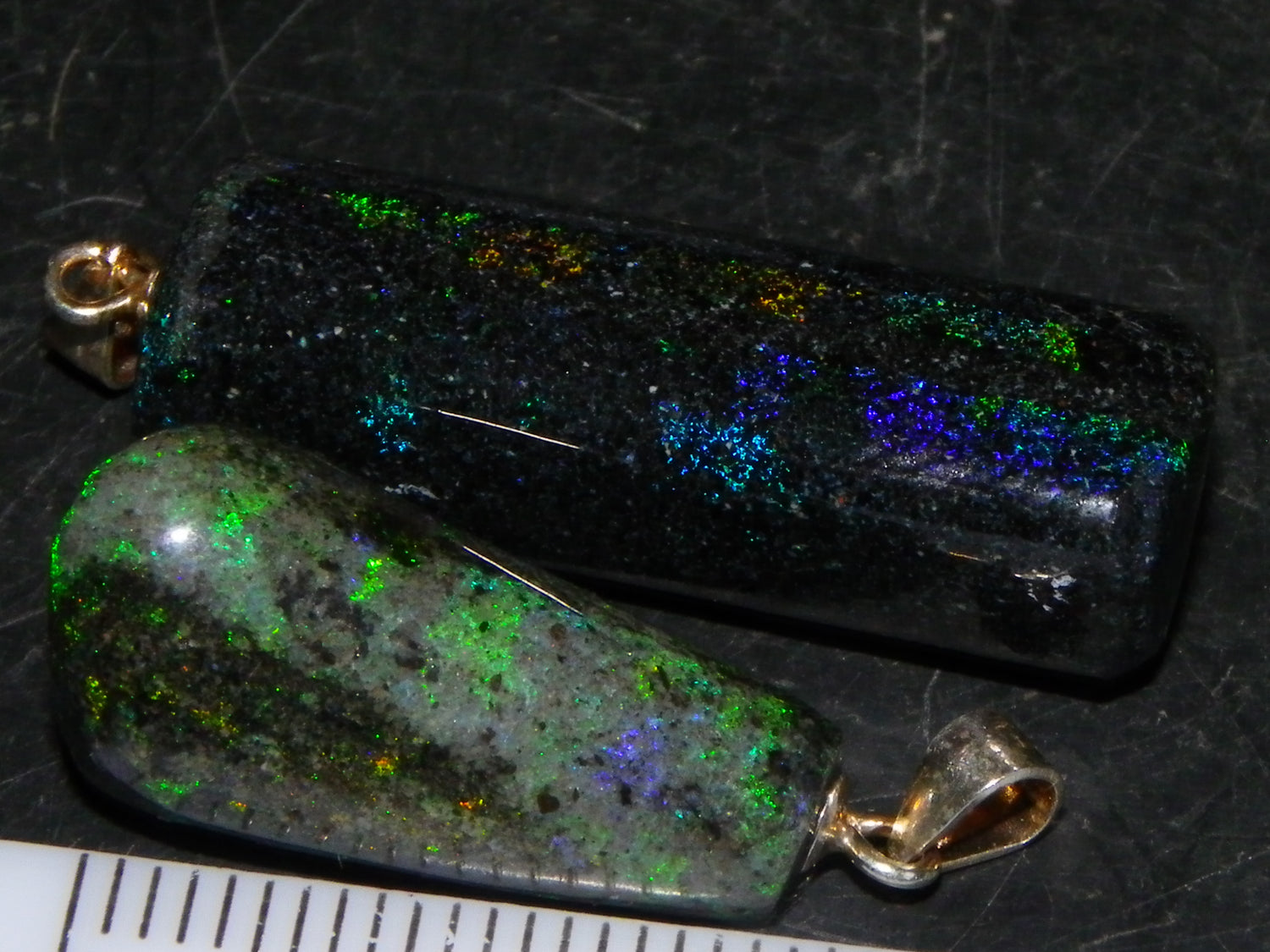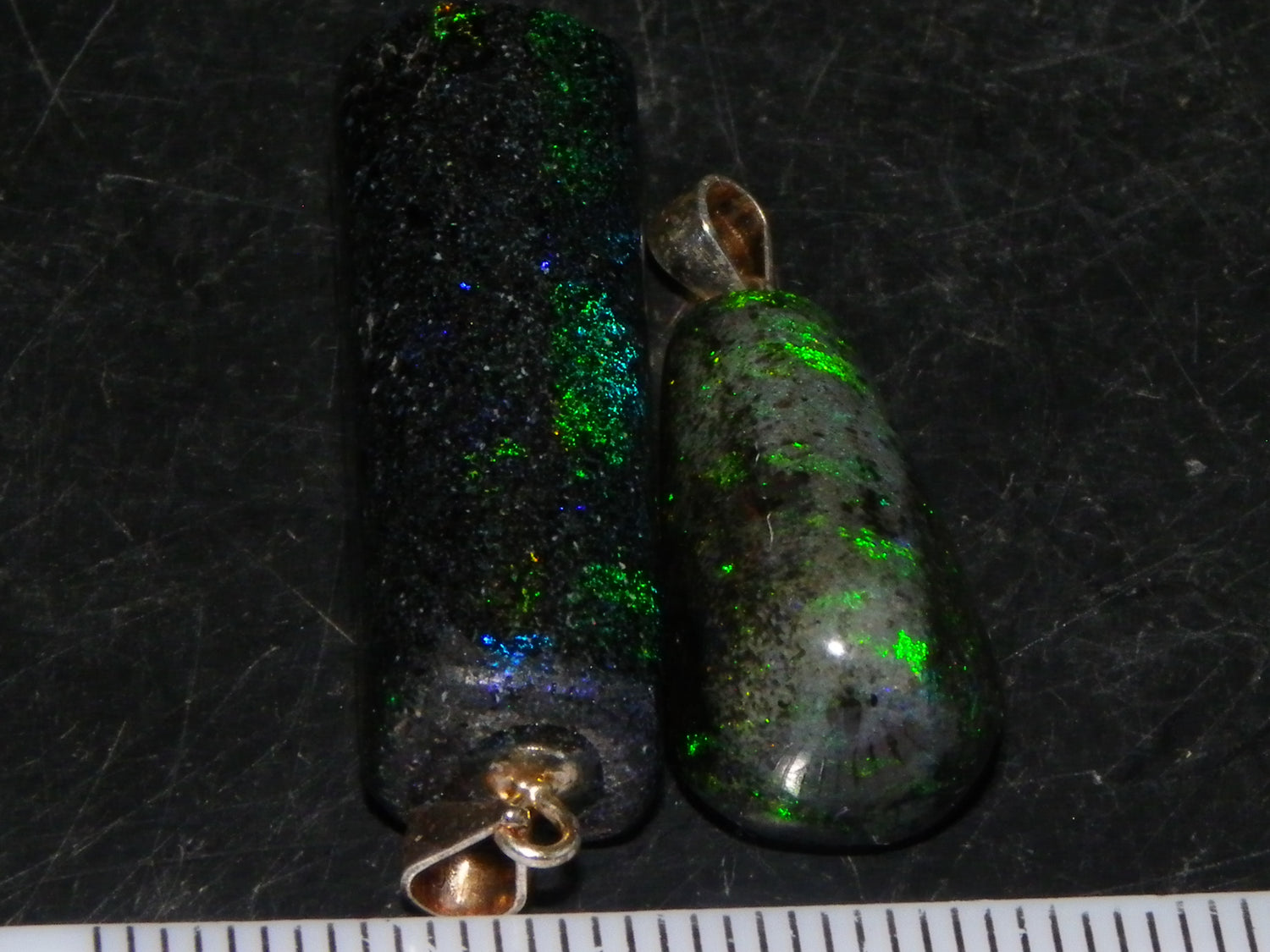 2 Nice Cut/Polished/Treated Andamooka Matrix Opals 31.7cts Silver 925 Pendants Blue/Green Fires