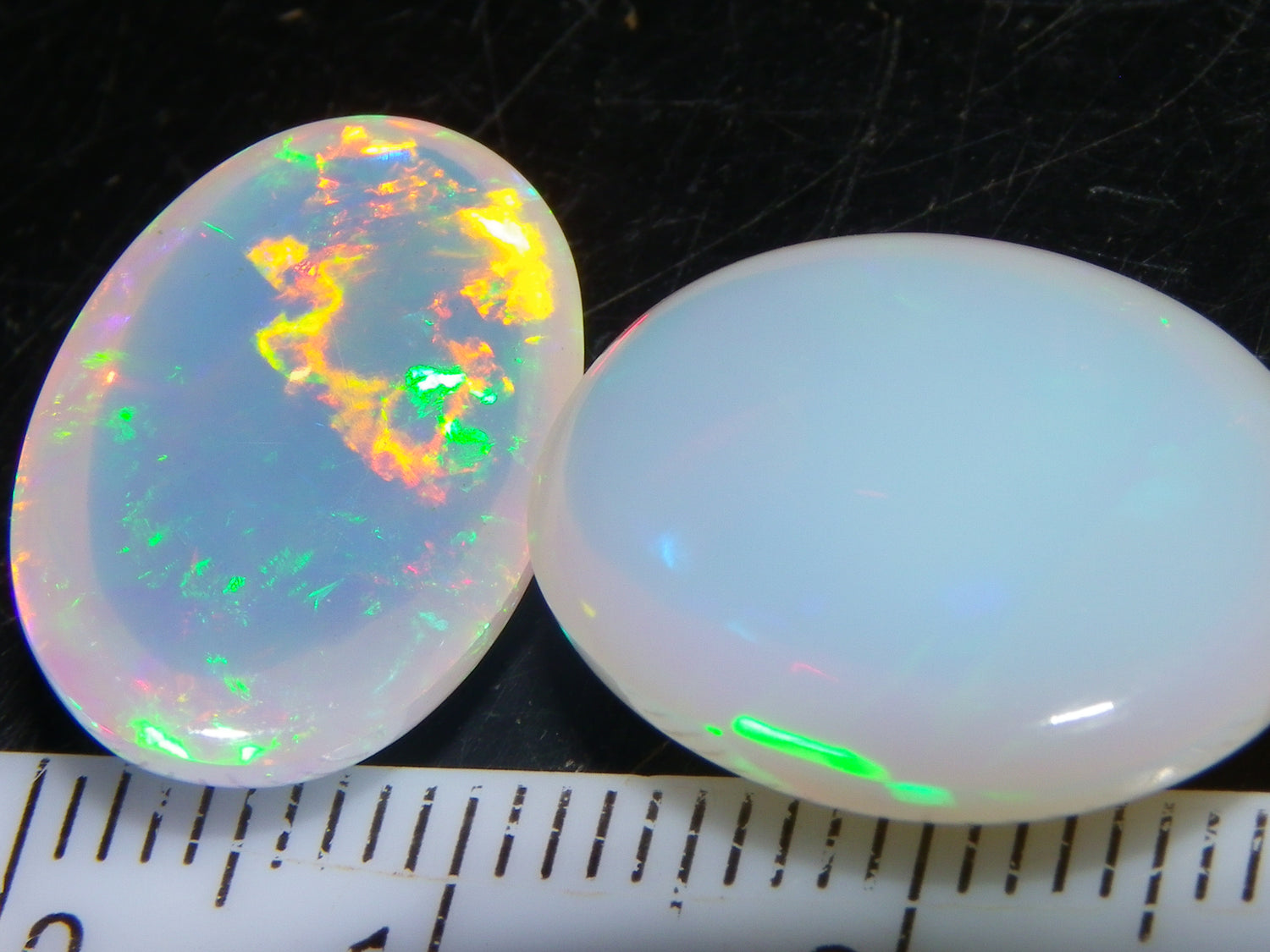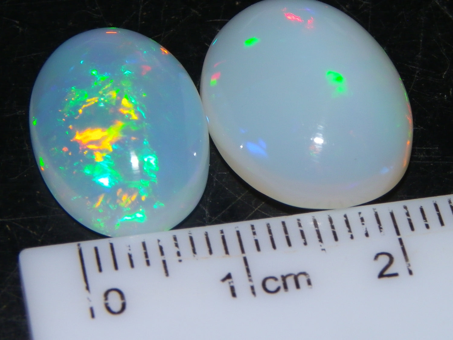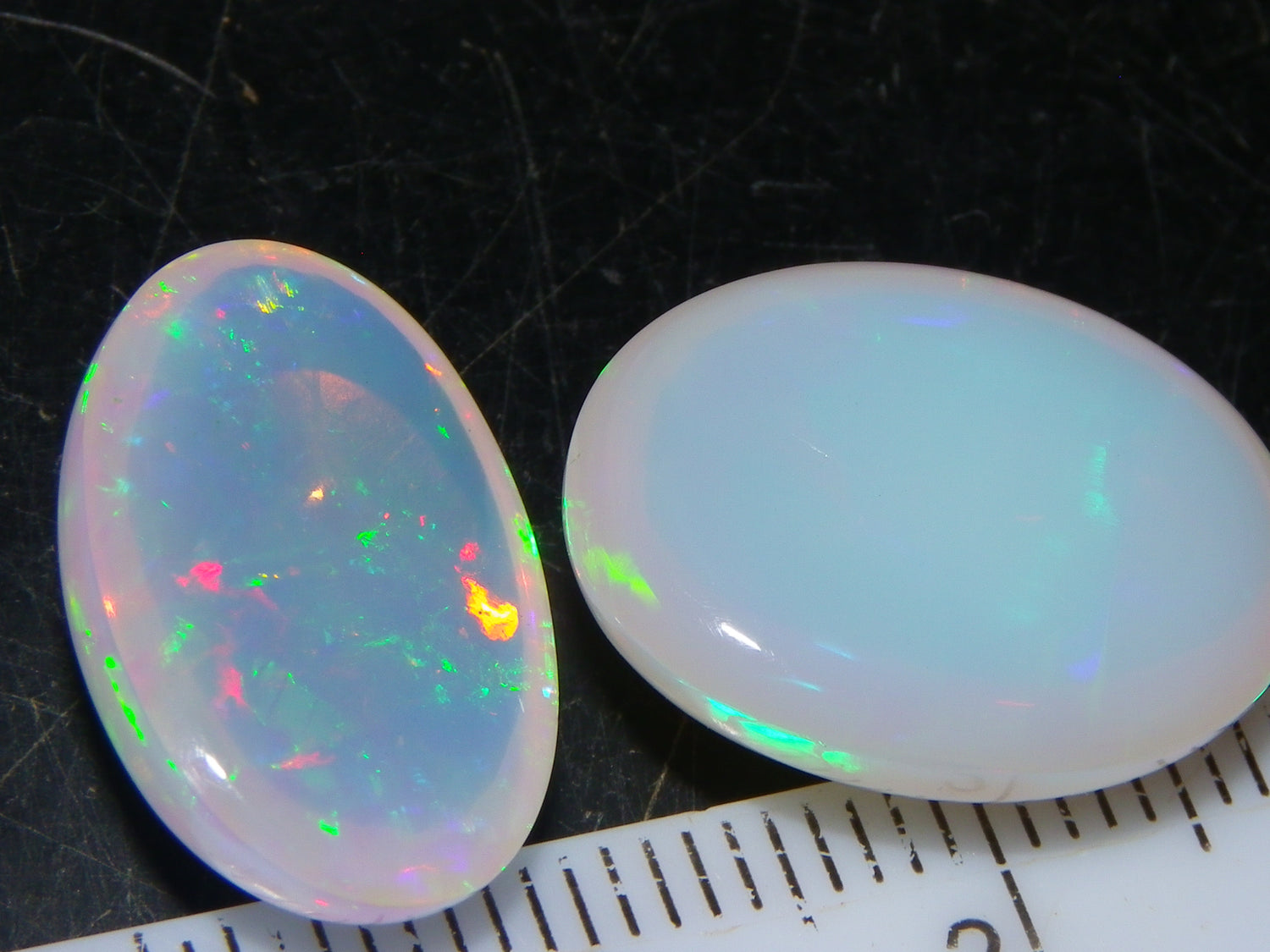 I have for sale a Nice Parcel of 2 Cut/Polished Ethiopia welo Crystal Opals. These weigh 14.19cts in total. 8.09+6.10cts. These are Milky Base Crystal with Fires over them. One has brighter Blue/Greens and some Gold, the other has slightly duller Red/Greens over it. Good sized pieces, ideal for pendants or adding to a collection. Thanks for looking. Always updating more opal on here. Drop me a message if there is something your looking for specifically.