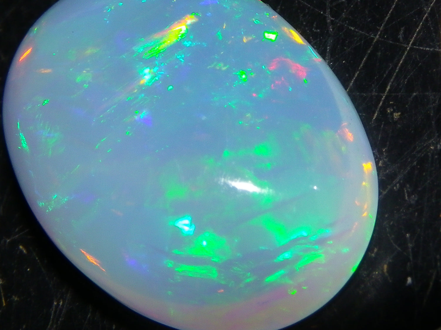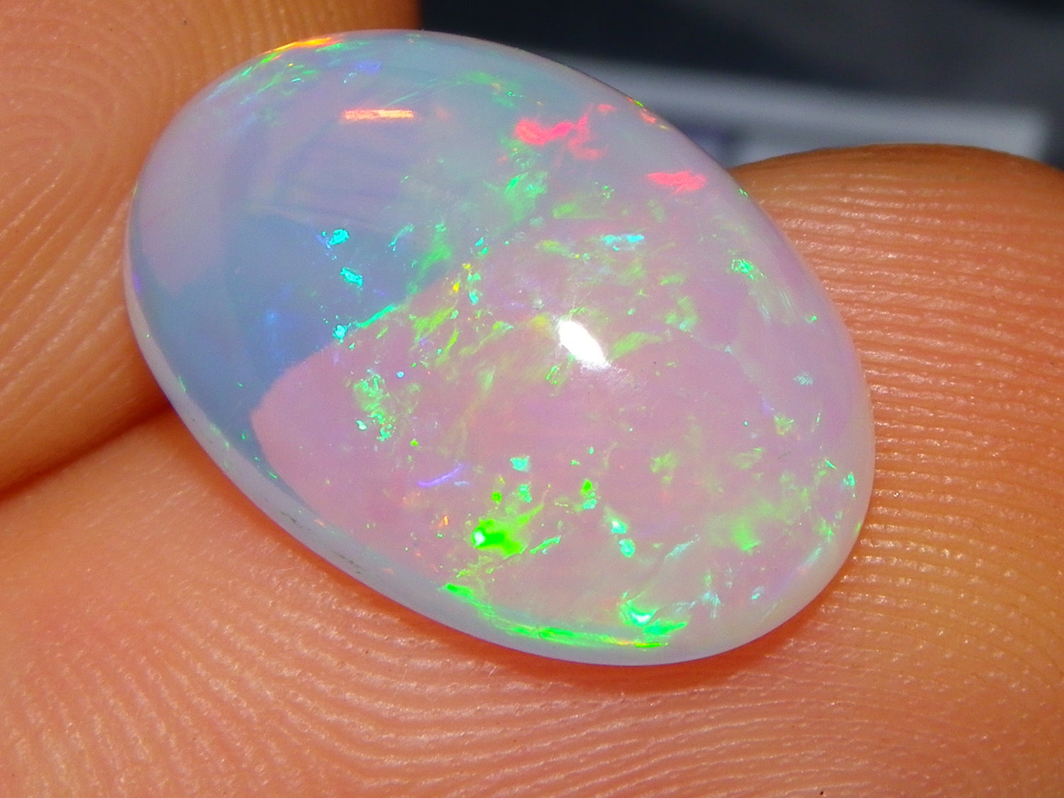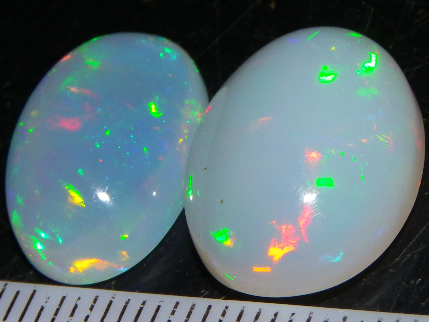 I have for sale a Nice Parcel of 2 Cut/Polished Ethiopia welo Crystal Opals. These weigh 14.19cts in total. 8.09+6.10cts. These are Milky Base Crystal with Fires over them. One has brighter Blue/Greens and some Gold, the other has slightly duller Red/Greens over it. Good sized pieces, ideal for pendants or adding to a collection. Thanks for looking. Always updating more opal on here. Drop me a message if there is something your looking for specifically.