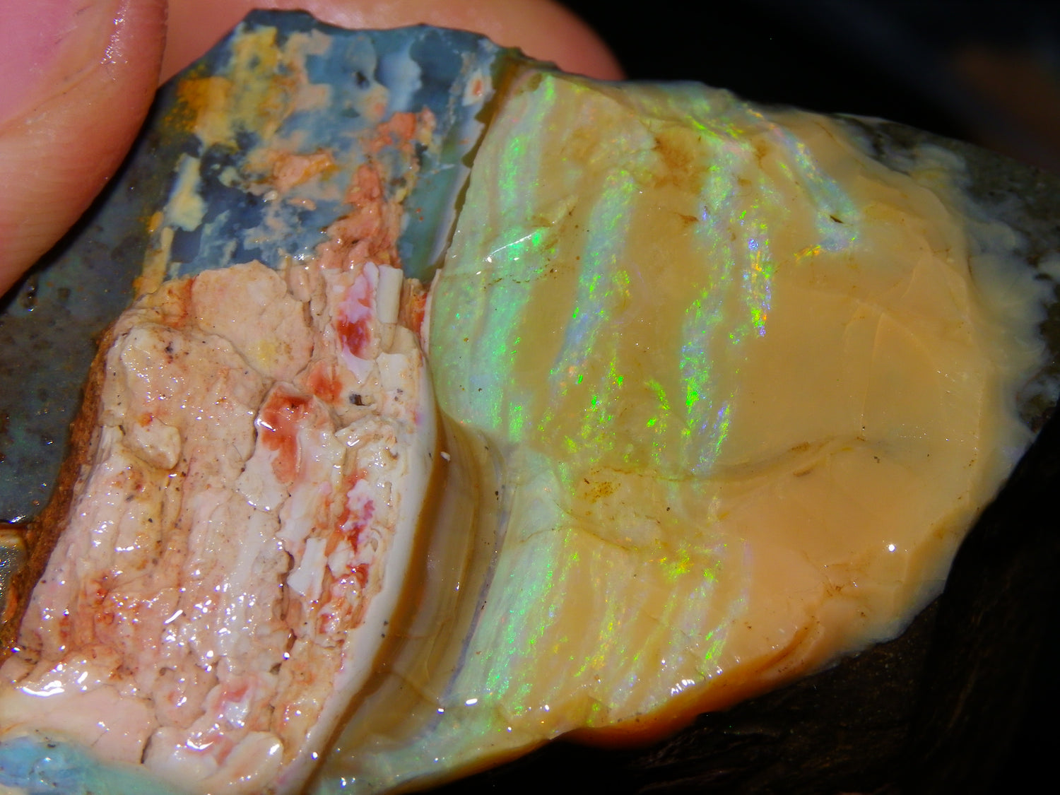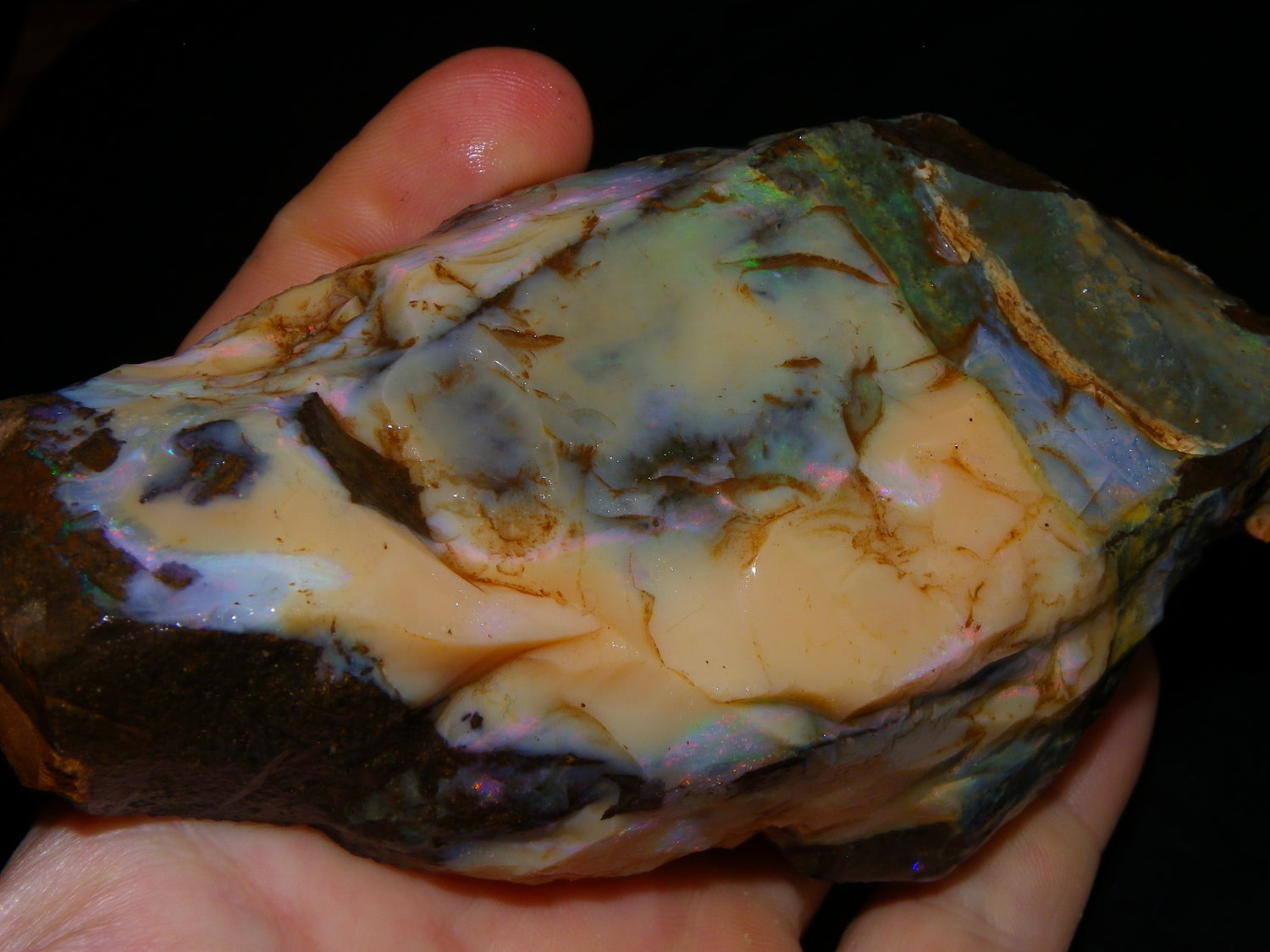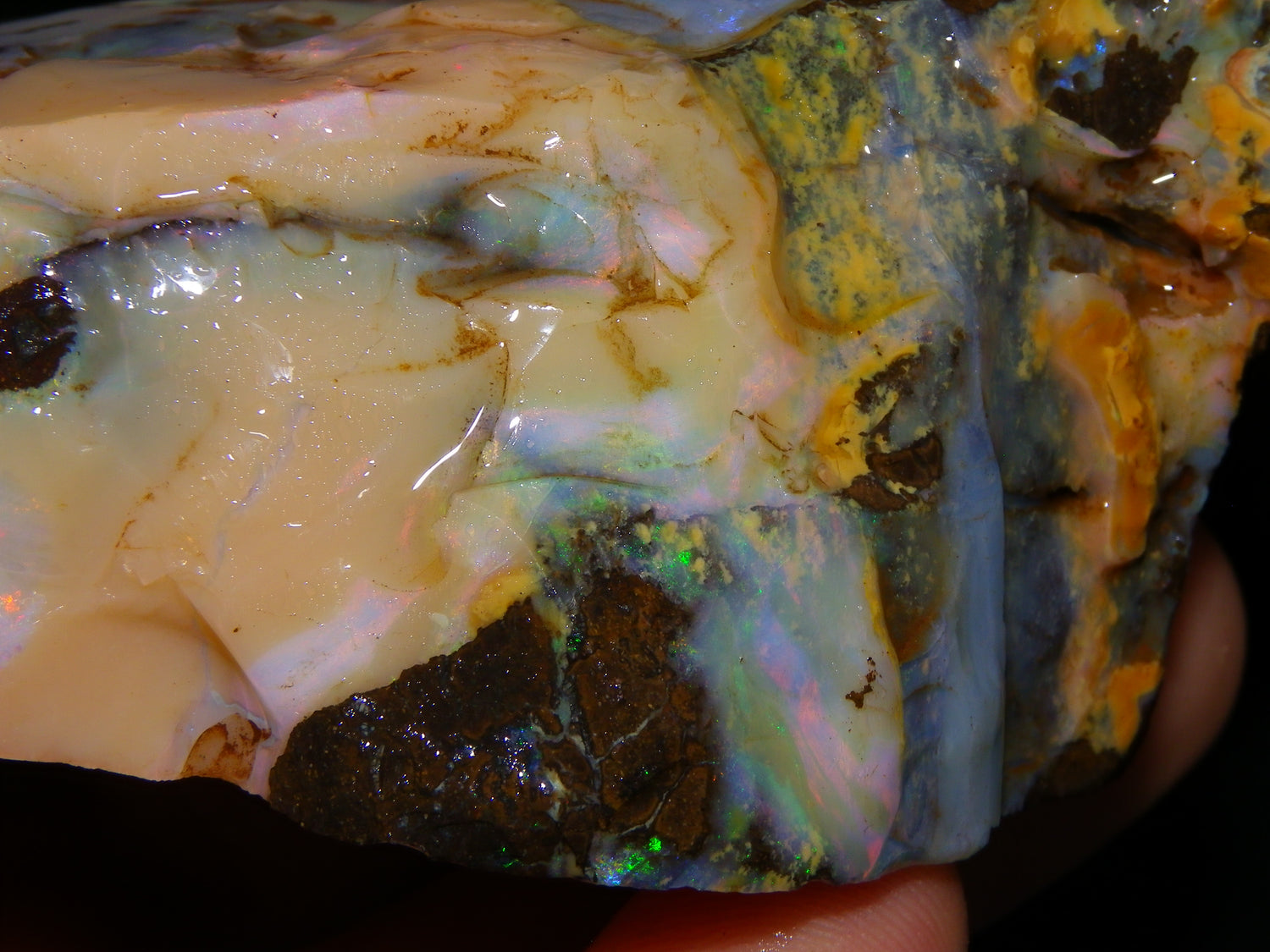 I have for sale 2 large Rough Boulder Opal specimens from Queensland Australia. These 2 weigh 2704cts in total. Ironstone base with some Crystal/White Opal/Caramel potch across the top faces. The smaller piece has 2 faces with some Green Bars mixed into the caramel potch. The larger one has slight Greens/Pinks and some small veins in the back. Great large specimens, or see if they cut. I would leave them as they are in this case. Thanks for looking.