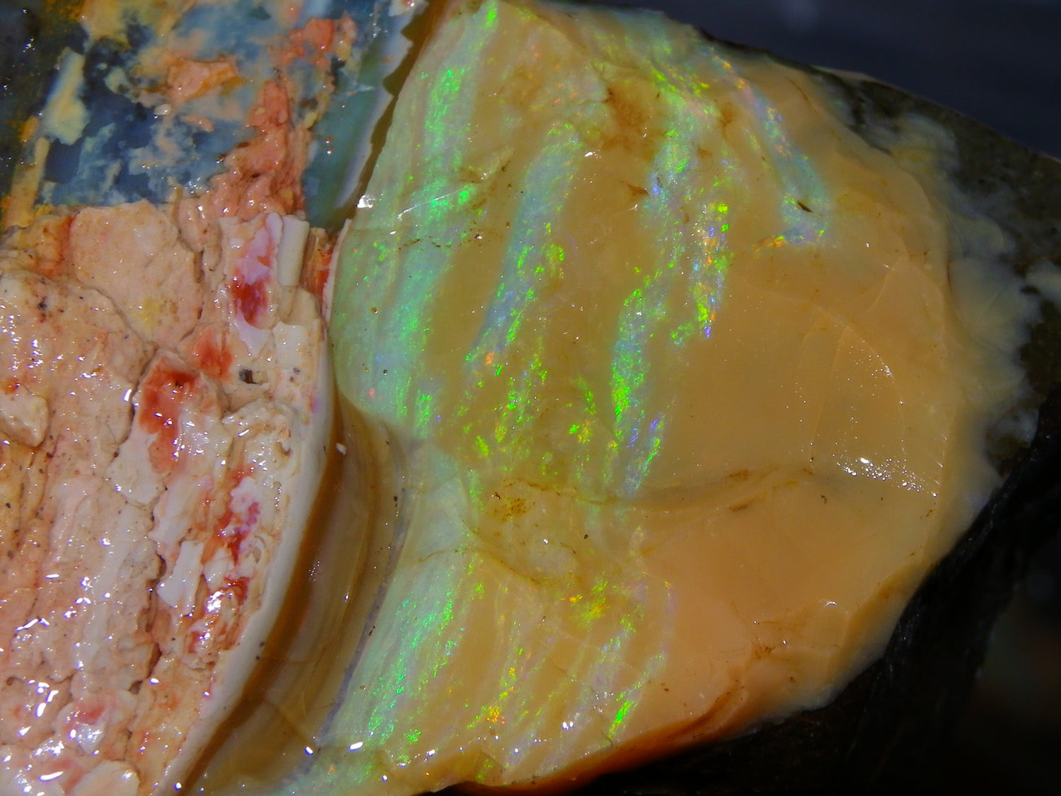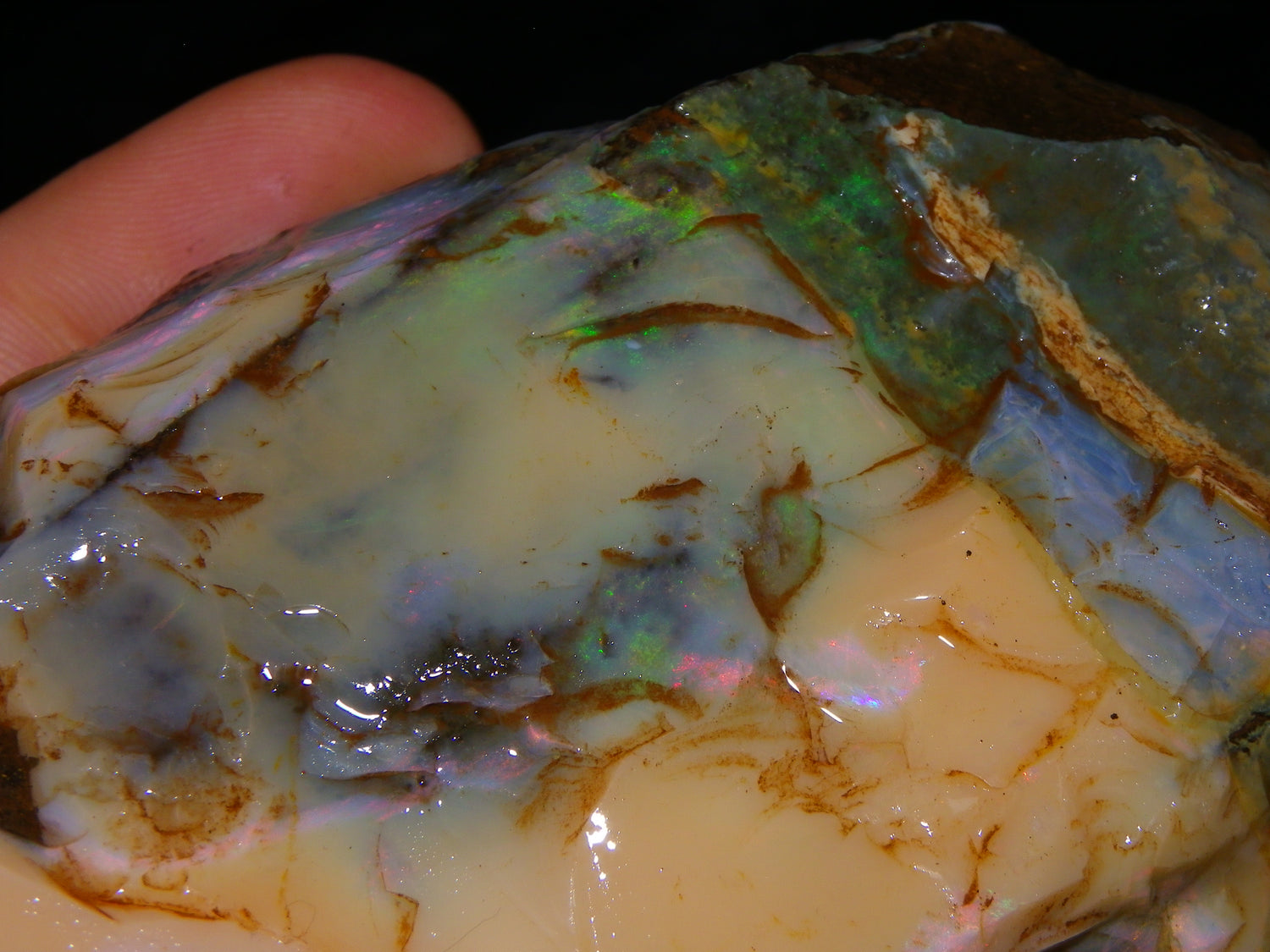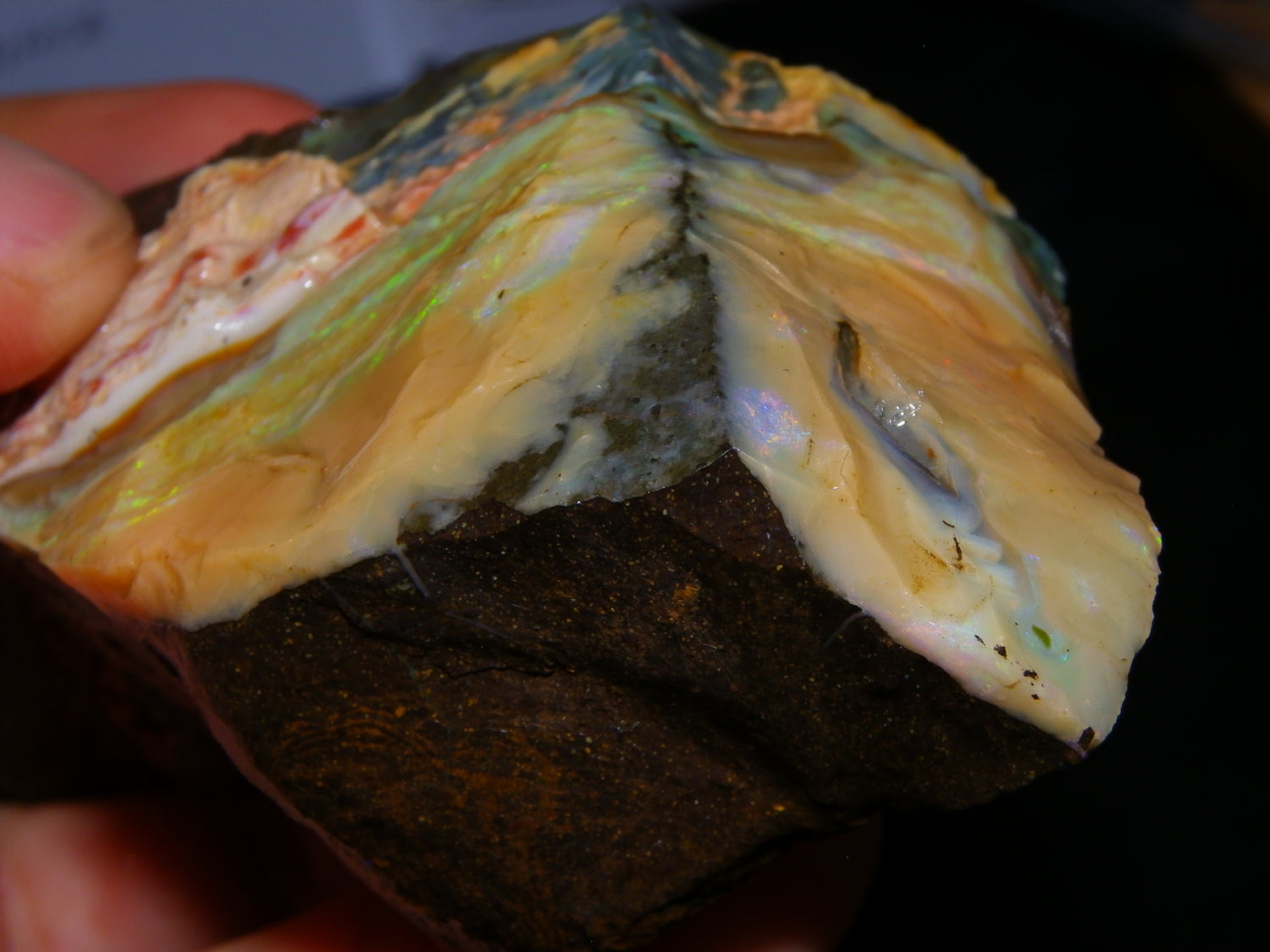 I have for sale 2 large Rough Boulder Opal specimens from Queensland Australia. These 2 weigh 2704cts in total. Ironstone base with some Crystal/White Opal/Caramel potch across the top faces. The smaller piece has 2 faces with some Green Bars mixed into the caramel potch. The larger one has slight Greens/Pinks and some small veins in the back. Great large specimens, or see if they cut. I would leave them as they are in this case. Thanks for looking.