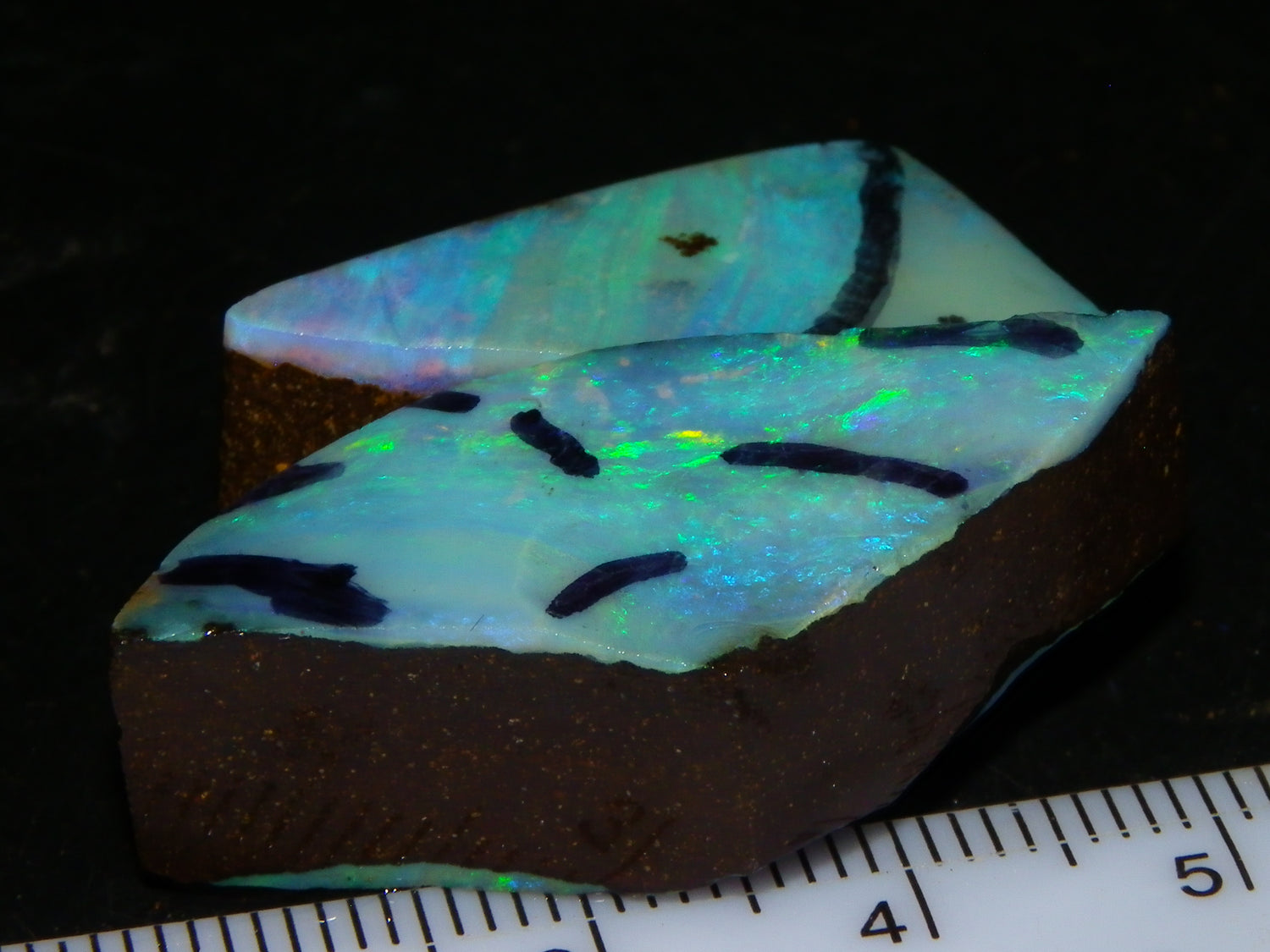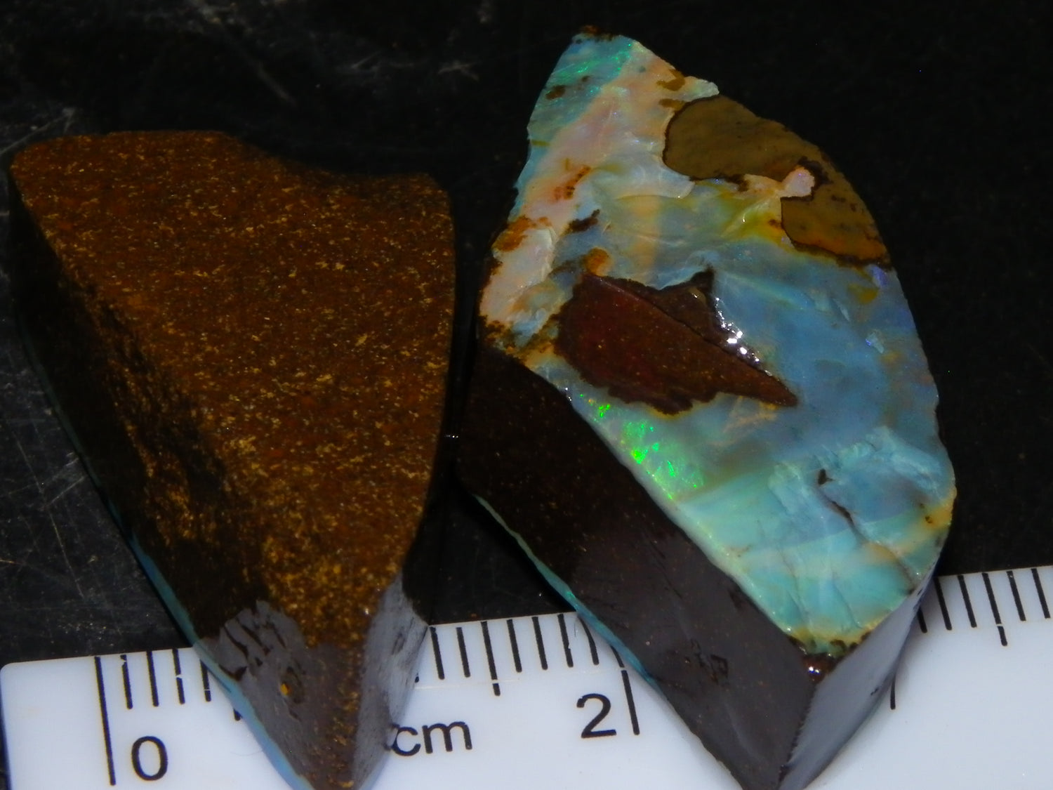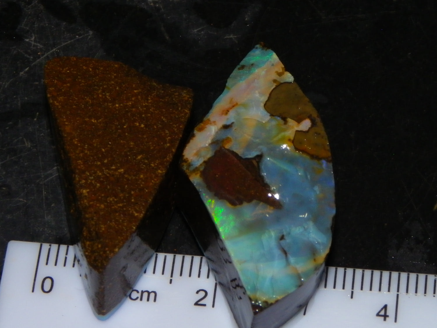 I have for sale a Nice Split Boulder Opal rub parcel. These 2 weigh 90.5cts in total. They are Crystal/Milky Opal with Blues/Greens sat on Ironstones. One has stripy pattern and some potch at one end. The other has brighter fires through the middle section. Pen lines will all come off. Used to mark up for slicing, also finding any surface scratches too. They will clean up and make lovely Pendants or similar. Thanks for looking..