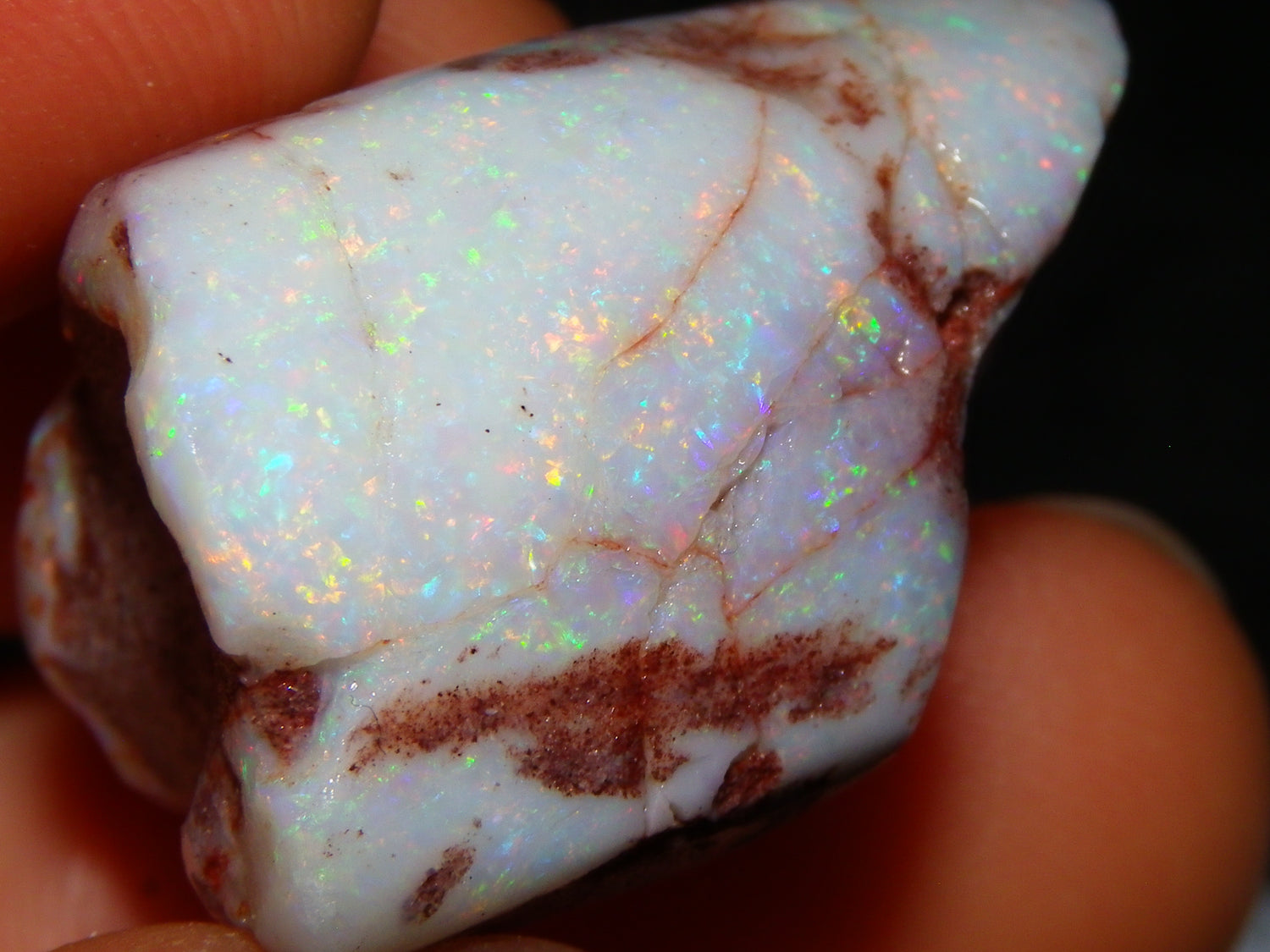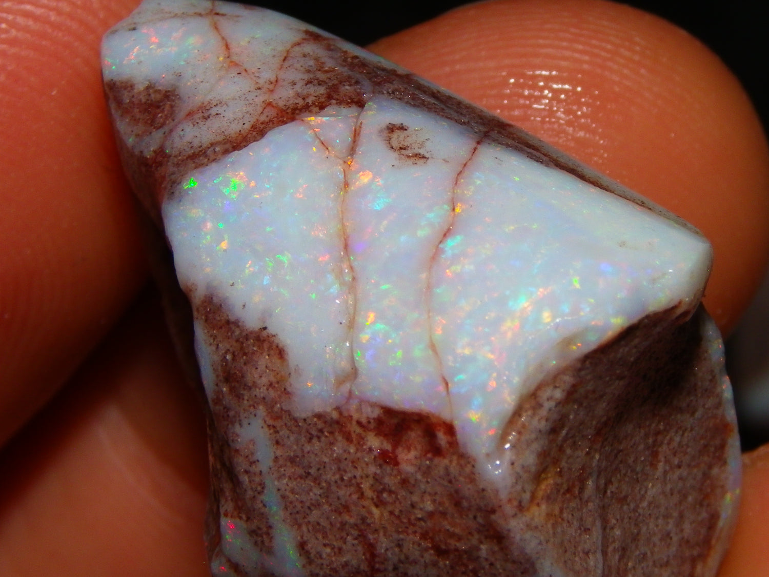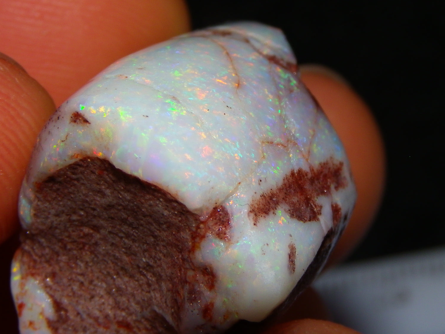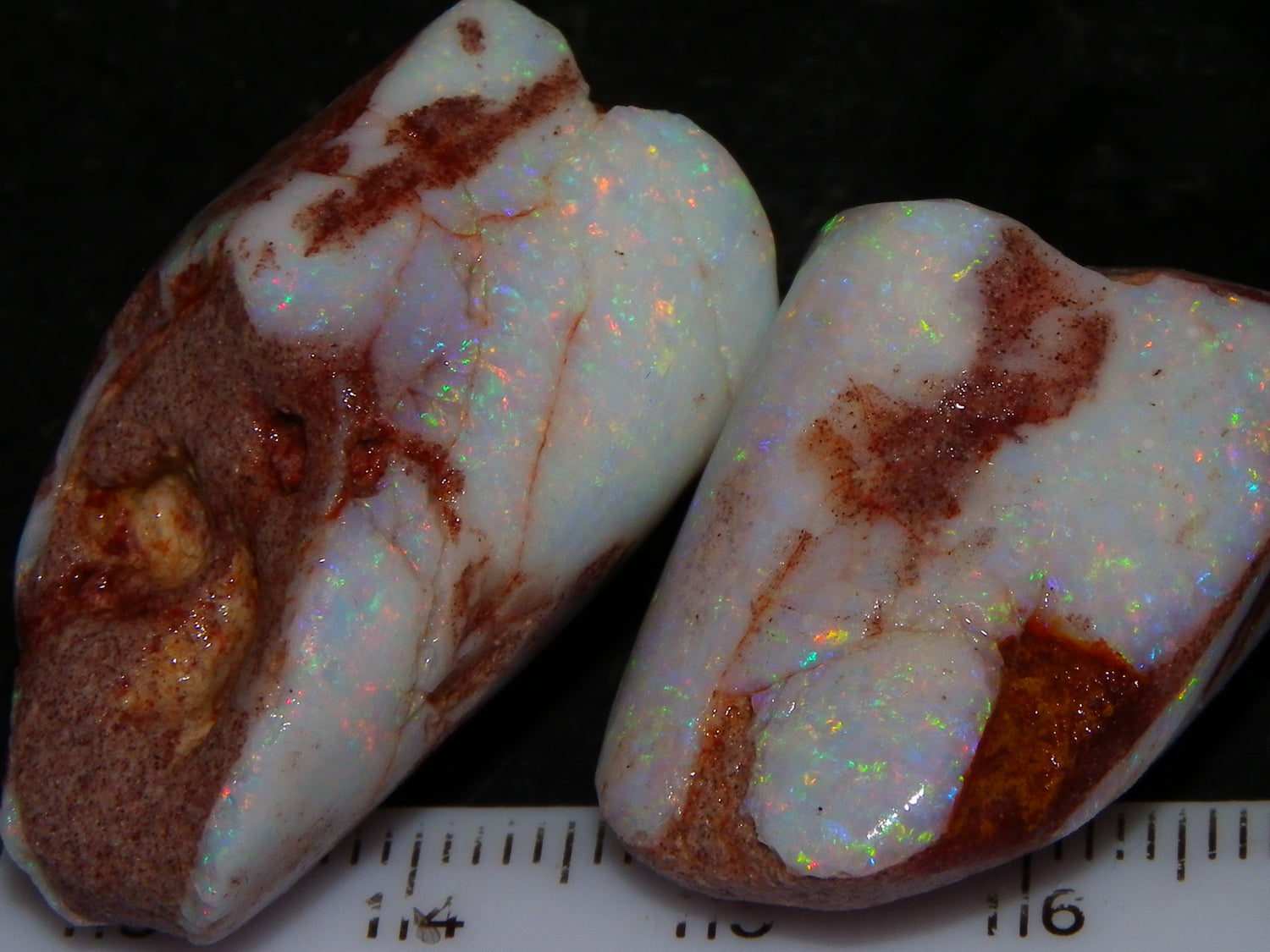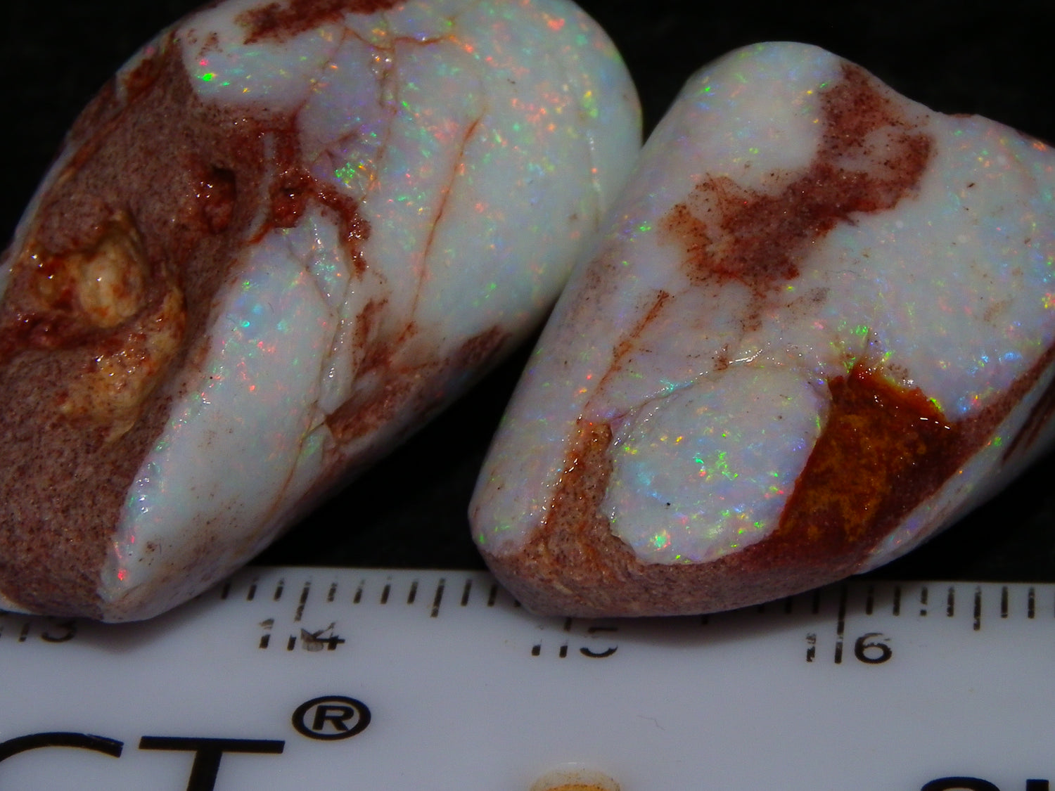 I have for sale a Nice Pair of Rubbed/Rough Mussell Shell Specimen Opals from Coober Pedy Australia. These 2 weigh 91cts in total. They are both Half Shells, Not from the same shell. They have Multicolour Fires through the White/Milky Base Opal, also some Slight Sand, and a few natural cazes aswell. Each has got sand through the core of the piece. These are not Solid Opals. Superb Specimen pieces, polish them up for Cabinet specimens. You dont often get them with ires all through the Opal.. Thanks for looking,.,.,.