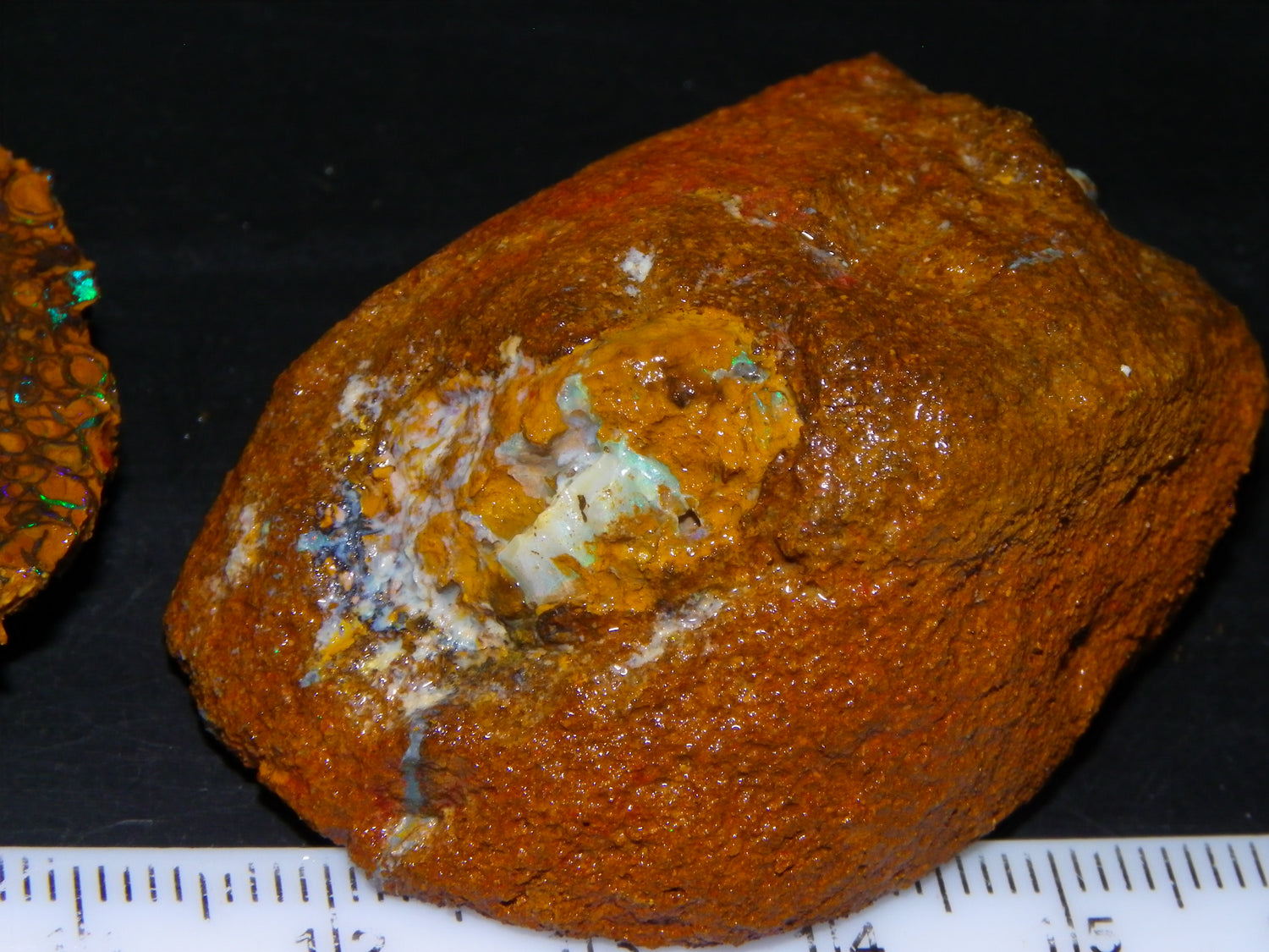I have for sale 2 Nice Rough/Sliced Koroit Opals from Queensland Australia. These weigh 437.8cts in total. Ironstone base material with Patterns through them and Fires mixed into them aswell. One is a Double sided Slice, Concentric Rings with Patterns throughout. Thinner piece, second is the end/half of a Chunk Nut sat in a skin. it has patterns, some Green Fires and there is also colour poking out the skin aswell. Should clean up well once worked on. Thanks for looking,.,.,.