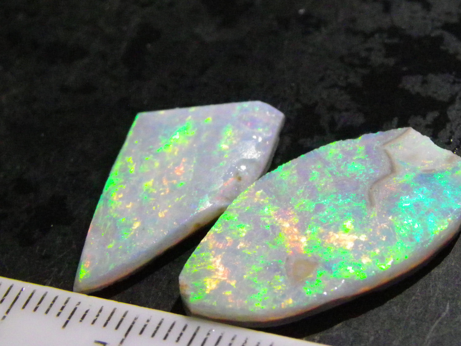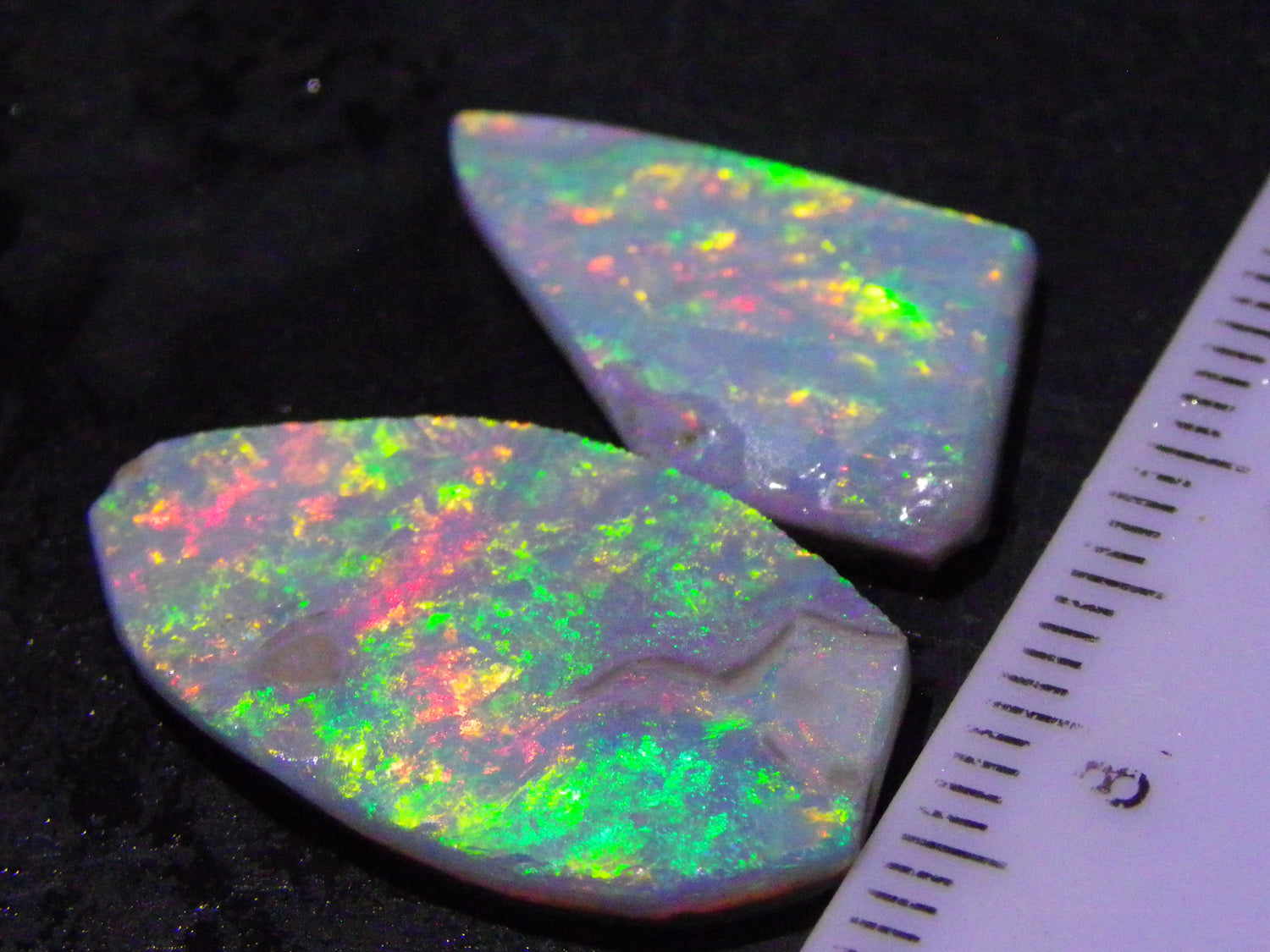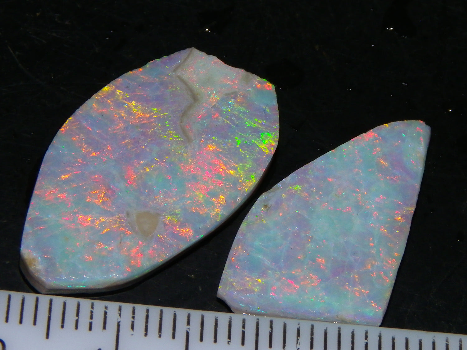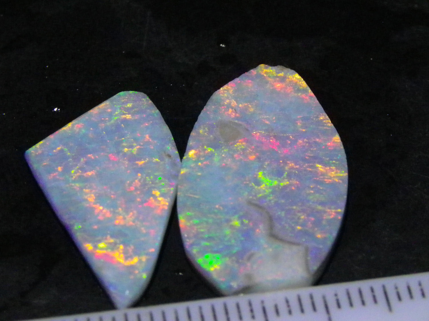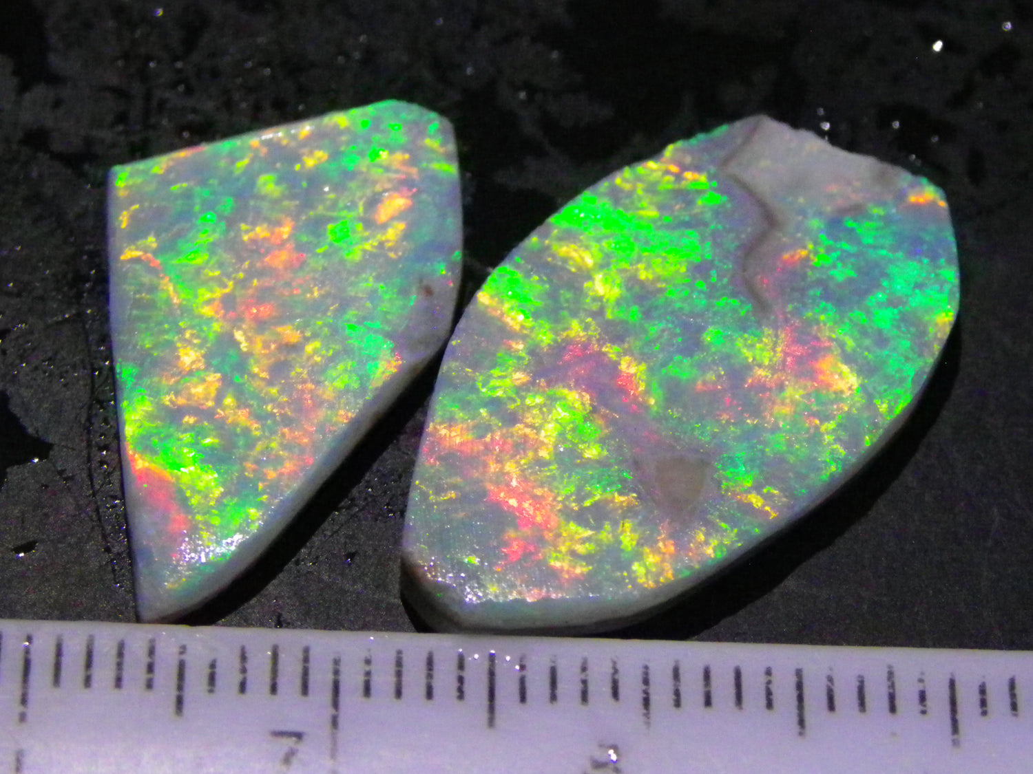 I have for sale a Nice Pair of Seam Opal Rubs from Mintabie, Australia. These weigh 11.12cts bewteen them. They are both from the same pocket, Very Bright Red/Orange and Gold/Green Fires over and through these. one with a wiggly potch line at one end. They will polish up very Bright Doublets, or make Pendant stones backed by Silver i would think,.,. Do not see this brightness often, and Mintabie material is getting much harder to get. Great material, make some special jewelery or add to a collection,.,.,. Thanks for looking,.,.,.