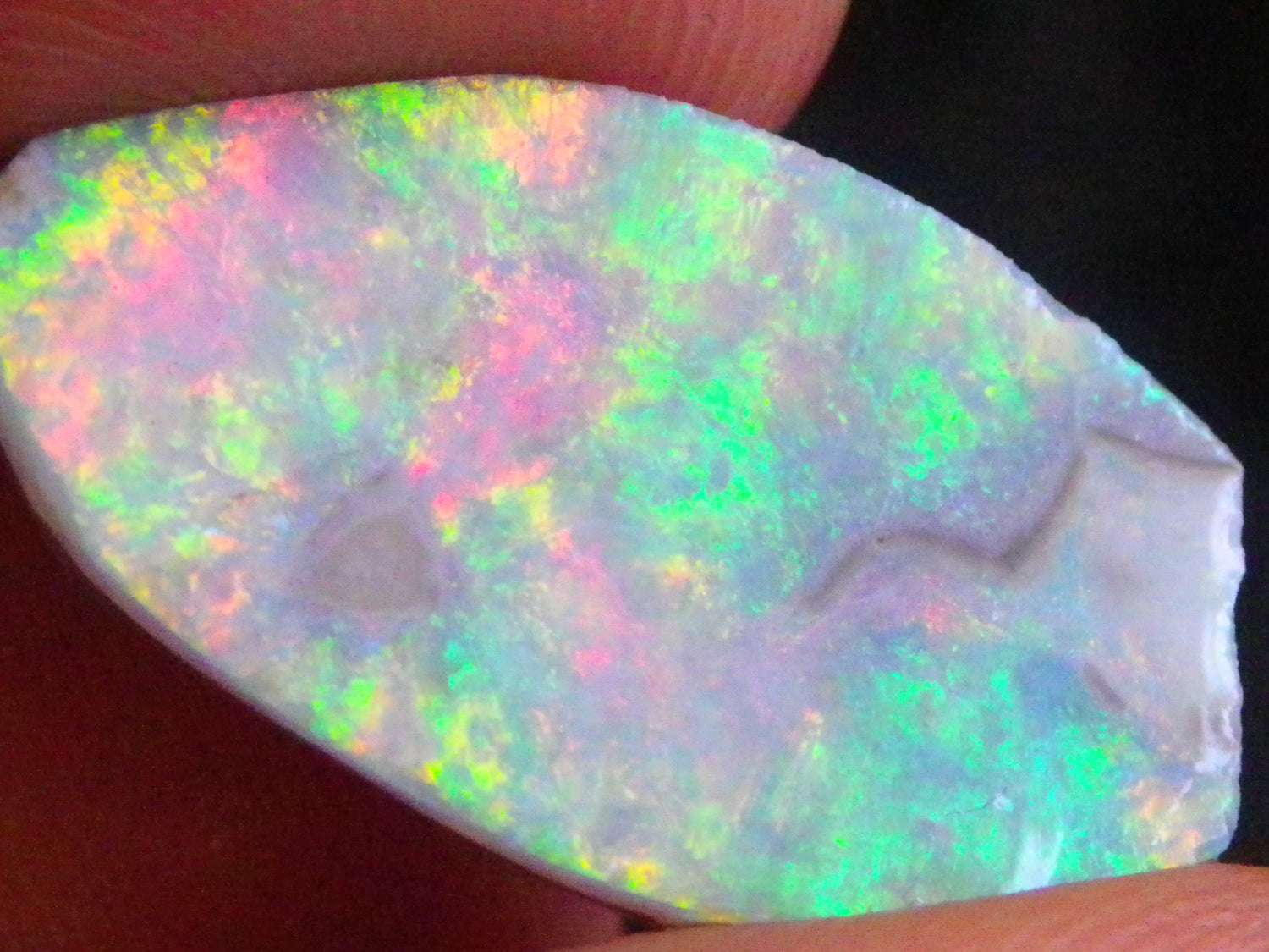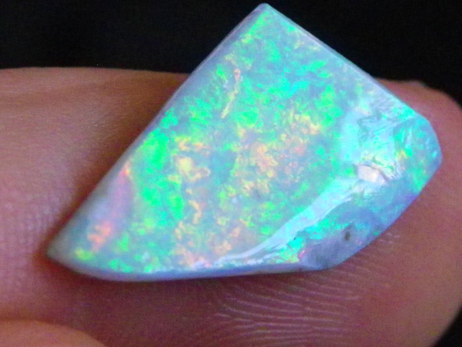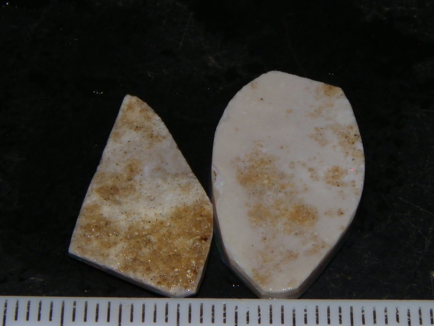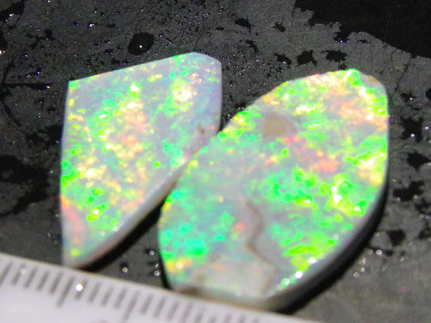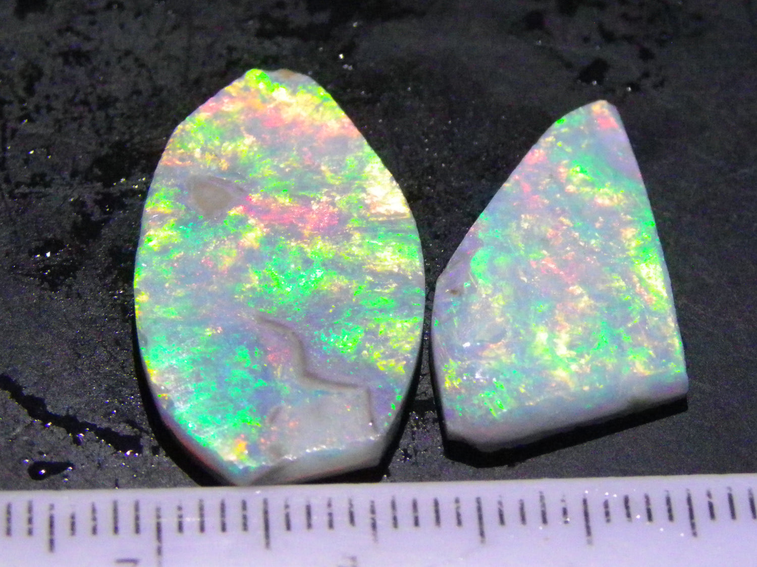 I have for sale a Nice Pair of Seam Opal Rubs from Mintabie, Australia. These weigh 11.12cts bewteen them. They are both from the same pocket, Very Bright Red/Orange and Gold/Green Fires over and through these. one with a wiggly potch line at one end. They will polish up very Bright Doublets, or make Pendant stones backed by Silver i would think,.,. Do not see this brightness often, and Mintabie material is getting much harder to get. Great material, make some special jewelery or add to a collection,.,.,. Thanks for looking,.,.,.