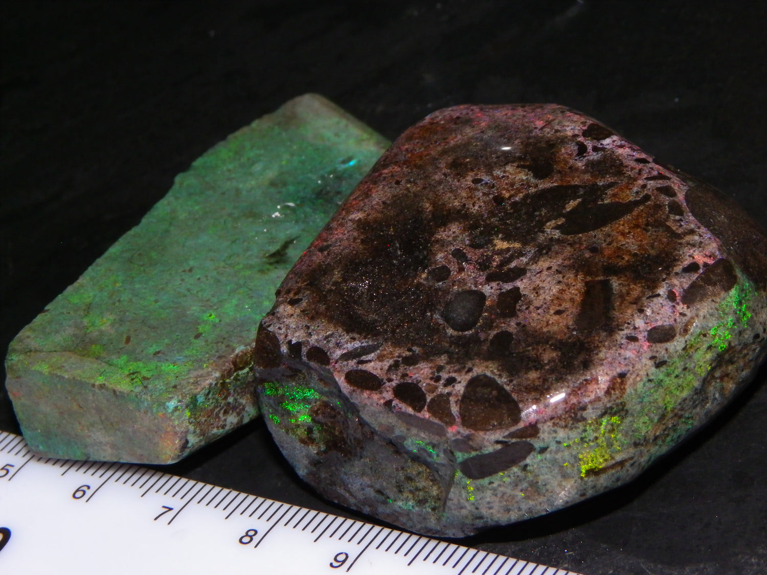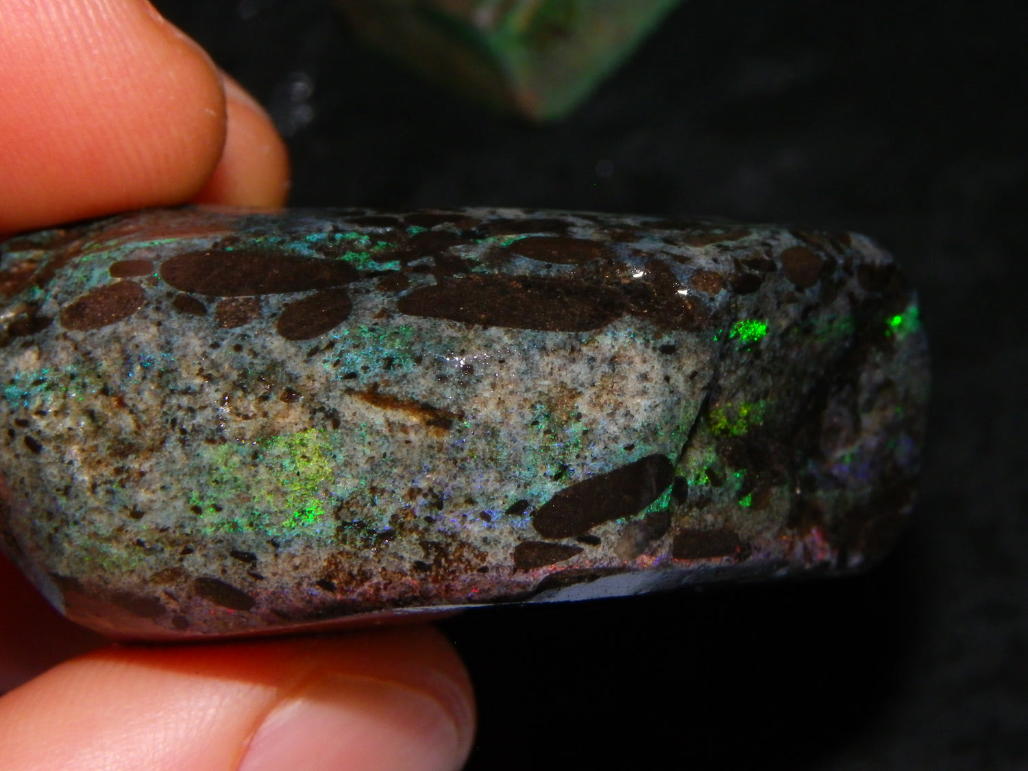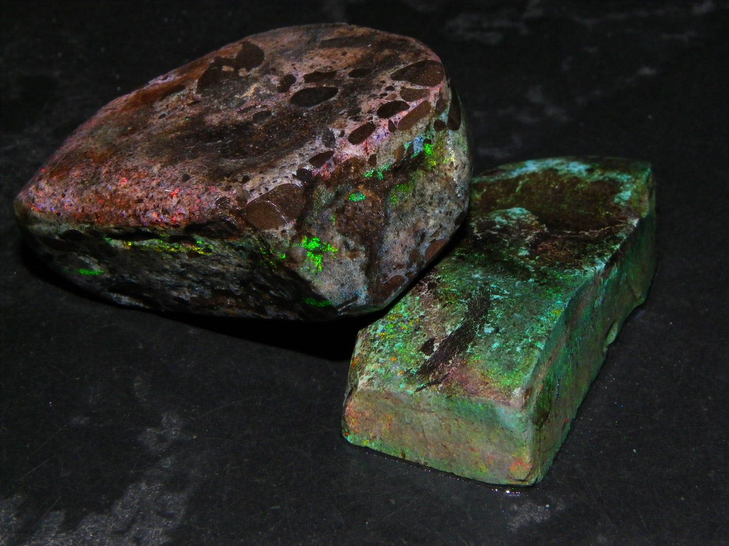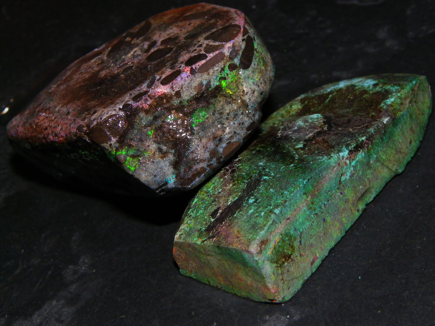 I have for sale 2 Treated/Rubbed/Rough Opals from Andamooka, South Australia. These weigh 417cts in total. They are Concrete/Matrix, Lightly Treated to show some colours. One has Very Fine Green Pinfire throughout. The other has a Brighter Green/Golish Bars through the middle and a Pink/Red section in the top. Also more Black Inclusions aswell. Great Specimens, may clean up Cabs/Freeforms in the right hands,..,. Thanks for looking,.,.