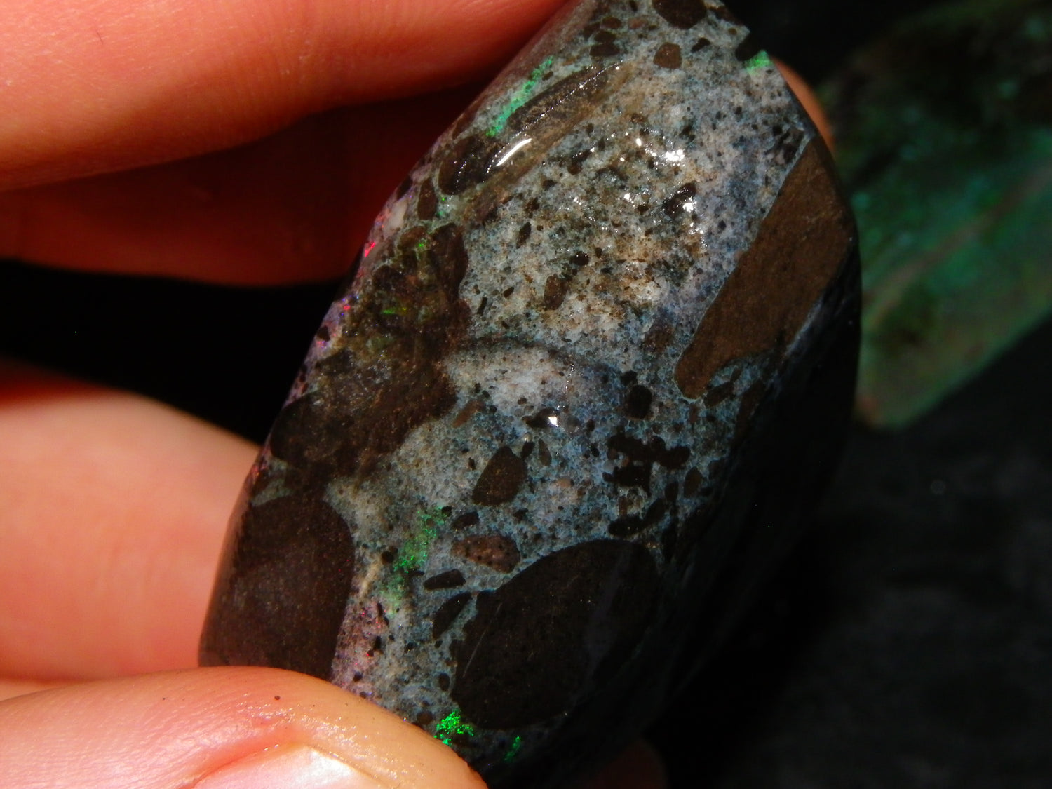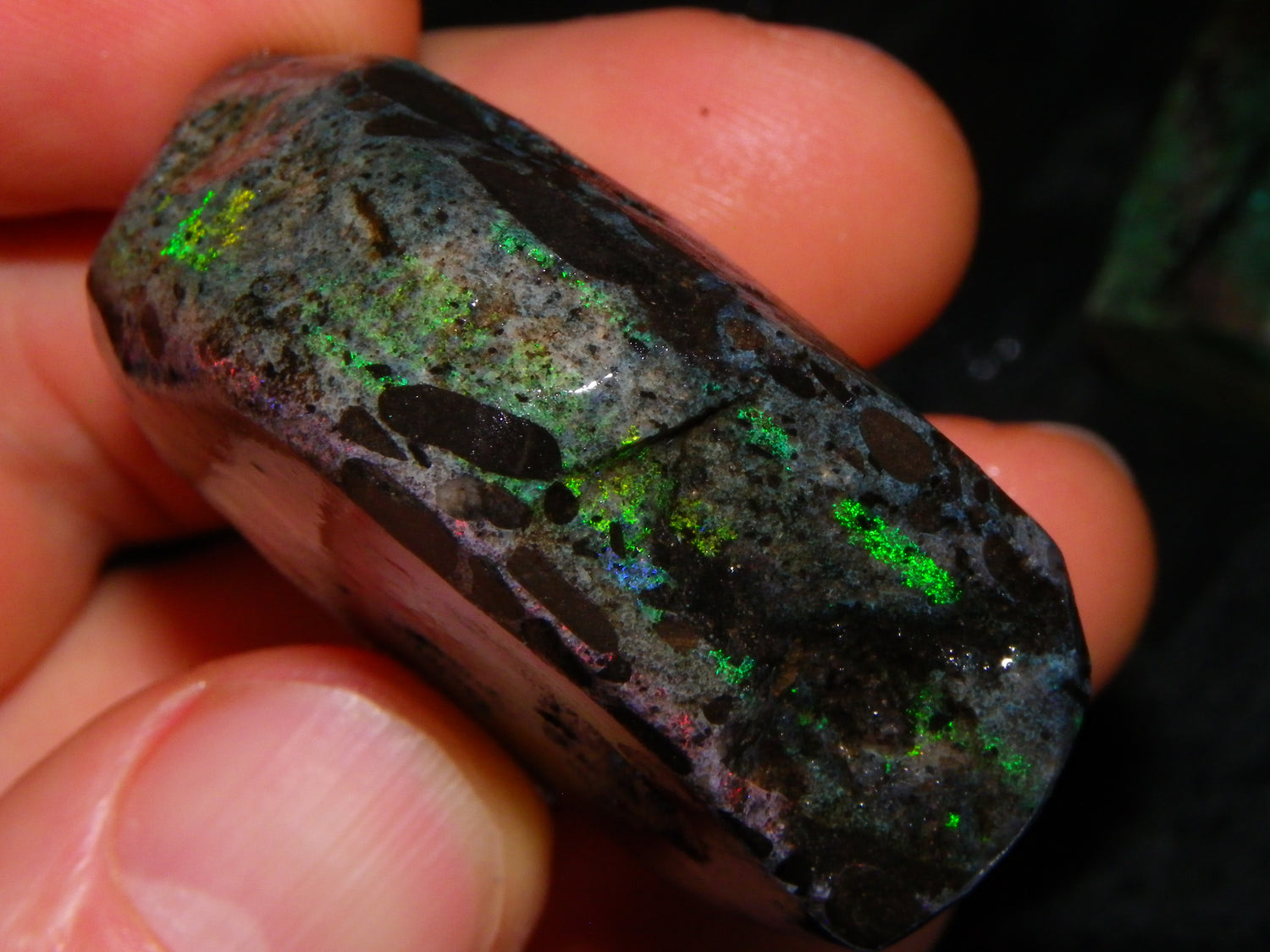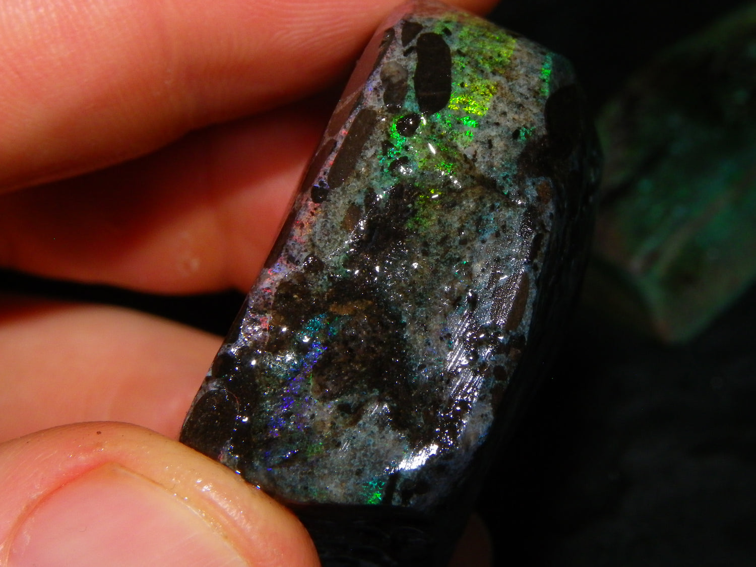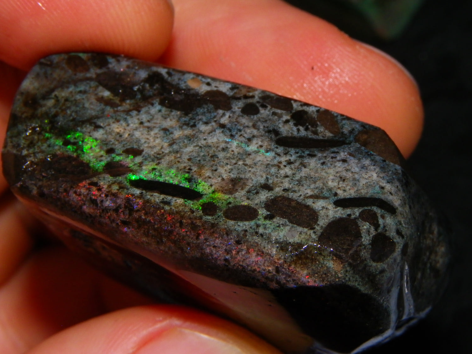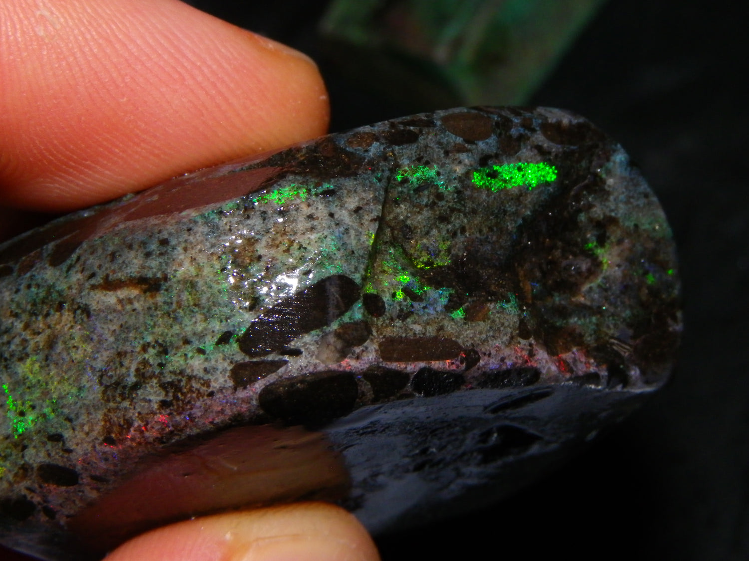 I have for sale 2 Treated/Rubbed/Rough Opals from Andamooka, South Australia. These weigh 417cts in total. They are Concrete/Matrix, Lightly Treated to show some colours. One has Very Fine Green Pinfire throughout. The other has a Brighter Green/Golish Bars through the middle and a Pink/Red section in the top. Also more Black Inclusions aswell. Great Specimens, may clean up Cabs/Freeforms in the right hands,..,. Thanks for looking,.,.