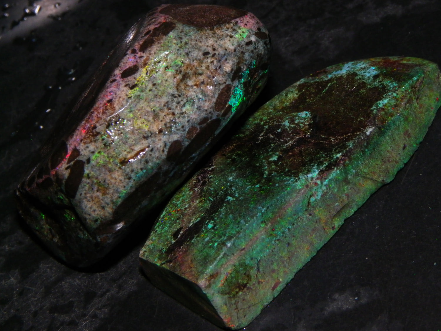 2 Treated/Andamooka Matrix Opal Rough Specimens 417cts Green/Pink Fires