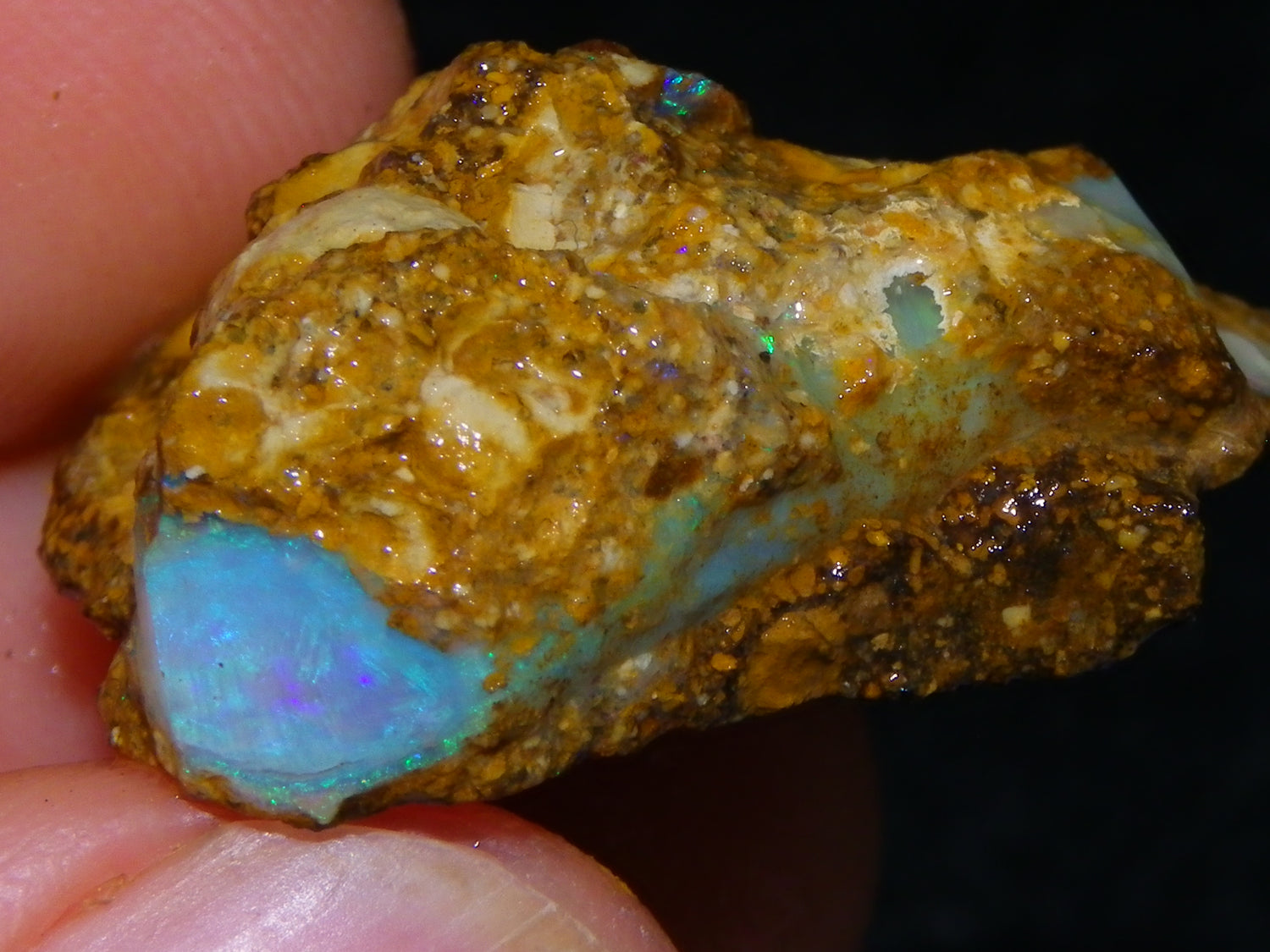 I have for sale a Nice Parcel of 3 Crystal Opal Pipe Specimens in Host Sand/Irsontone material. These weigh 174.5cts in total These all have Fires in them, Blues and Greens. One is Bright Green in harder base rock, Windows into the Opal with more to uncover. The others are less Bright with Blue/Green in Pipes running through the material. These are Infilled Tree roots and other cavities like that. Very Interesting specimens for a collector, or try cleaning them up into freeform/cabs and similar,.,.,. Thanks for looking,.,.,.