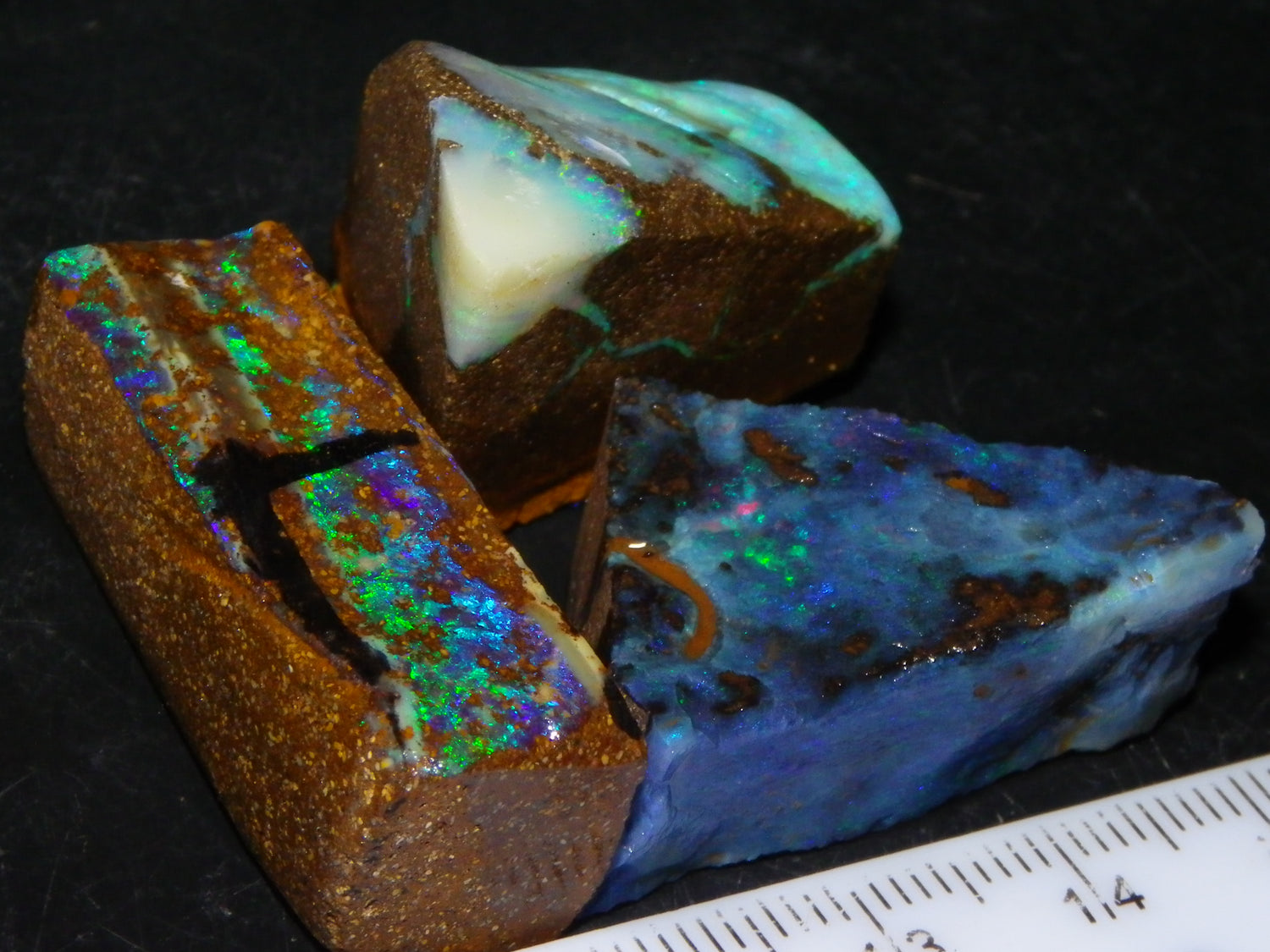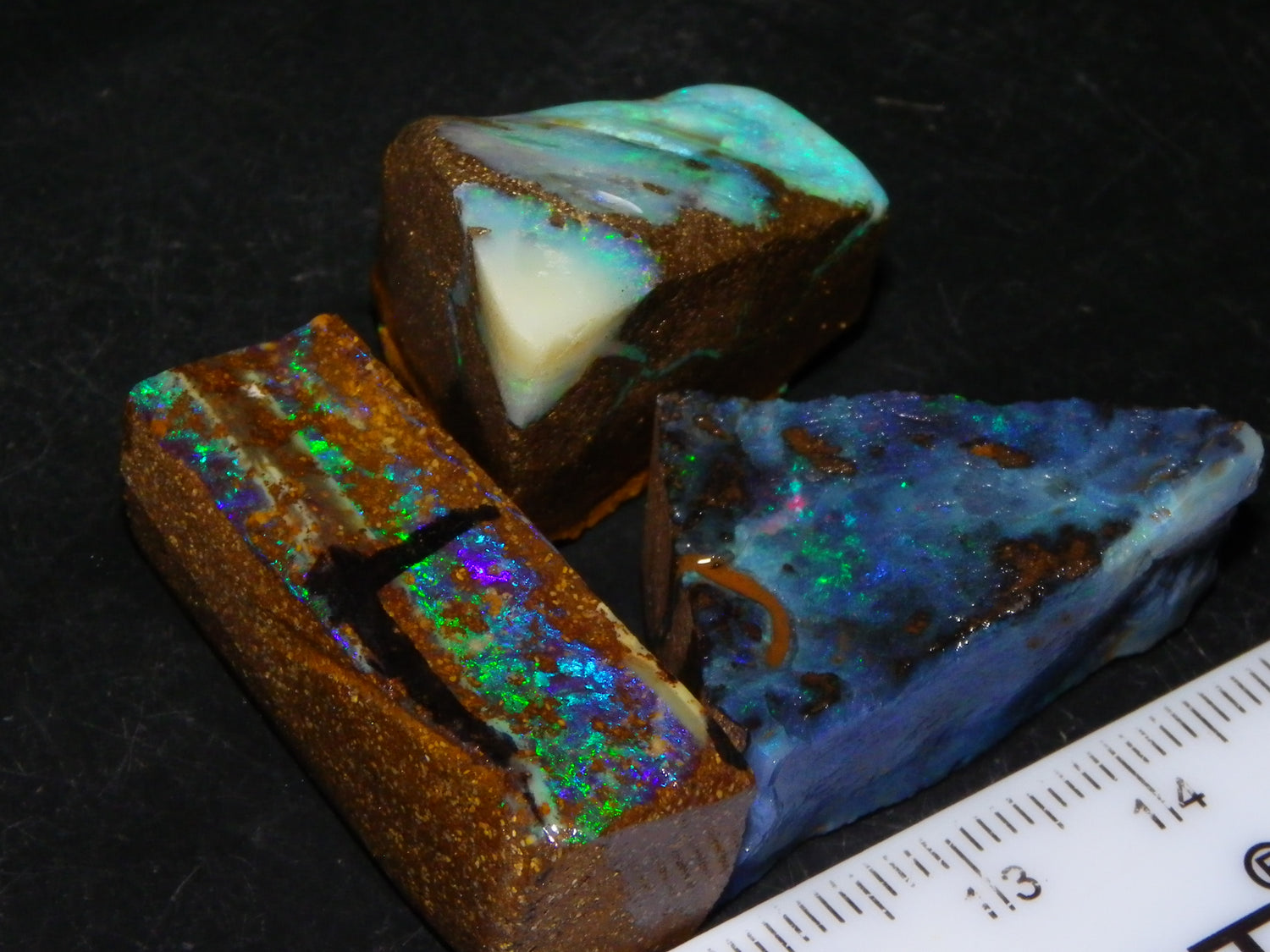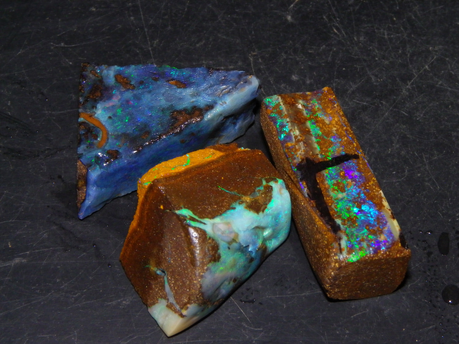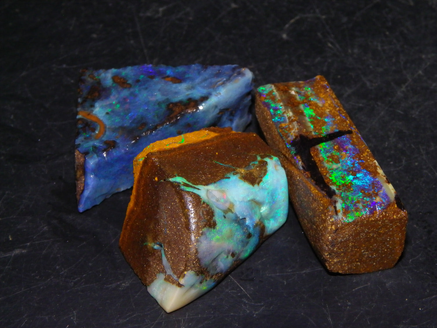 I have for sale 3 Nice Rubbed/Rough/Sliced Boulder opals from Queensland Australia. They weigh 172.5cts in total. Ironstone base material all with Fires over them. One has Brighter Blue/Greens on the Top face. Another Fires in Milky Opal. Last has Clearer Opal on 2 faces with some Blue/Greens wen moved. Great Specimens, and should clean up some nice Pendants/Freeforms and similar.,,., Thanks for looking,.,.,.