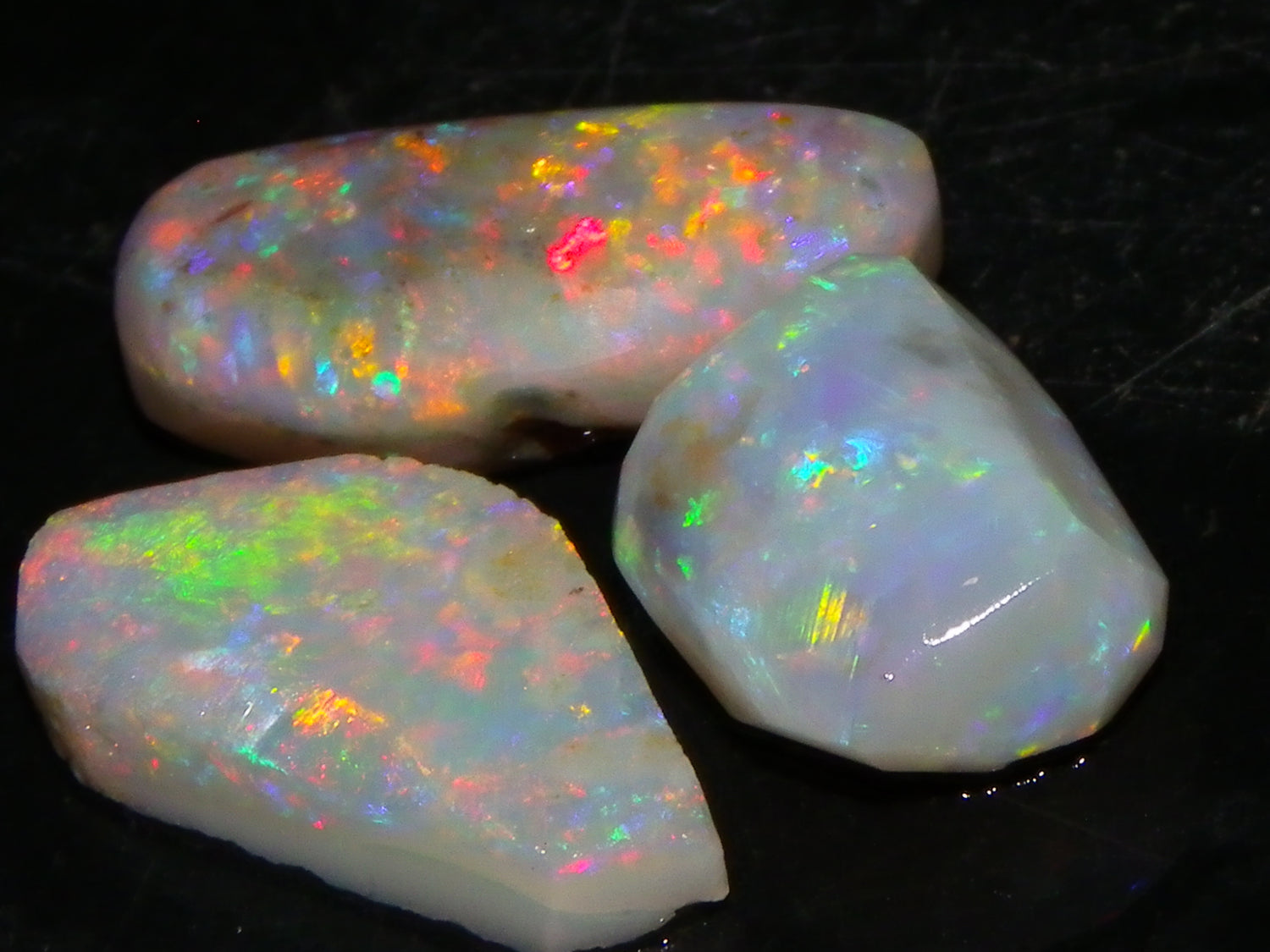 I have for sale 3 Nice rubbed/Preformed Seam Opals from Coober Pedy Australia. The weigh 12cts in total. They are Crystal/White/Milky Base material all with Fires over/through them. Nice Gold/Blue/Red/Green Flashes when moved. One is a nice domed shape with lots of colour. Some slight inclusion lines aswell. Then a Pink/Gold dominant piece, Lighter base. Last has a rubbed out bar on the top. These are great Specimens as they are, but once polished will make nice Pendants and similar. Thanks for looking,.,.,.