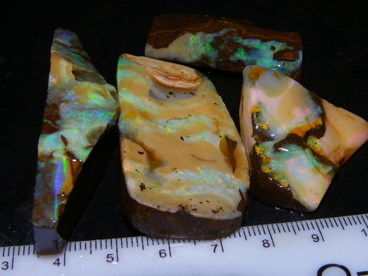 I have for sale 4 nice Rubbed/Rough Boulder Opals from Queensland Australia. These weigh 416cts in total. They are Crystal/Milky/Whiter Opal mixed with Caramel potch in the faces. Some cleaner areas too. Lots of colour over these. Great Specimens parcel, and will clean up some cabs/pendants and similar. Thanks for looking.
