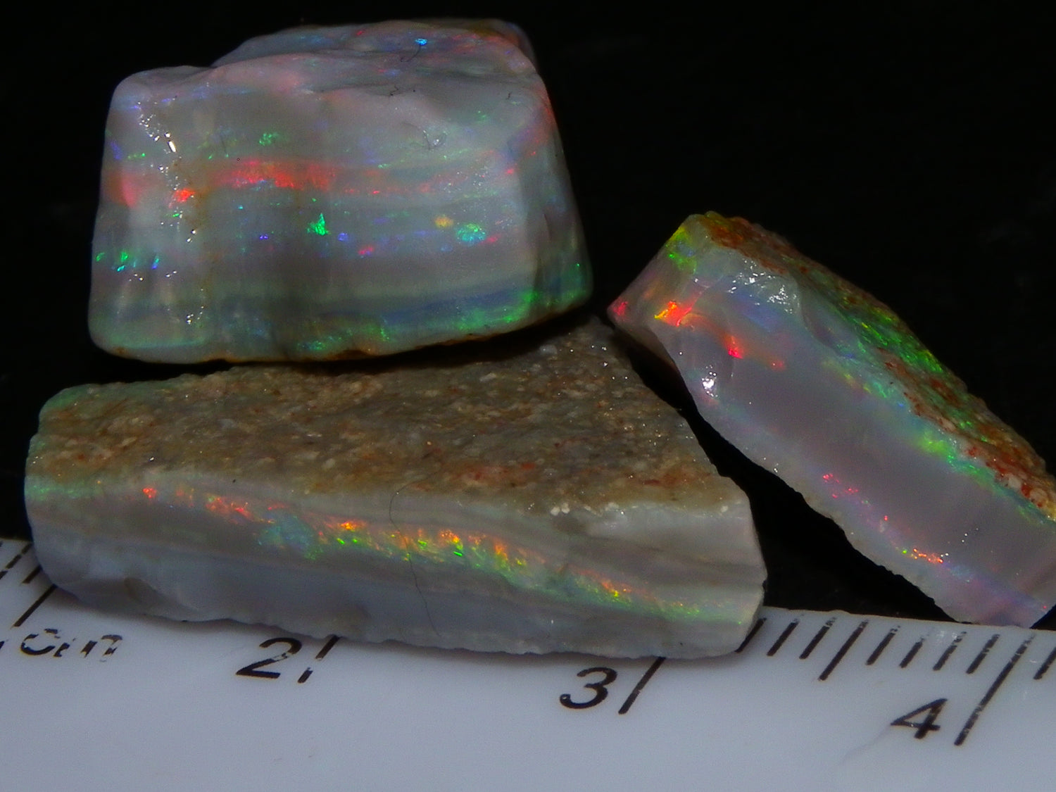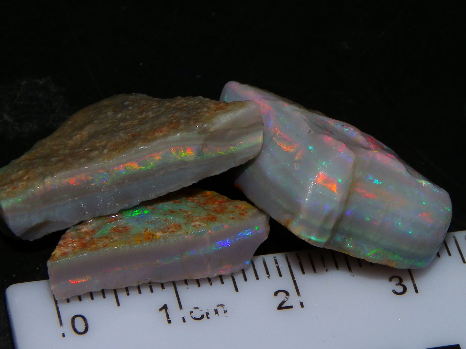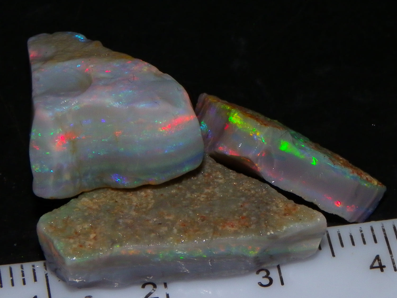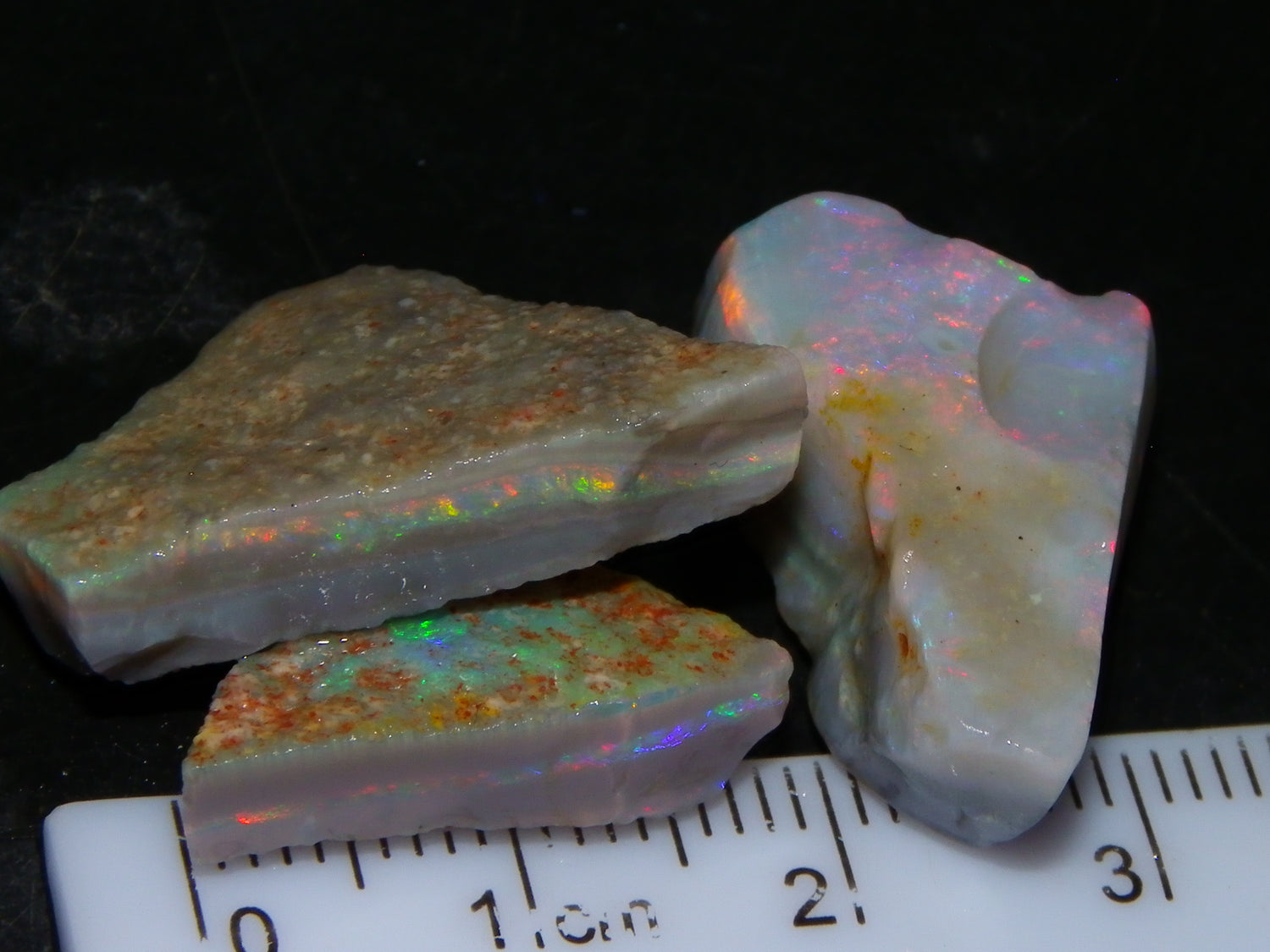 I have for sale a Nice Quality, Gem Seam Opal Rough Parcel from Mintabie, Australia. These 3 stones weigh 32.4cts in total. They all have Red/Pink/Gold/and some Orange/Green Fires in bars through them. Some multiple bars, one piece has one very nice flat bar, the others have 2. One on a slight diagonal tilt. Slight Sand/Skin to remove. These will cut some very nice Gems, Would love to see what they cut. Priced at just over (£10/ct) Thanks for looking,.,.