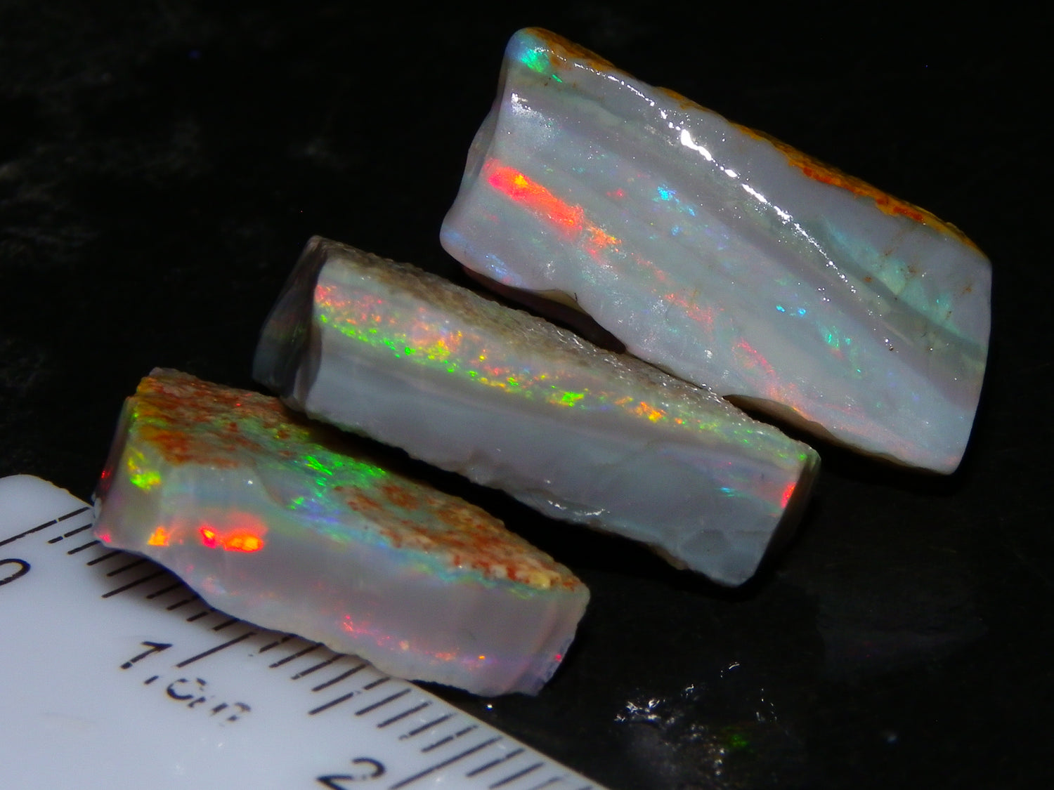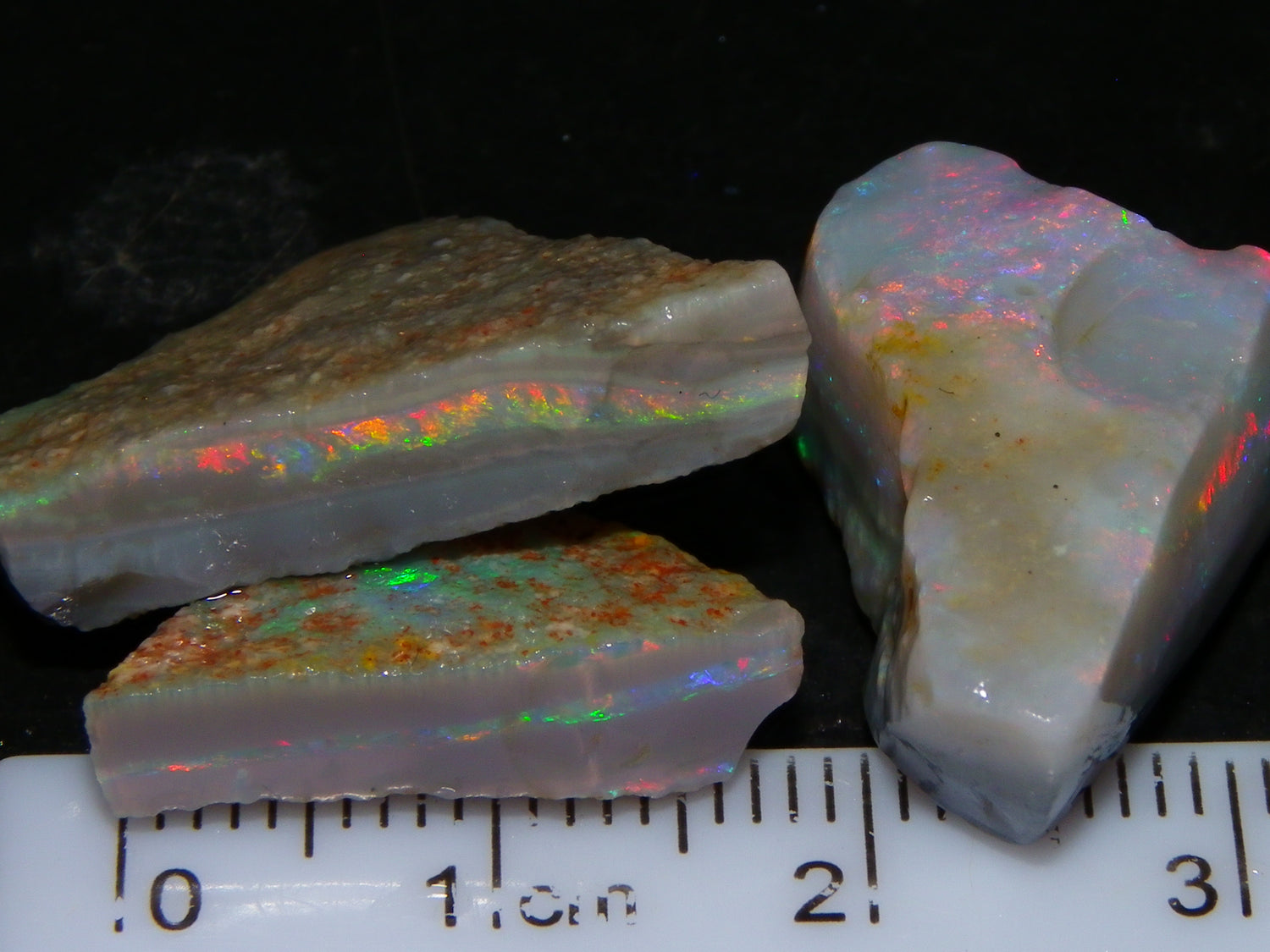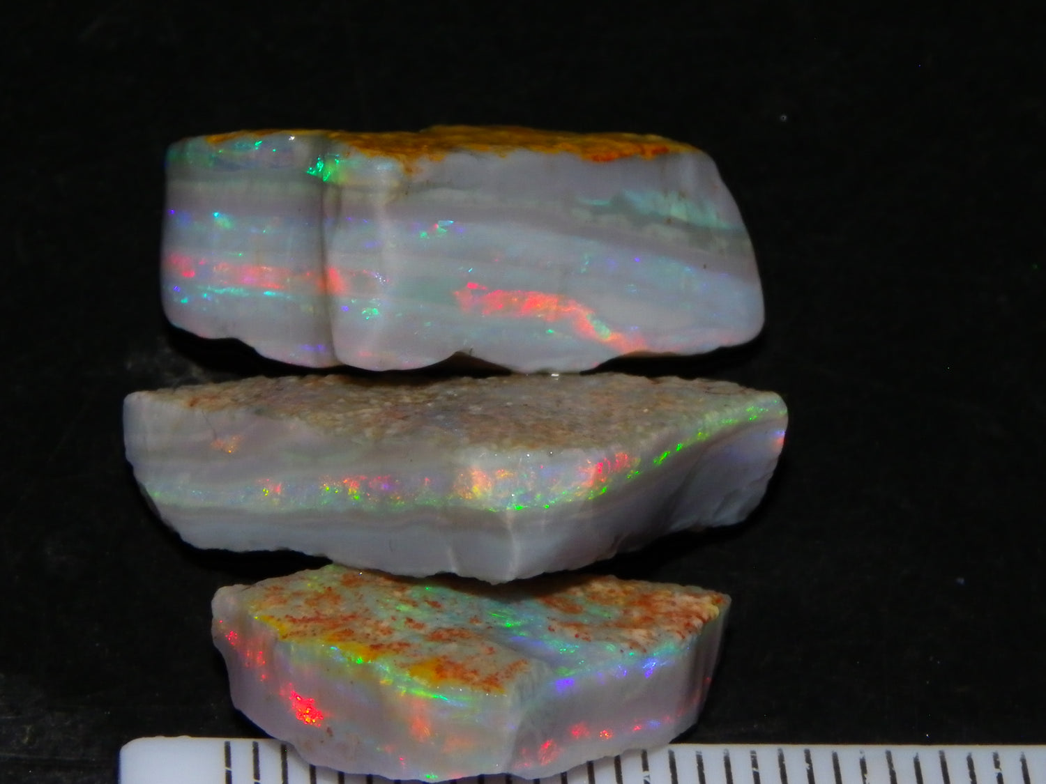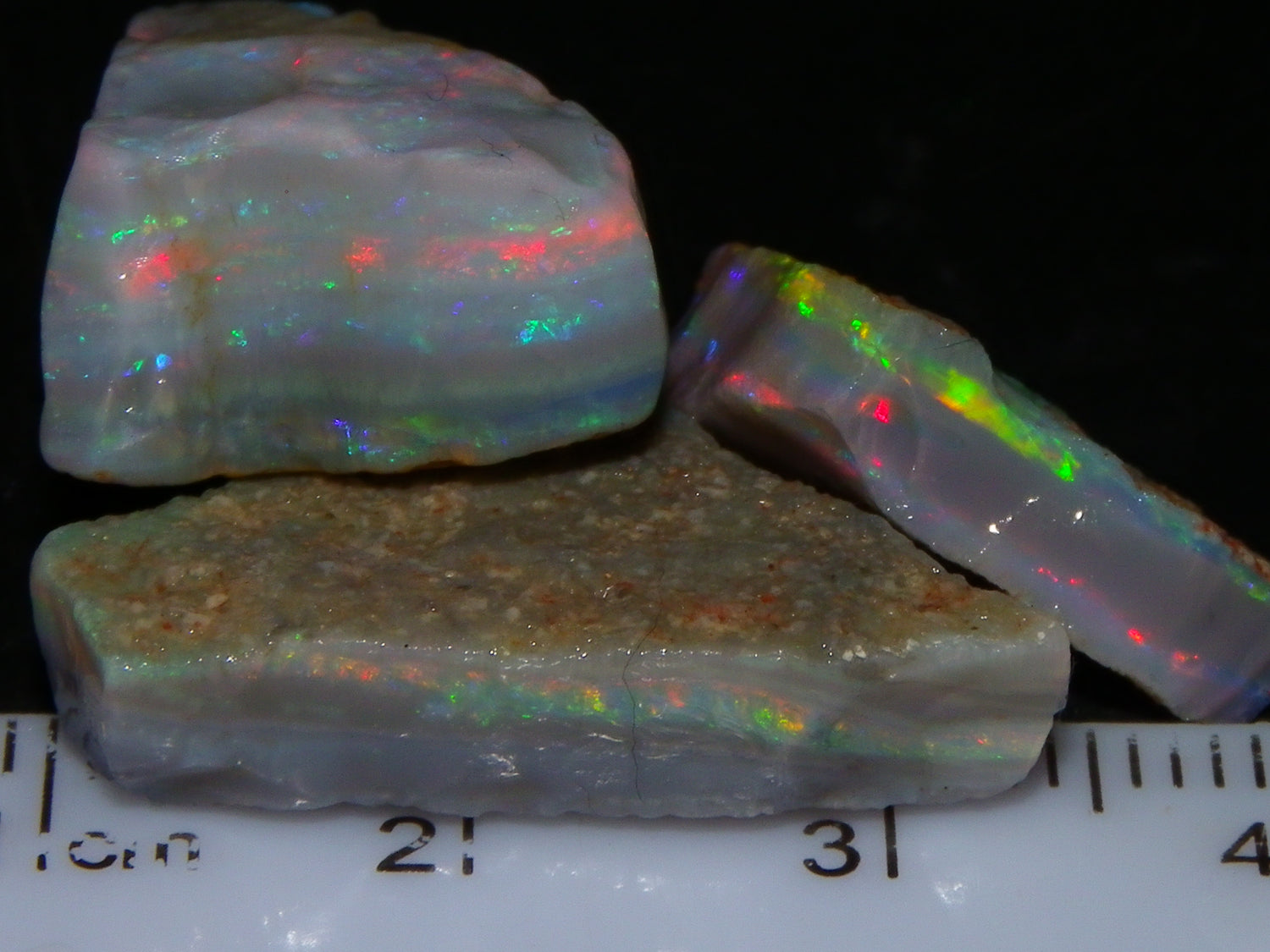 I have for sale a Nice Quality, Gem Seam Opal Rough Parcel from Mintabie, Australia. These 3 stones weigh 32.4cts in total. They all have Red/Pink/Gold/and some Orange/Green Fires in bars through them. Some multiple bars, one piece has one very nice flat bar, the others have 2. One on a slight diagonal tilt. Slight Sand/Skin to remove. These will cut some very nice Gems, Would love to see what they cut. Priced at just over (£10/ct) Thanks for looking,.,.