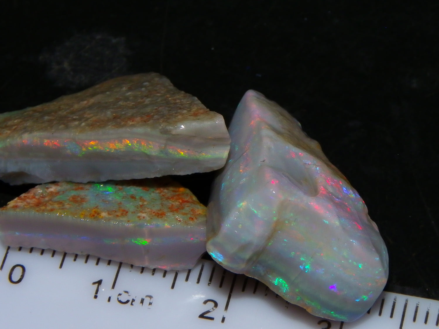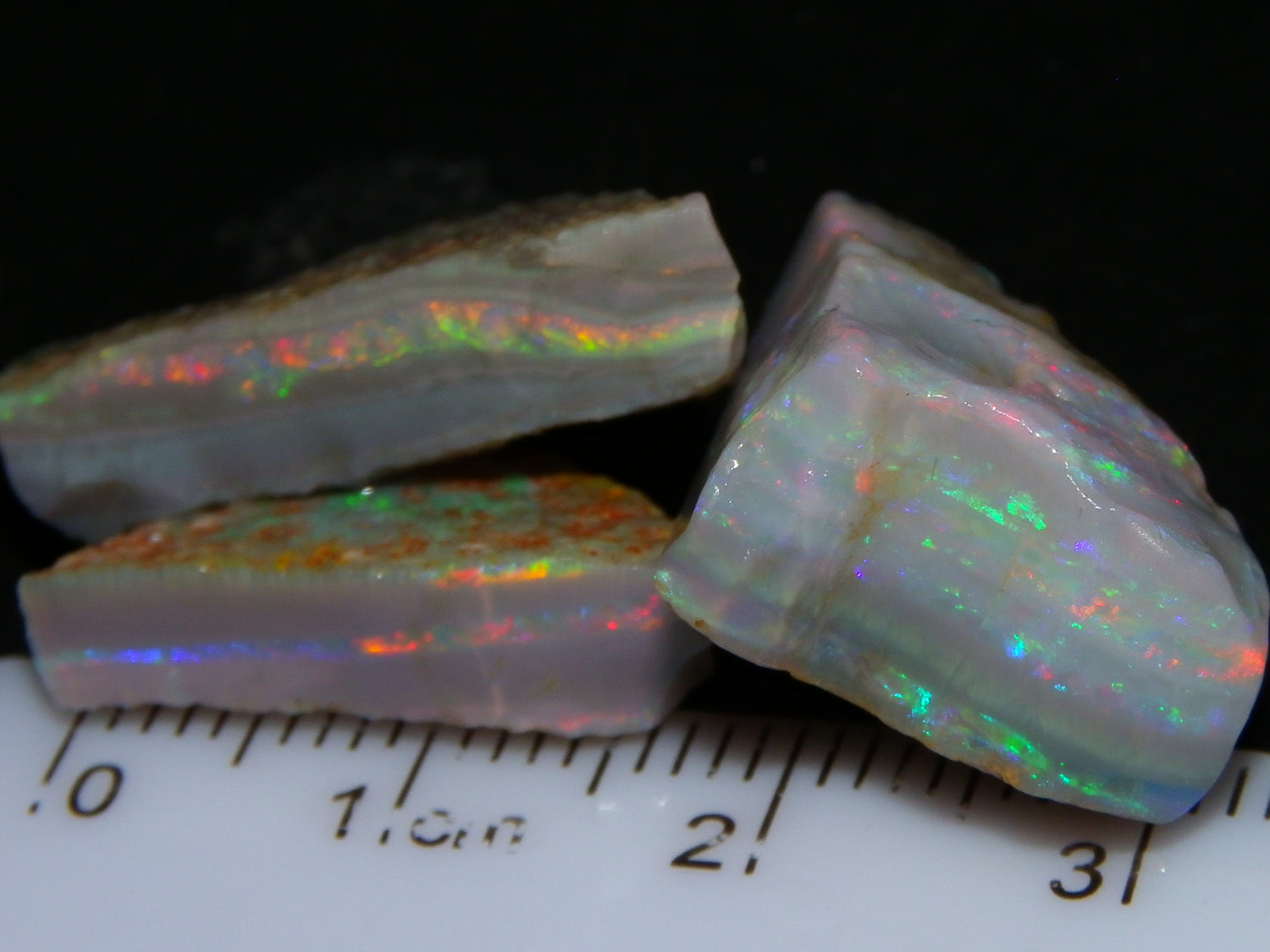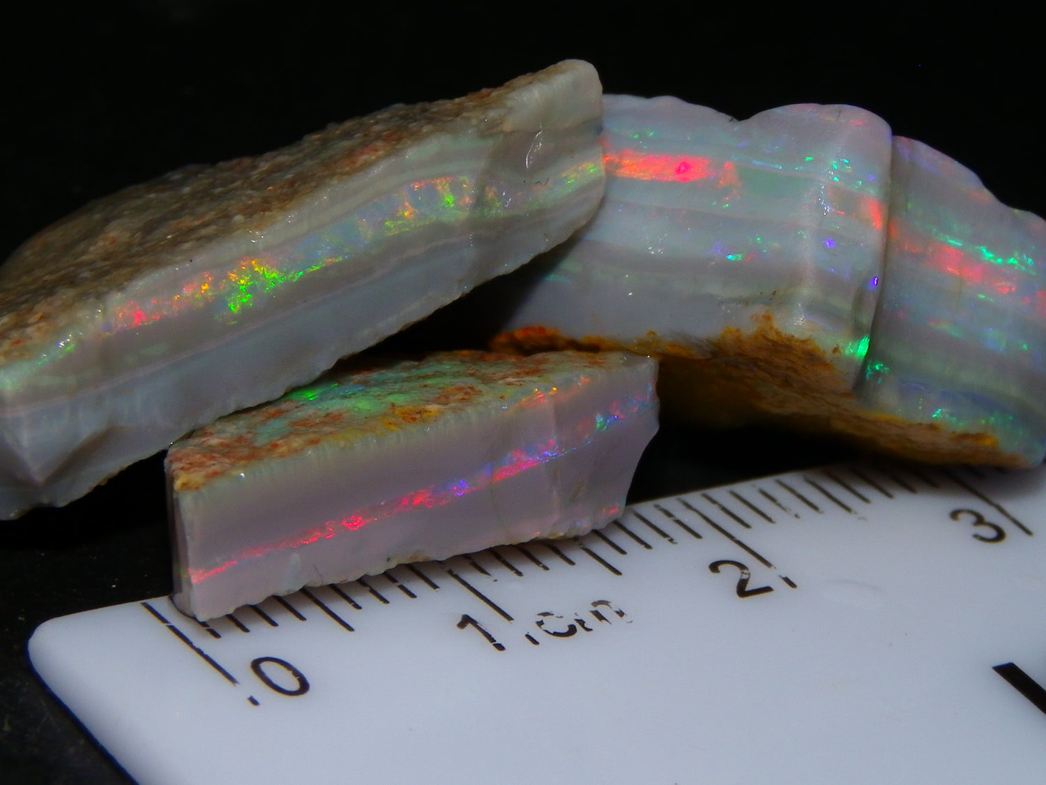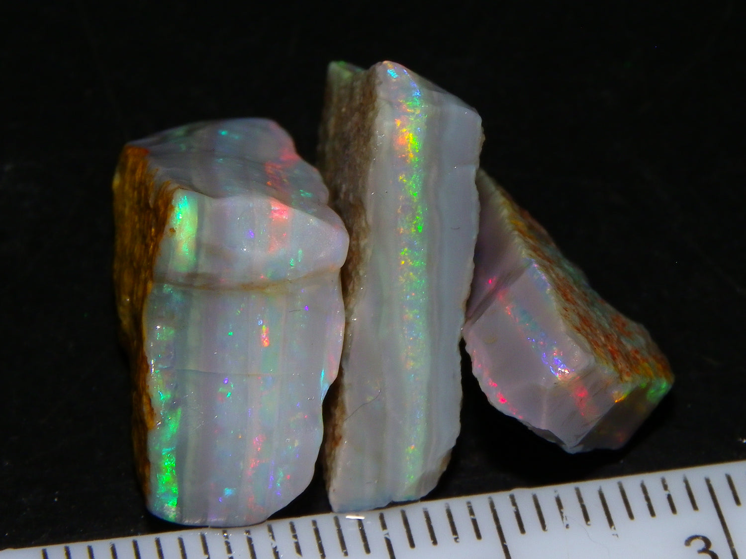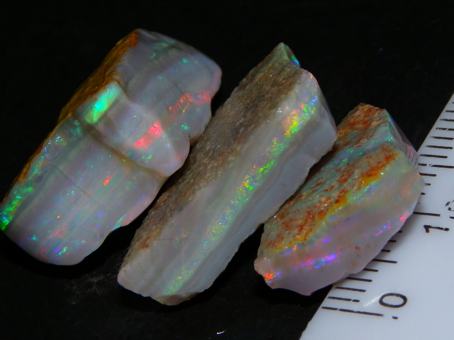 I have for sale a Nice Quality, Gem Seam Opal Rough Parcel from Mintabie, Australia. These 3 stones weigh 32.4cts in total. They all have Red/Pink/Gold/and some Orange/Green Fires in bars through them. Some multiple bars, one piece has one very nice flat bar, the others have 2. One on a slight diagonal tilt. Slight Sand/Skin to remove. These will cut some very nice Gems, Would love to see what they cut. Priced at just over (£10/ct) Thanks for looking,.,.