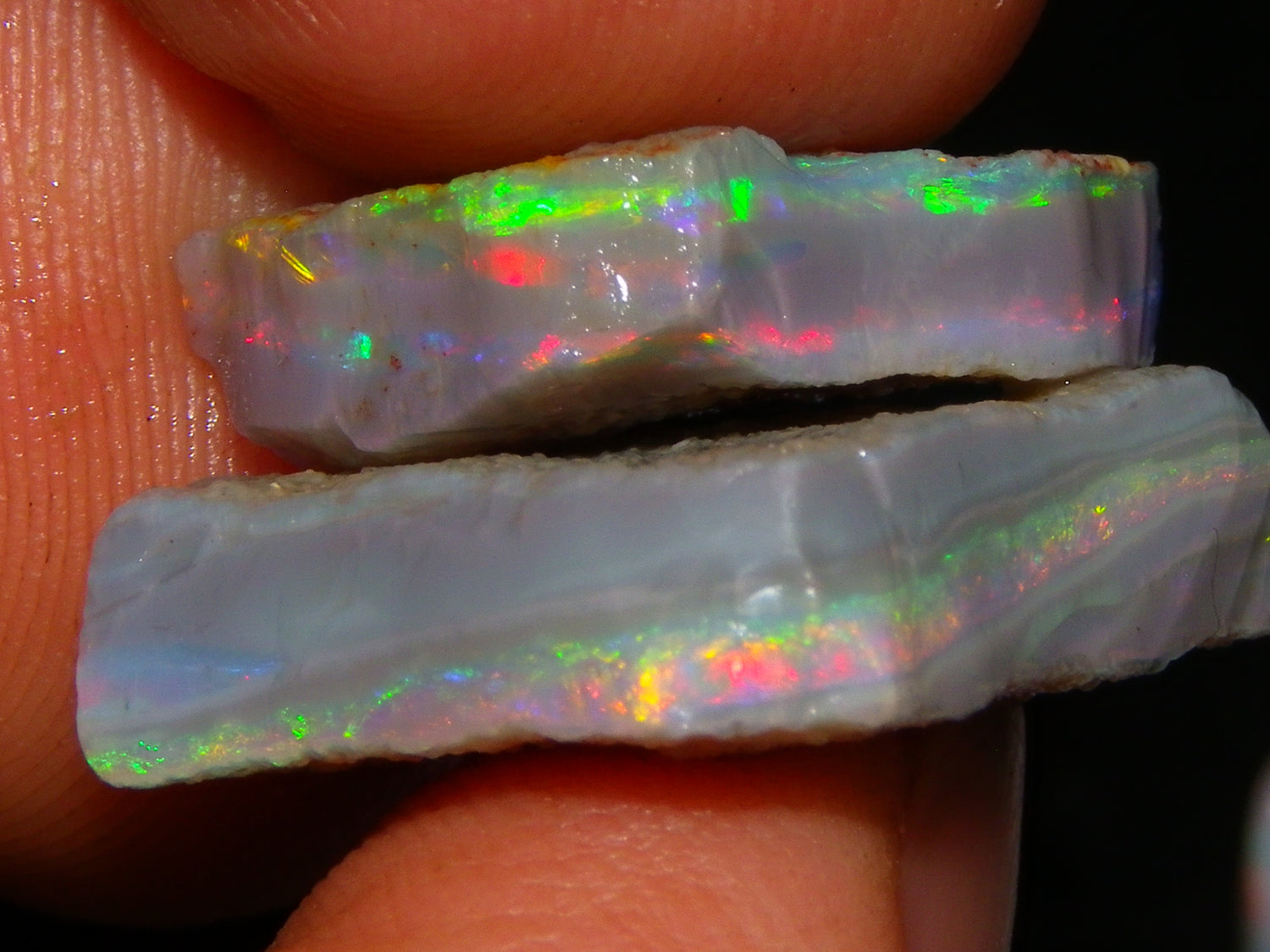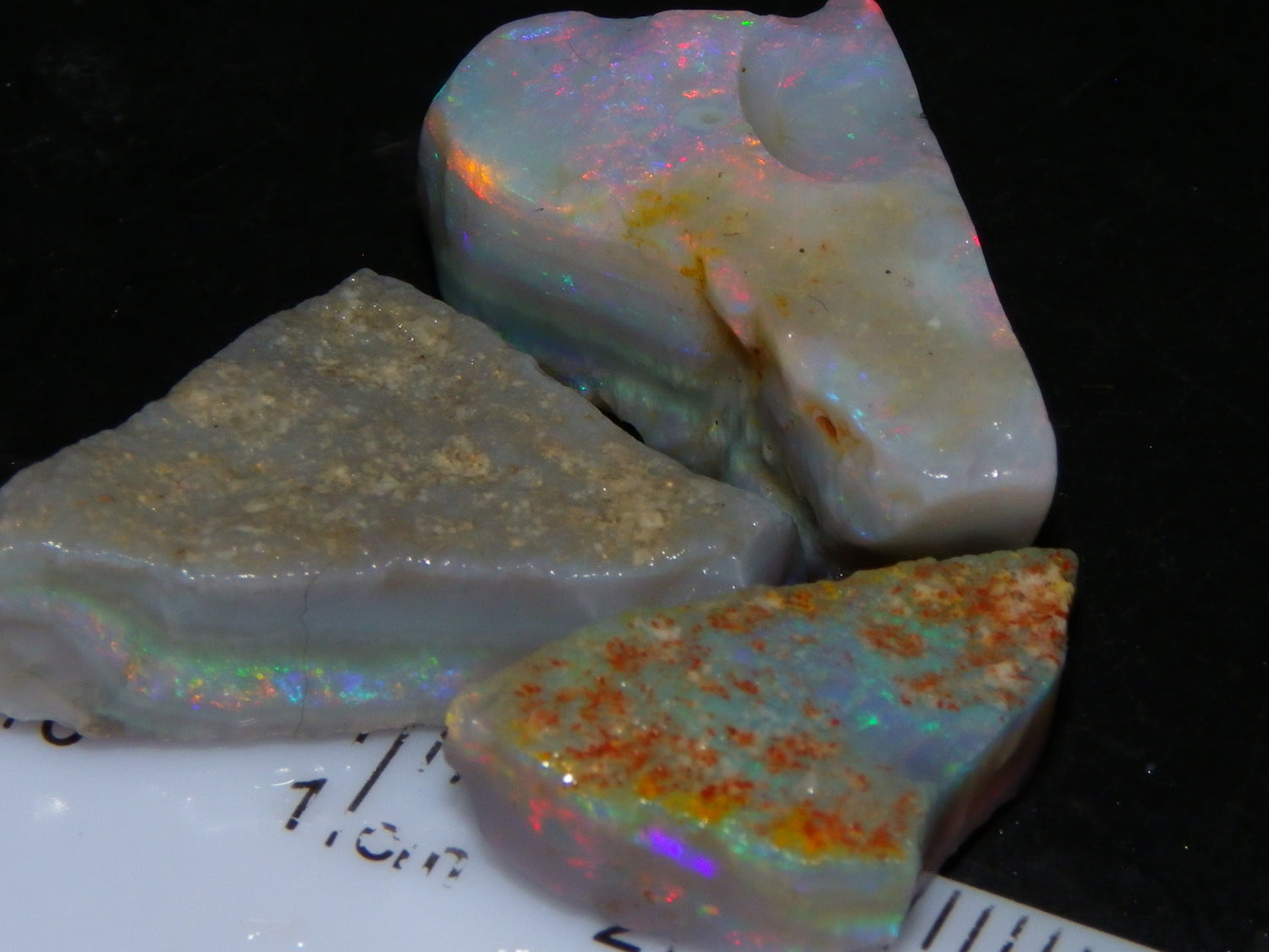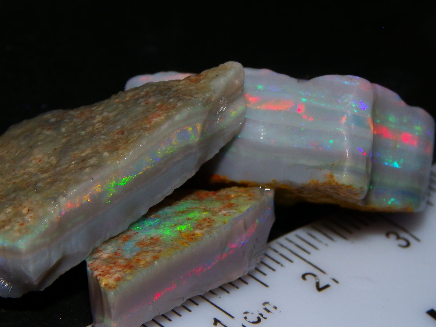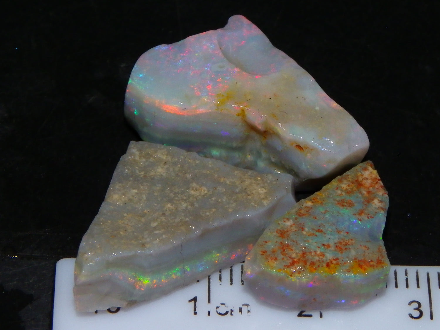 I have for sale a Nice Quality, Gem Seam Opal Rough Parcel from Mintabie, Australia. These 3 stones weigh 32.4cts in total. They all have Red/Pink/Gold/and some Orange/Green Fires in bars through them. Some multiple bars, one piece has one very nice flat bar, the others have 2. One on a slight diagonal tilt. Slight Sand/Skin to remove. These will cut some very nice Gems, Would love to see what they cut. Priced at just over (£10/ct) Thanks for looking,.,.