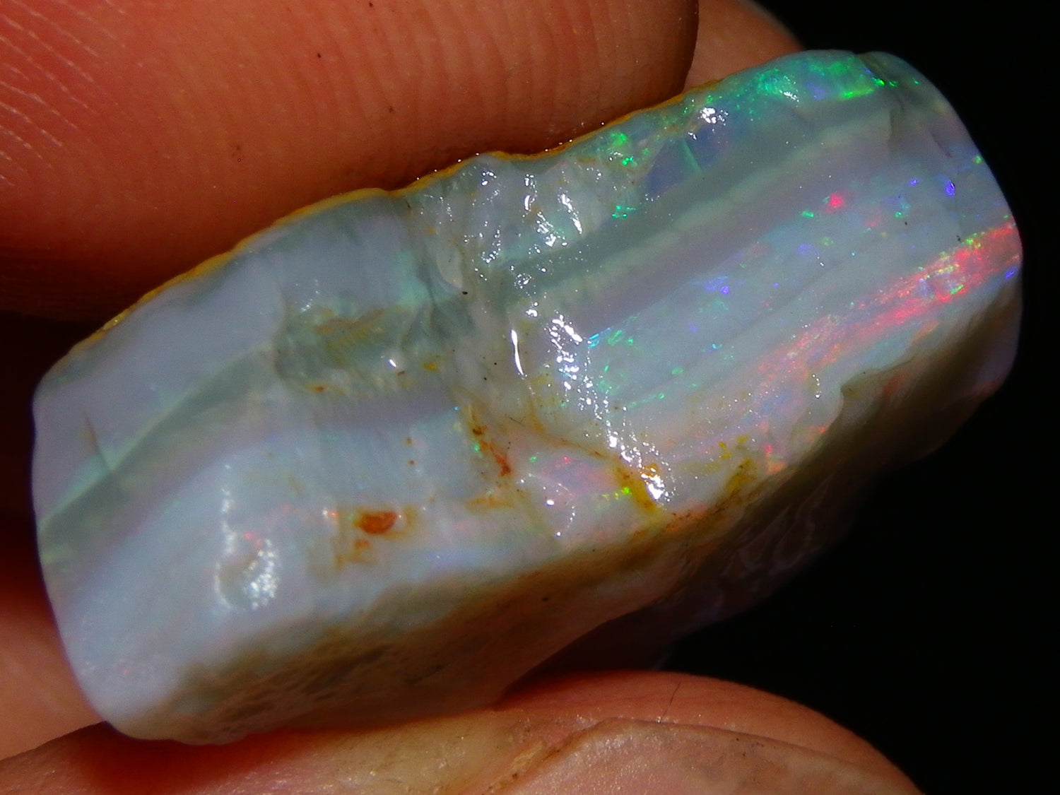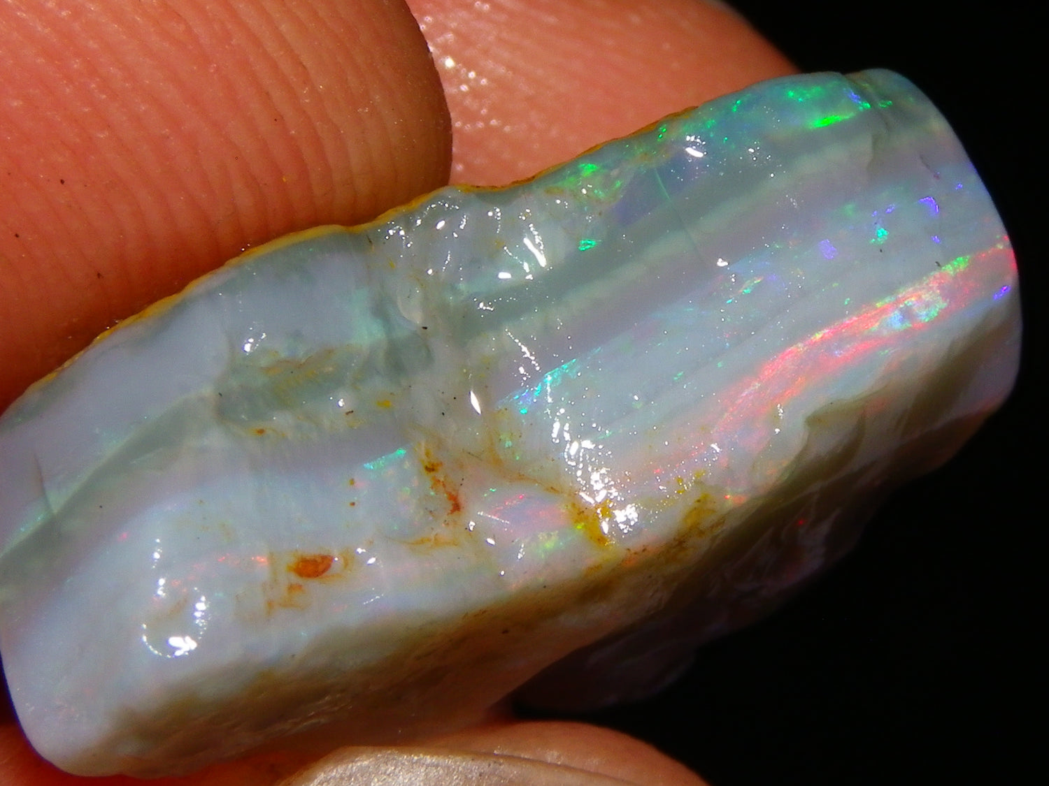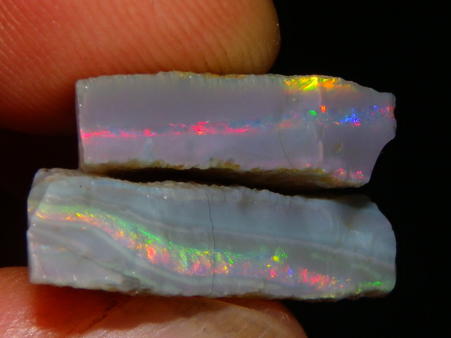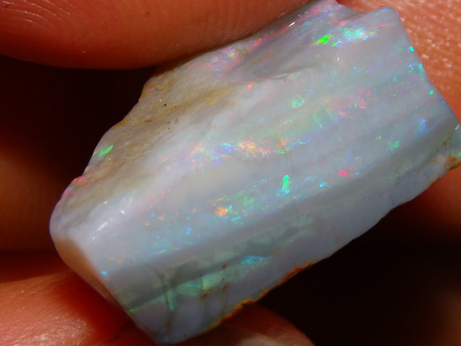 I have for sale a Nice Quality, Gem Seam Opal Rough Parcel from Mintabie, Australia. These 3 stones weigh 32.4cts in total. They all have Red/Pink/Gold/and some Orange/Green Fires in bars through them. Some multiple bars, one piece has one very nice flat bar, the others have 2. One on a slight diagonal tilt. Slight Sand/Skin to remove. These will cut some very nice Gems, Would love to see what they cut. Priced at just over (£10/ct) Thanks for looking,.,.