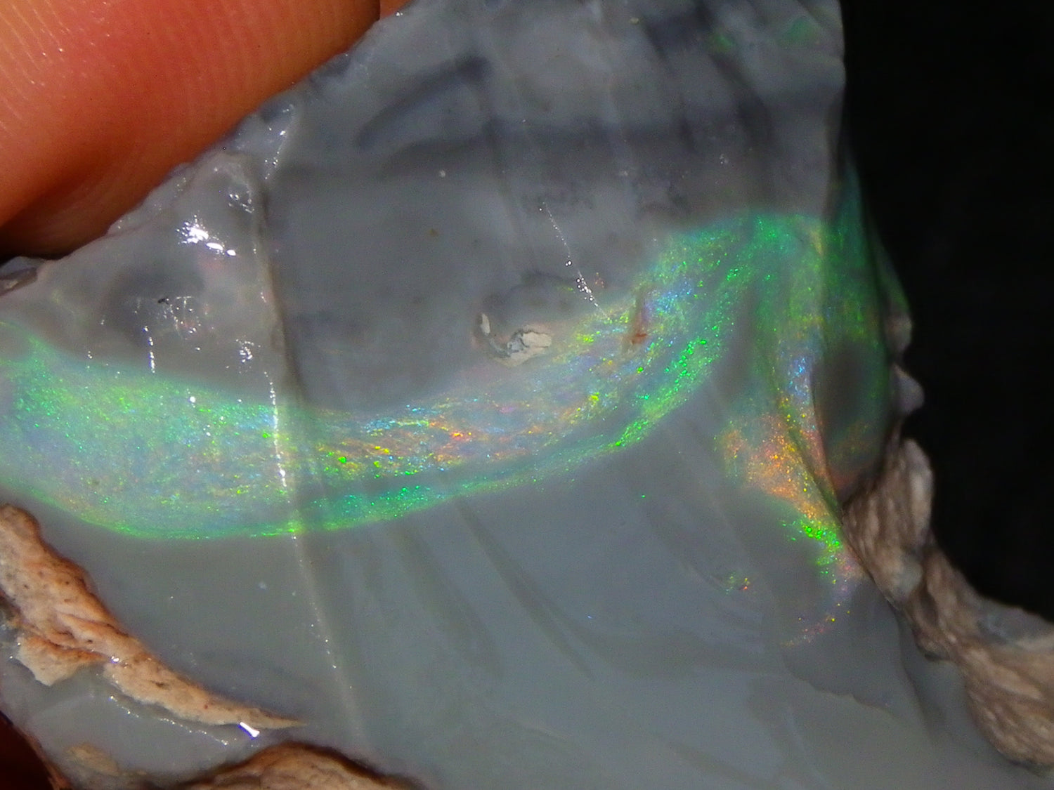I have for sale a very nice Rough Lightning Ridge Grey Base seam opal from Australia. This weighs 173.14cts and is 53x38x32mm. Large chunk this one, It is N5/6 with slight N4 potch in places. There is the main bar running through. Thick in places, thinner round the back, Greens/Pink/Orange pinfire/Mist/Patterns all the way around. Then a bonus Red/Green Bar in the base, if your cutting, that will slice off and likely cut another stone. Great Specimen piece too for a collector. These come around very rarely. Thanks for looking.