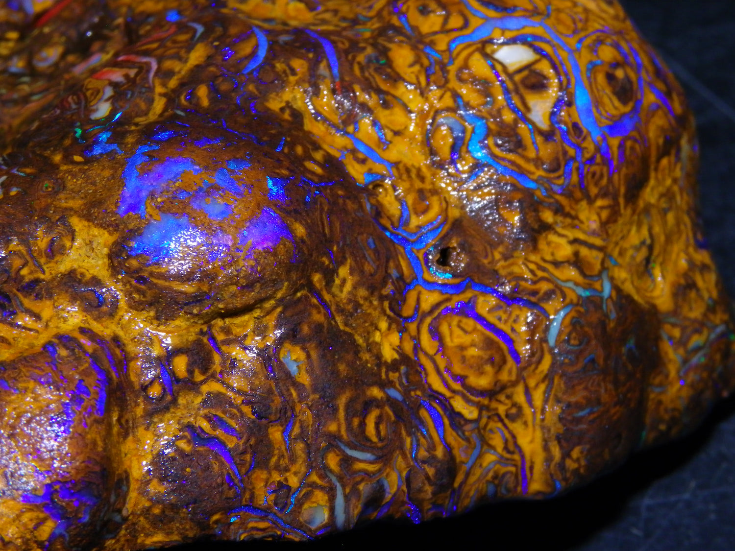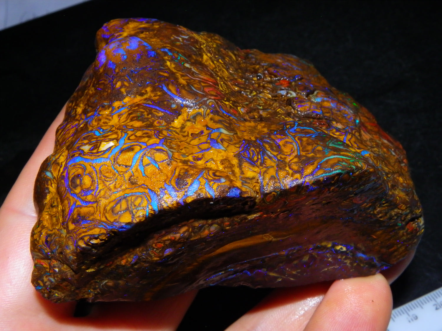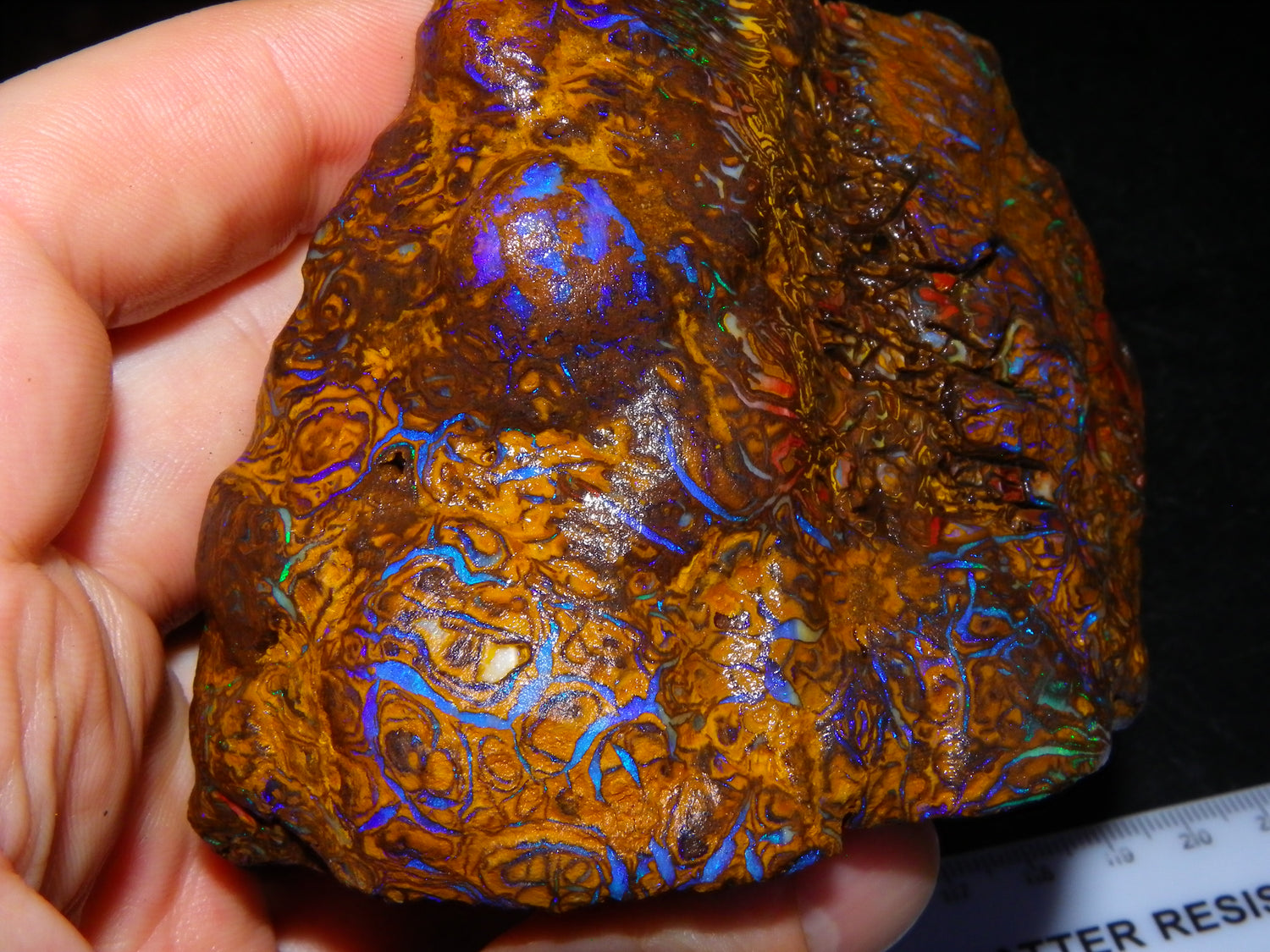 I have for sale a Huge and Gemmy Koroit Opal Rubbed/Rough Specimen from Queensland Australia. This one weighs a hefty 2170cts or 434Grams and is 100x74x39mm. Ironstone base, part of a Huge Nut, top skin has been rubbed to show loads of Patterns and some Nice Fires in places. MIxed Blue/Purple and Green/Blues. There is some pitting in the middle of the piece. The outer skin /pattern on this is huge, with many options for cutting lots of cabs from it. The middle also has at least 2 Blue/Purple skins to clean up if its sliced up. I would clean up the top and Polish it as a massive cabinet specimen., Stones like this rarely come up for sale. One of a kind masterpiece of nature right here. Thanks for looking.