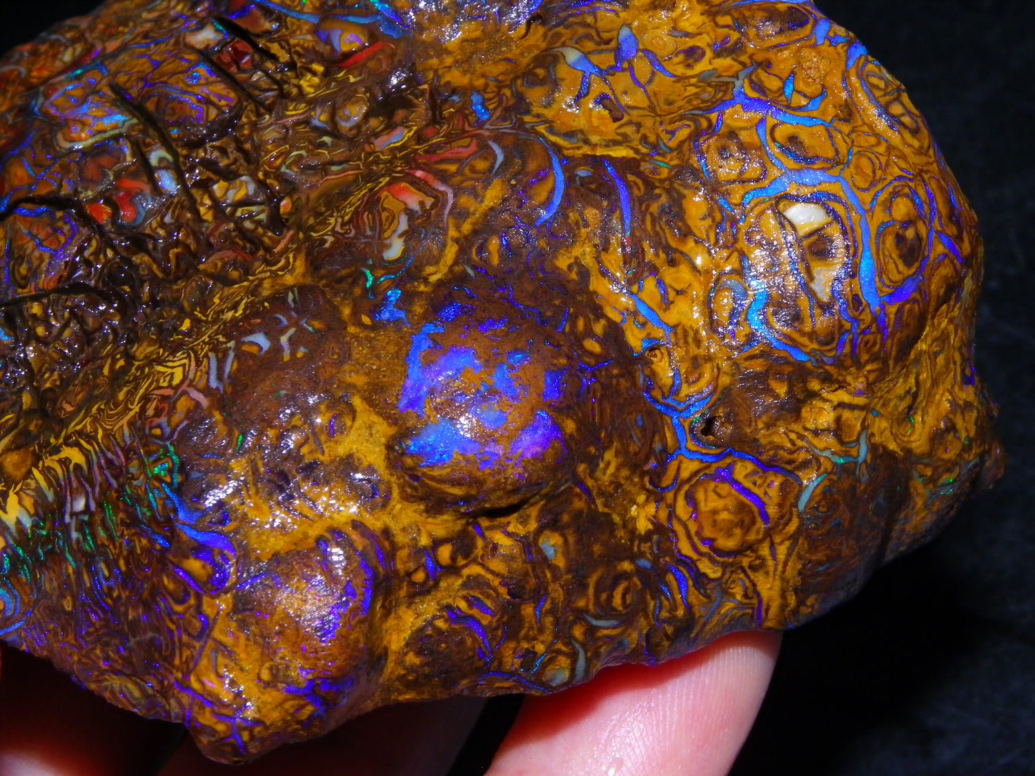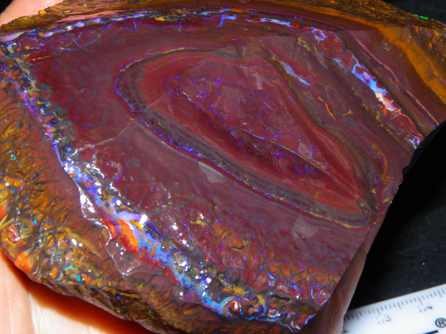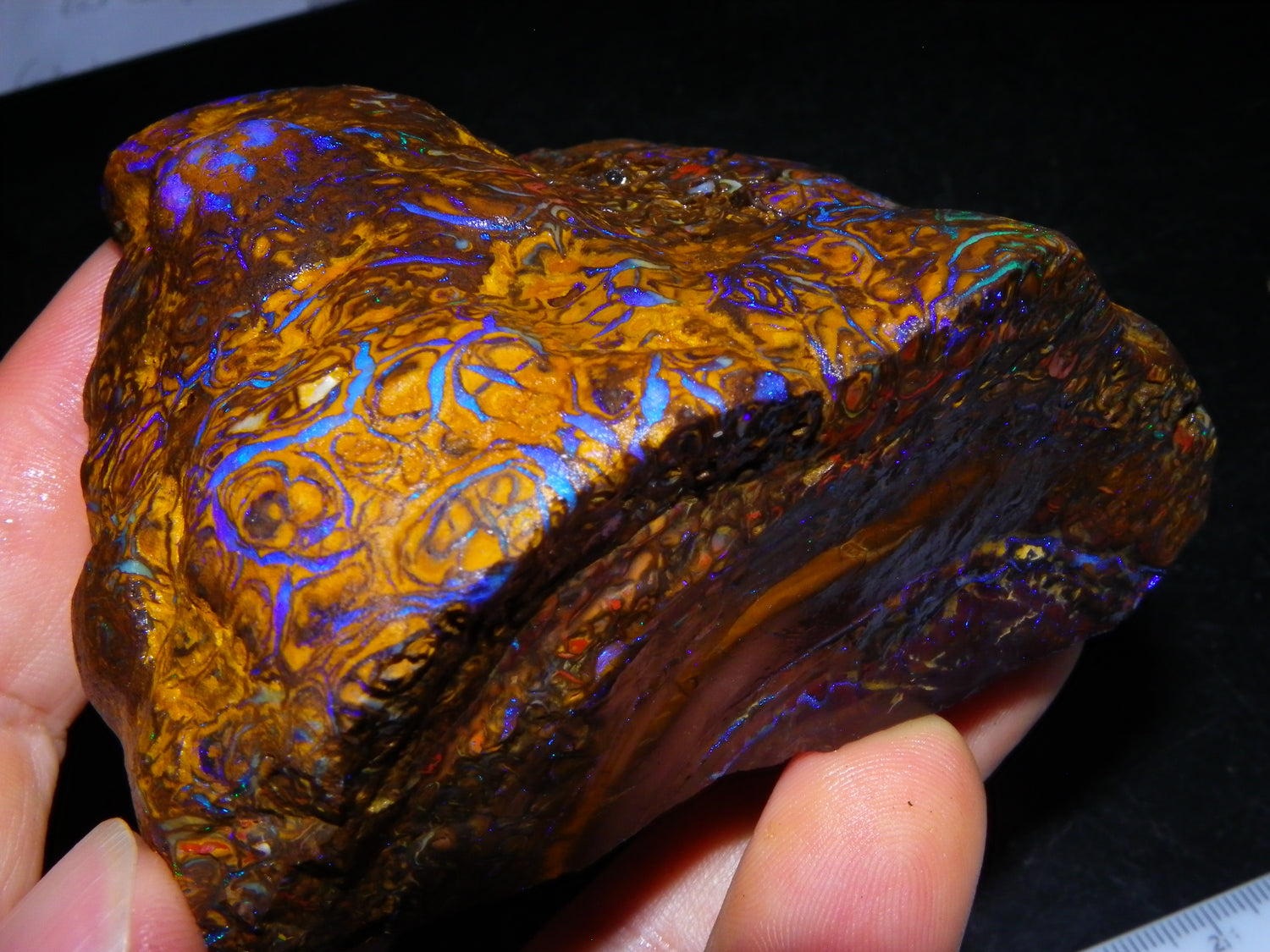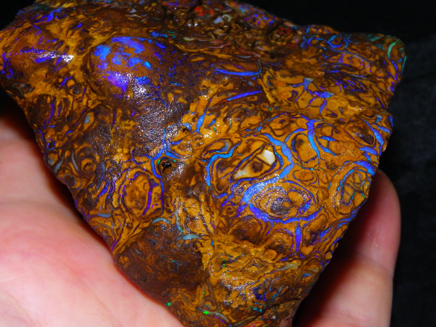 I have for sale a Huge and Gemmy Koroit Opal Rubbed/Rough Specimen from Queensland Australia. This one weighs a hefty 2170cts or 434Grams and is 100x74x39mm. Ironstone base, part of a Huge Nut, top skin has been rubbed to show loads of Patterns and some Nice Fires in places. MIxed Blue/Purple and Green/Blues. There is some pitting in the middle of the piece. The outer skin /pattern on this is huge, with many options for cutting lots of cabs from it. The middle also has at least 2 Blue/Purple skins to clean up if its sliced up. I would clean up the top and Polish it as a massive cabinet specimen., Stones like this rarely come up for sale. One of a kind masterpiece of nature right here. Thanks for looking.