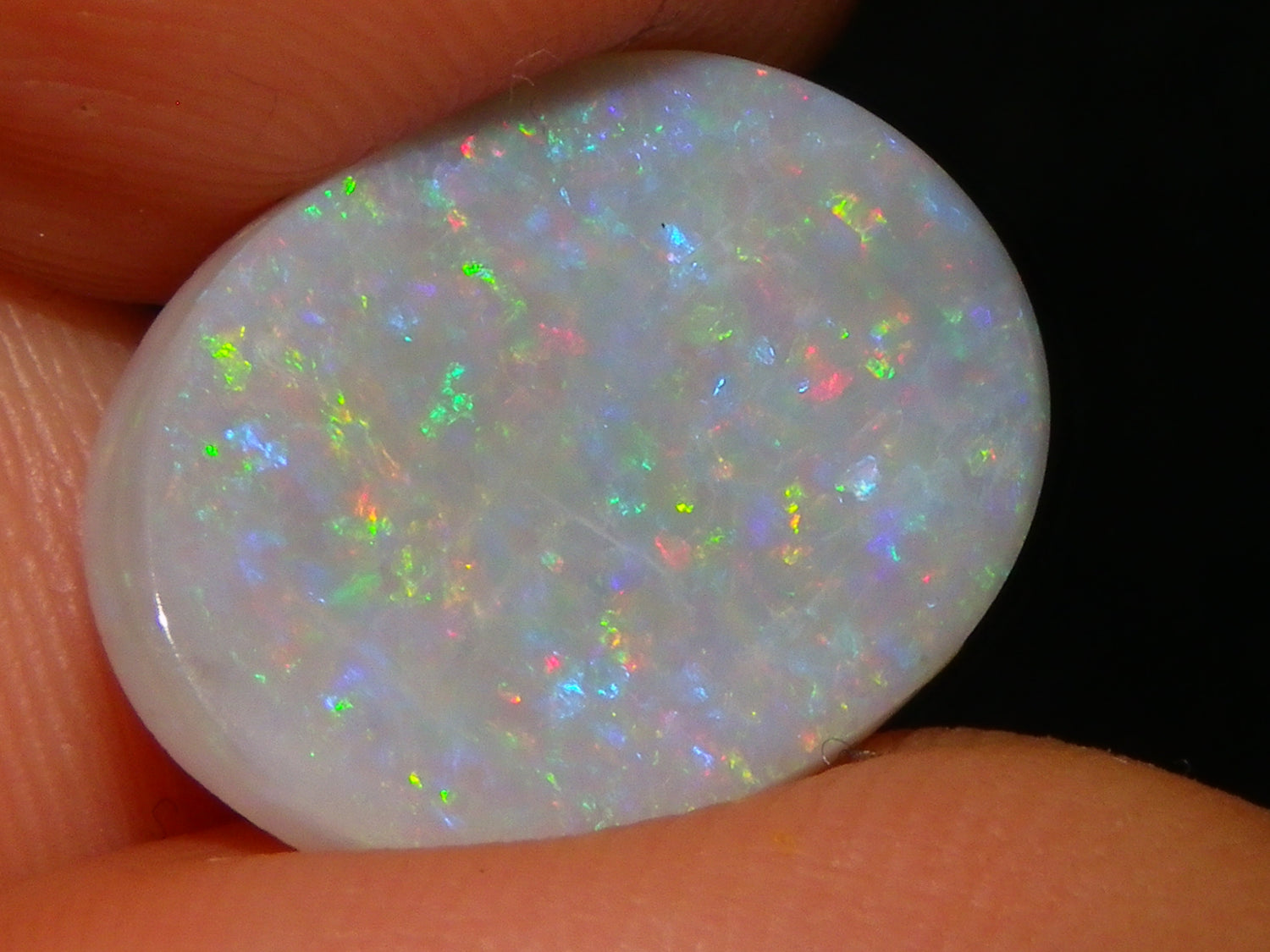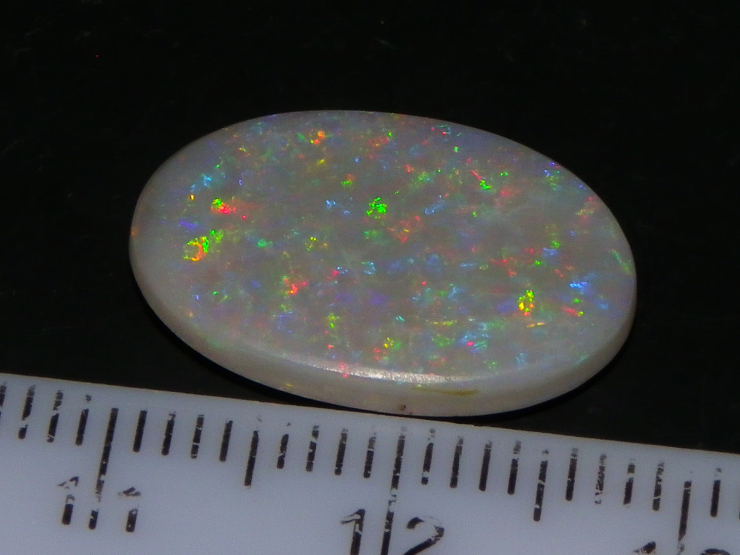 I have for sale a Nice Mintabie Crystal/Seam Opal Cab /Oval from Australia. This one weighs 4.8cts and is 18x12x2mm,. Grey Base Crystal with a Great Polish, Multicolour Floral Pattern over the whole front face. No issues. Some slight Sand on the back. Great stone for making a Pendant or similar,.,. Fires visible from all angles on this one.,.,.,. Thanks for looking.,.,.