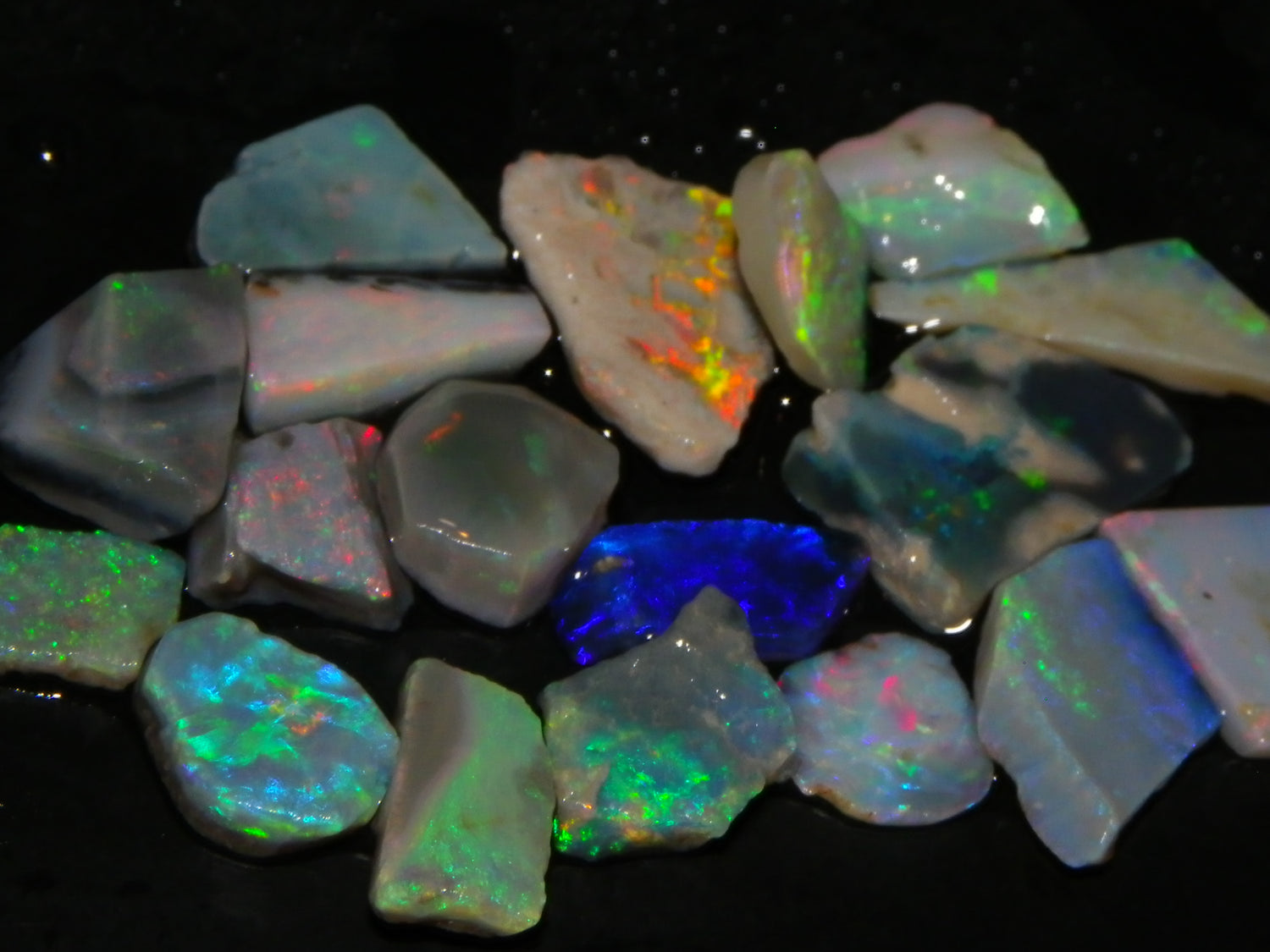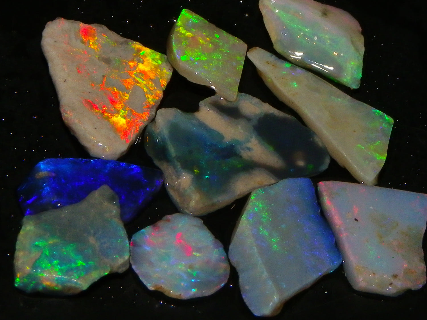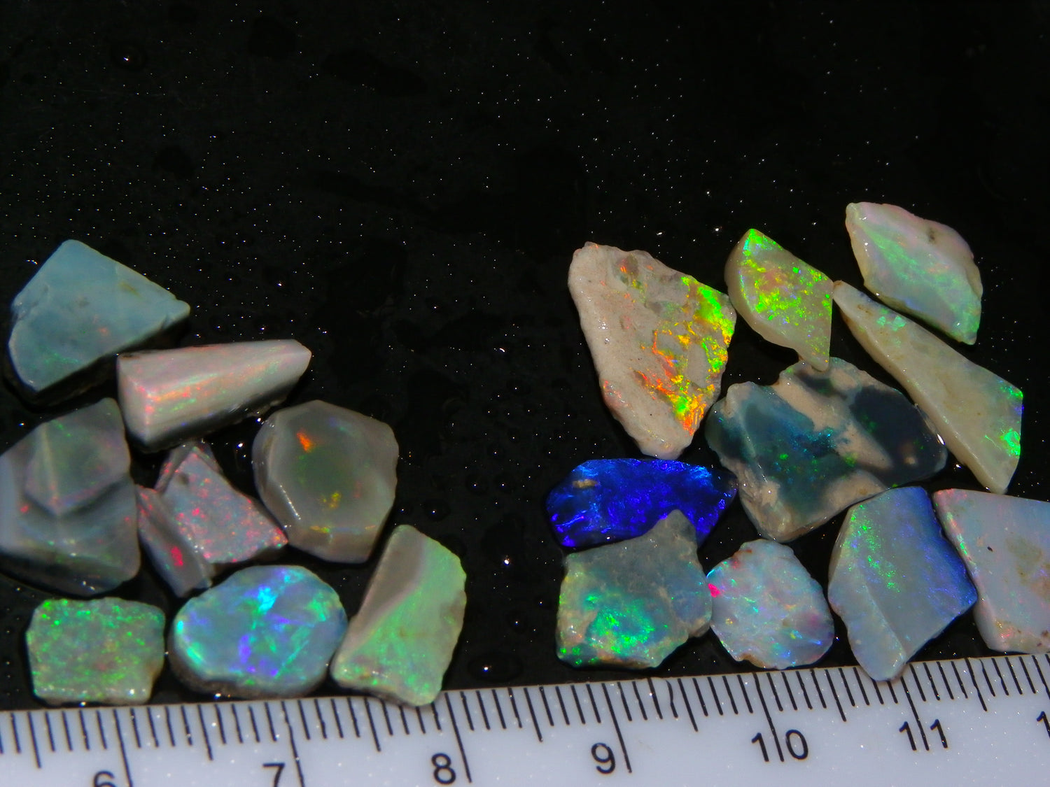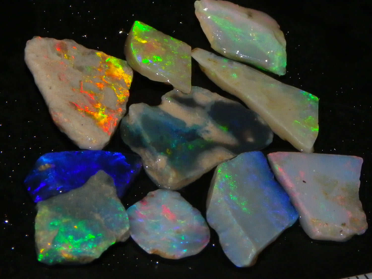 I have for sale a Nice Parcel of Small Rubbed Seam Opals, odd Fossil Opal from both Lightning Ridge, (LHS and Mintabie (RHS) of the pic. These weigh 37cts in total. They are Mixed base Light/Crystal and Grey Base material, These have Greens/Oranges/Blues and Reds. Also some Sand/Inclusion and Potch in places here to. Great lot for practice cutting, Specimens, and should cut some Small Cabs/Freeforms once worked through.,,. Thanks for looking..