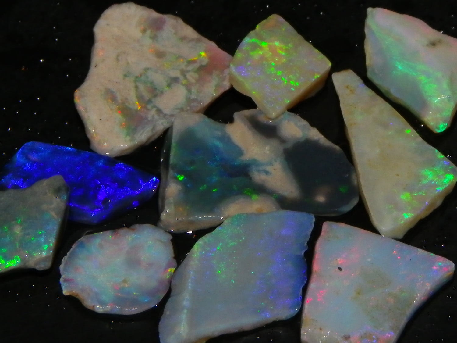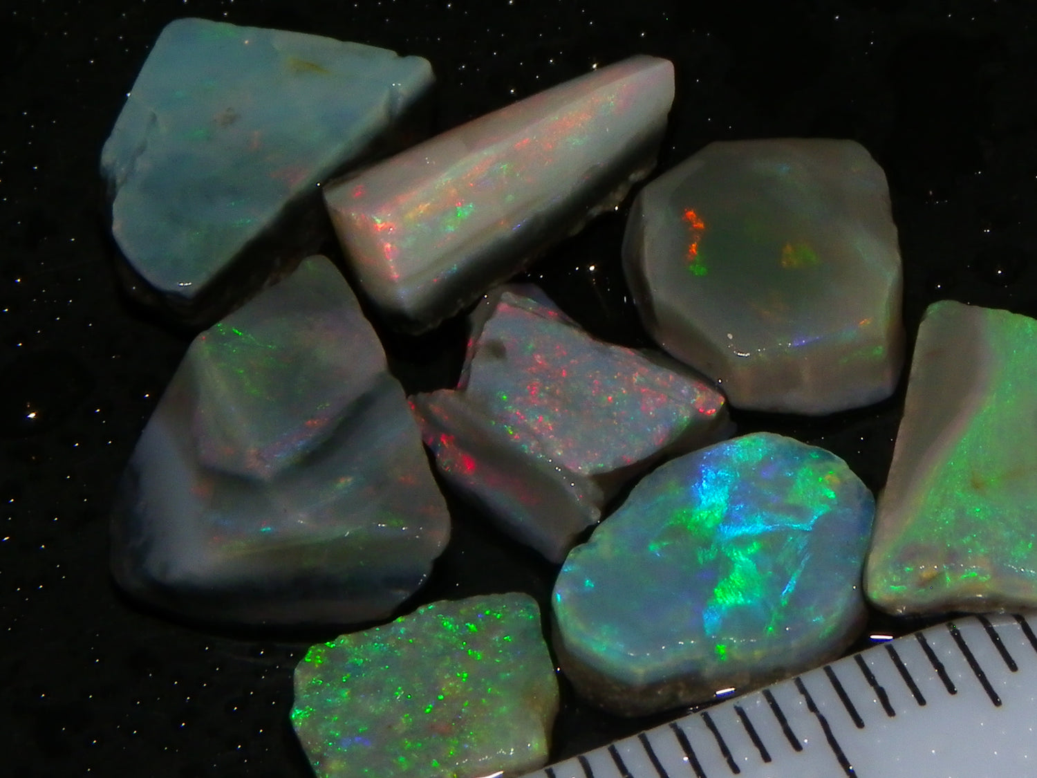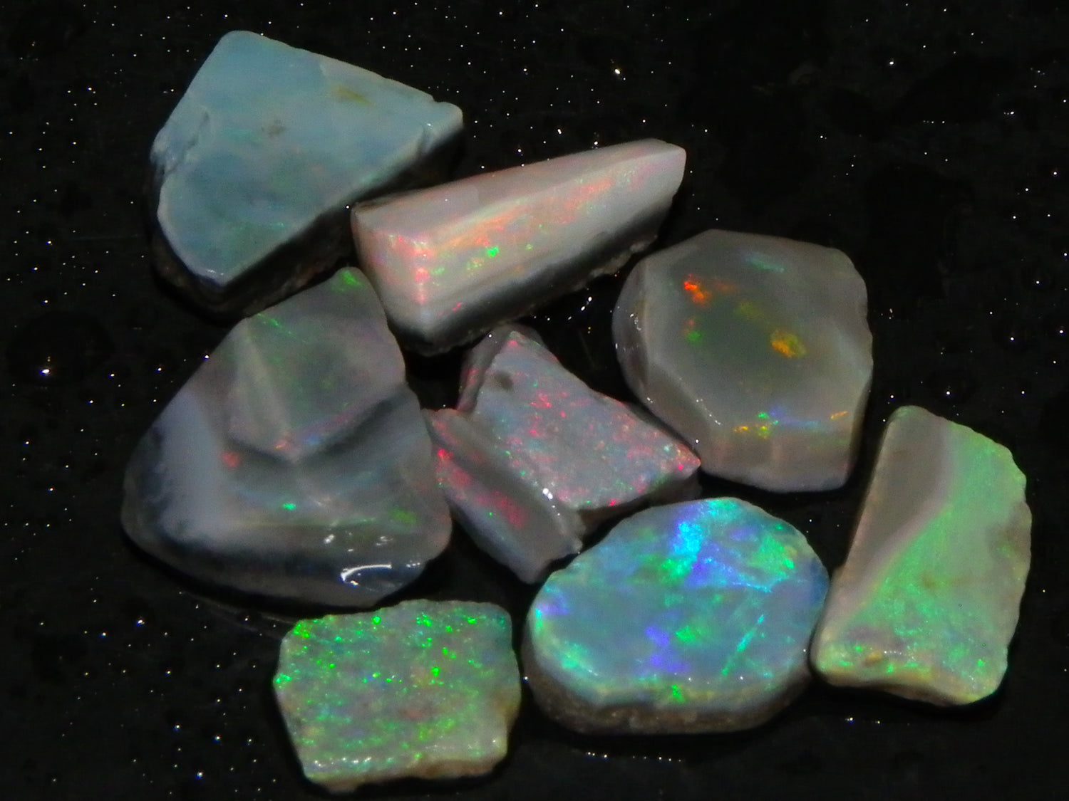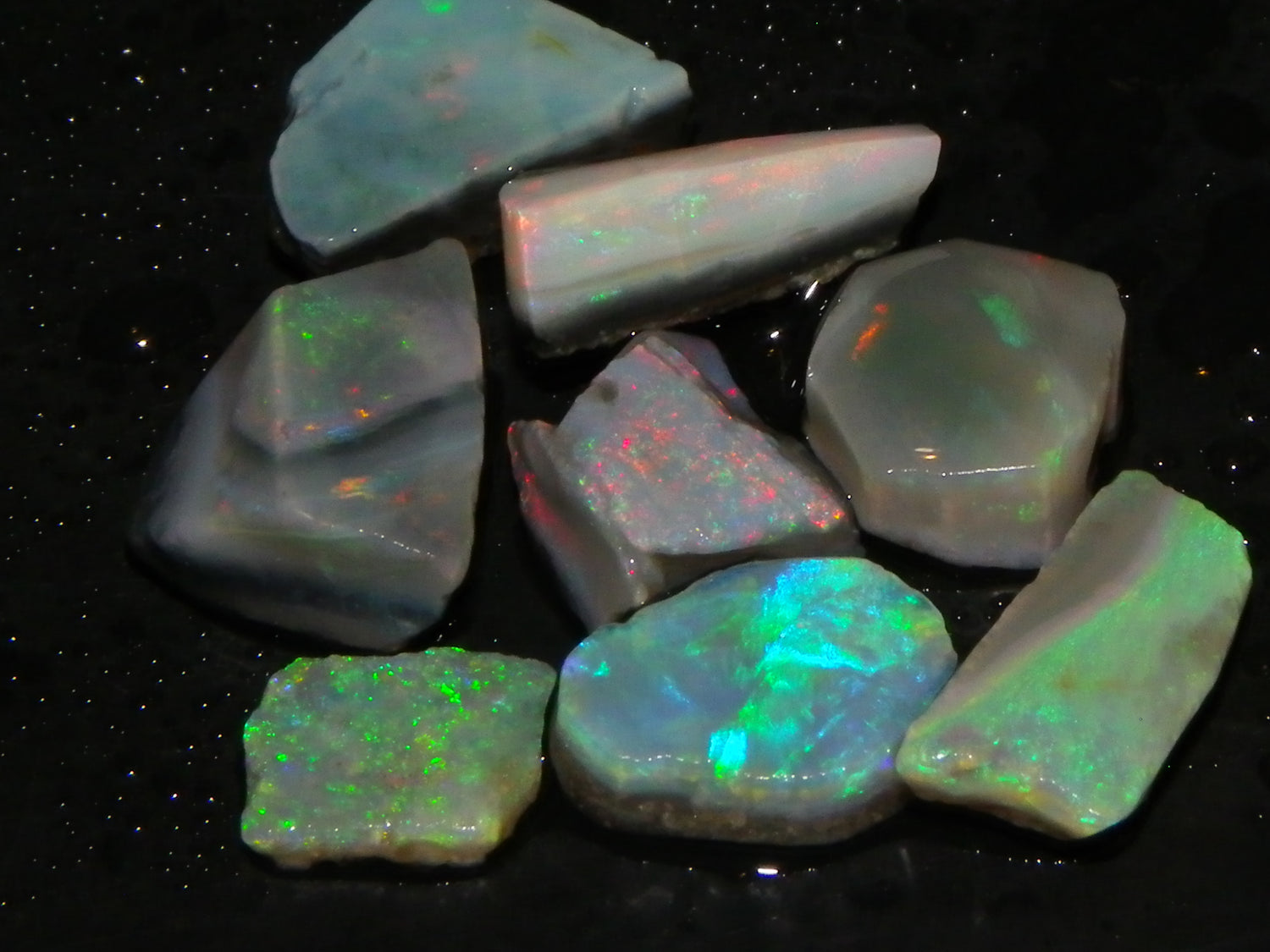 I have for sale a Nice Parcel of Small Rubbed Seam Opals, odd Fossil Opal from both Lightning Ridge, (LHS and Mintabie (RHS) of the pic. These weigh 37cts in total. They are Mixed base Light/Crystal and Grey Base material, These have Greens/Oranges/Blues and Reds. Also some Sand/Inclusion and Potch in places here to. Great lot for practice cutting, Specimens, and should cut some Small Cabs/Freeforms once worked through.,,. Thanks for looking..