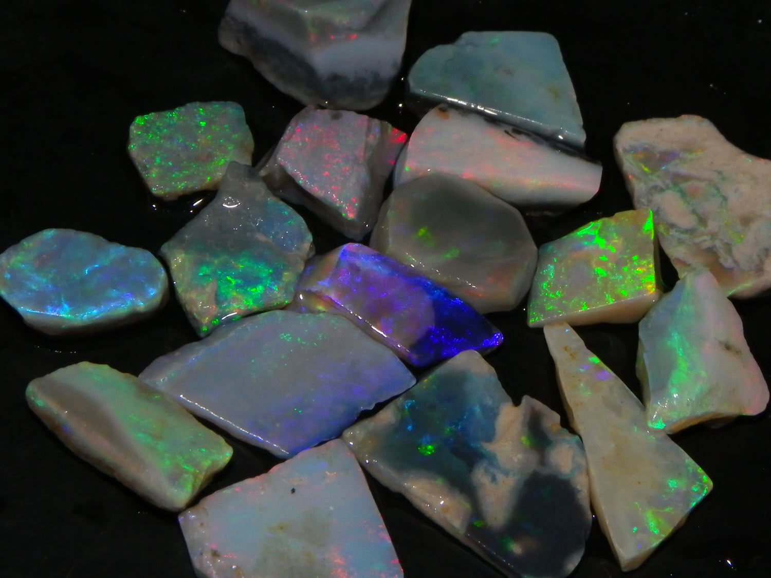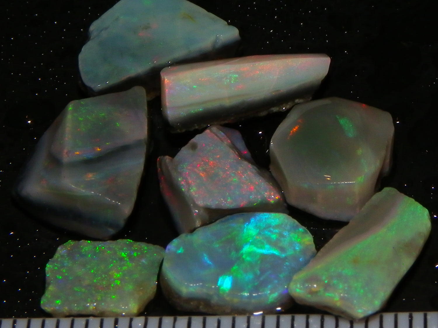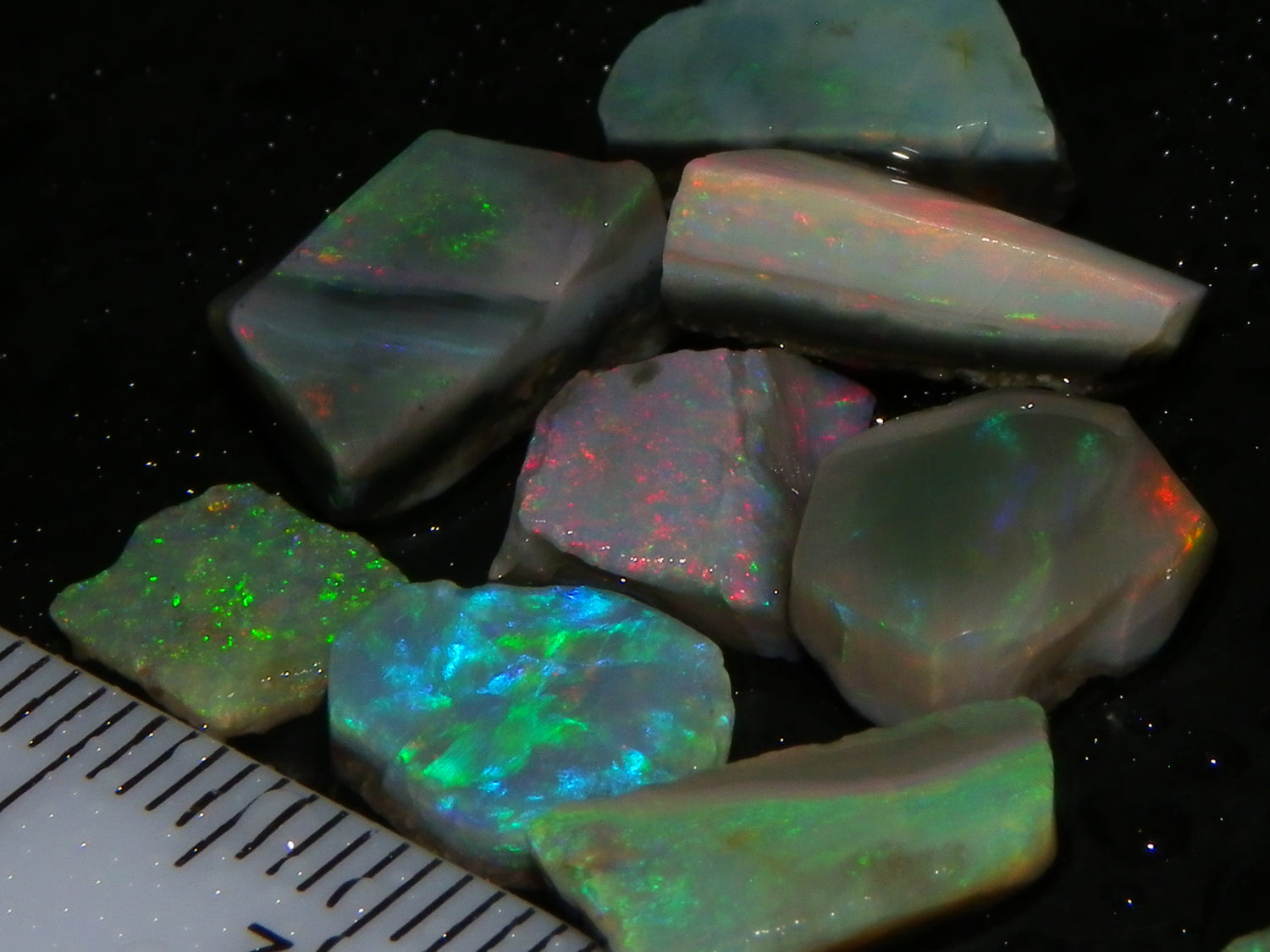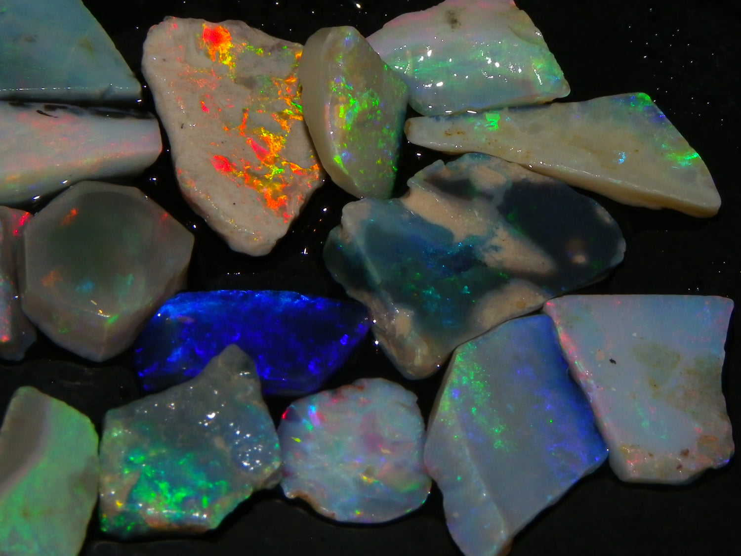 I have for sale a Nice Parcel of Small Rubbed Seam Opals, odd Fossil Opal from both Lightning Ridge, (LHS and Mintabie (RHS) of the pic. These weigh 37cts in total. They are Mixed base Light/Crystal and Grey Base material, These have Greens/Oranges/Blues and Reds. Also some Sand/Inclusion and Potch in places here to. Great lot for practice cutting, Specimens, and should cut some Small Cabs/Freeforms once worked through.,,. Thanks for looking..