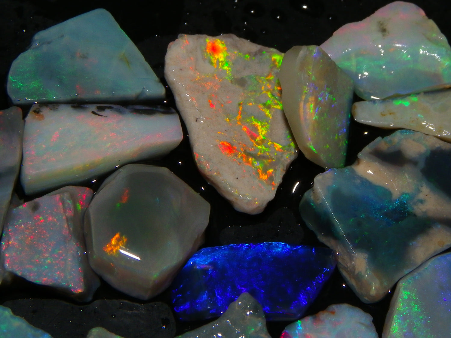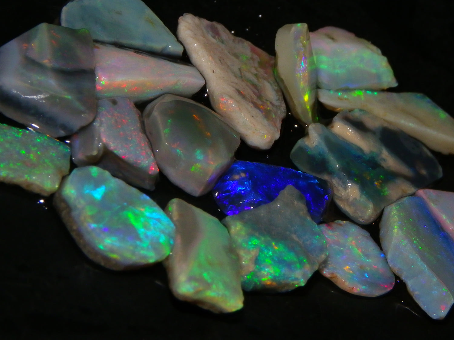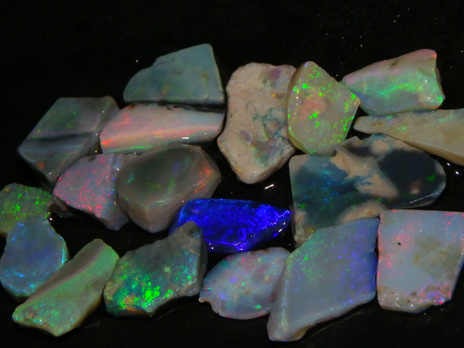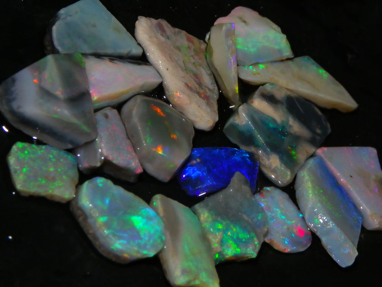 I have for sale a Nice Parcel of Small Rubbed Seam Opals, odd Fossil Opal from both Lightning Ridge, (LHS and Mintabie (RHS) of the pic. These weigh 37cts in total. They are Mixed base Light/Crystal and Grey Base material, These have Greens/Oranges/Blues and Reds. Also some Sand/Inclusion and Potch in places here to. Great lot for practice cutting, Specimens, and should cut some Small Cabs/Freeforms once worked through.,,. Thanks for looking..