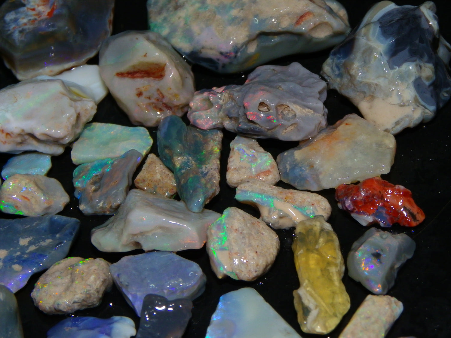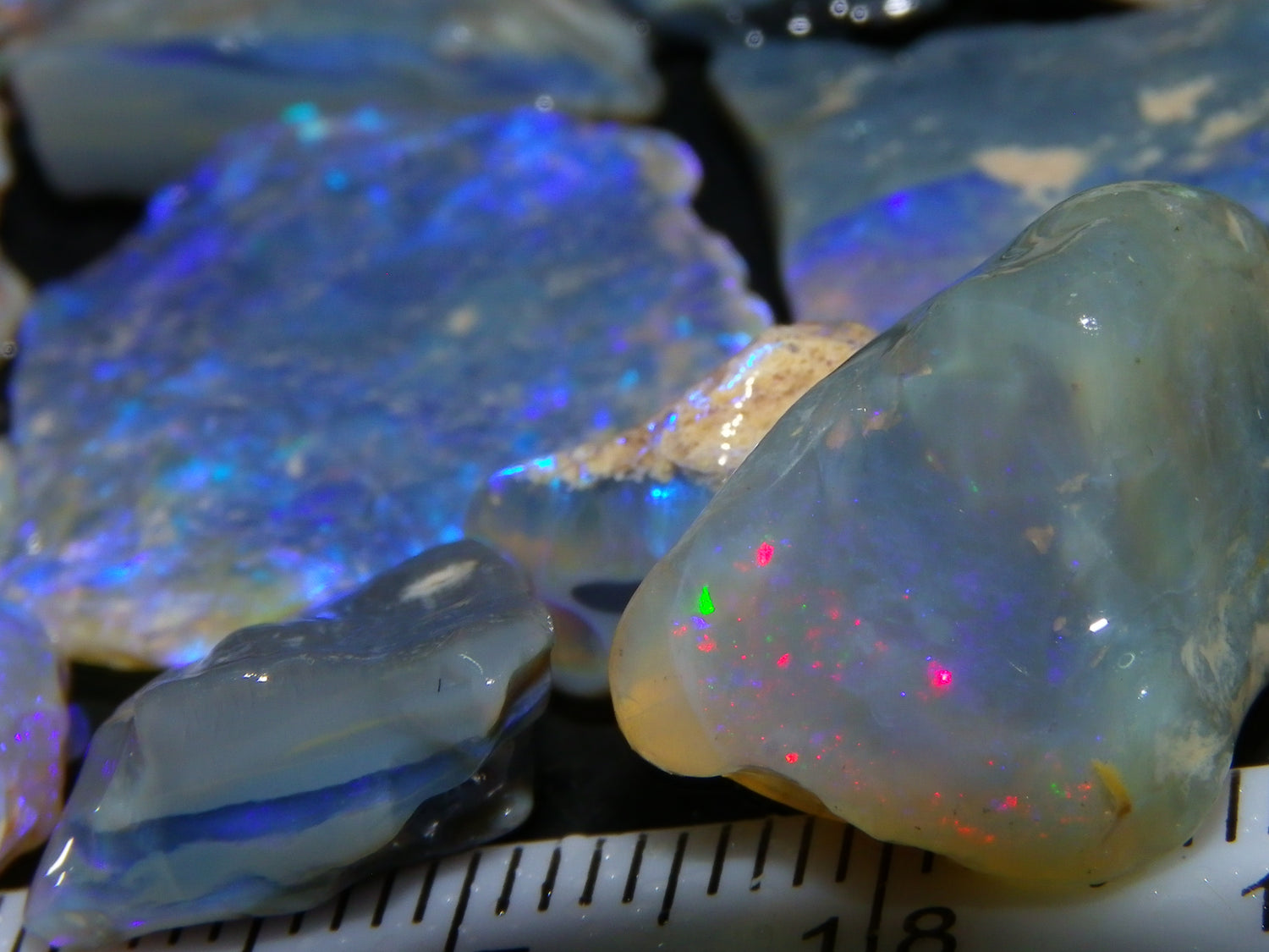 I have for sale a Nice parcel of Rough and some Rubbed opals from Lightning Ridge Australia. These weigh 344cts in total. There is Crystal/Seam/Nobby and some Fossil material here. Mixed Black-Light-Crystal Base. Most have fires showing, some Nice Blue/Greens and Pinks. Great Specimens and Practice parcel from someone, will clean up some Cabs/Pointers and Freeforms aswell once worked through. Thanks for looking.