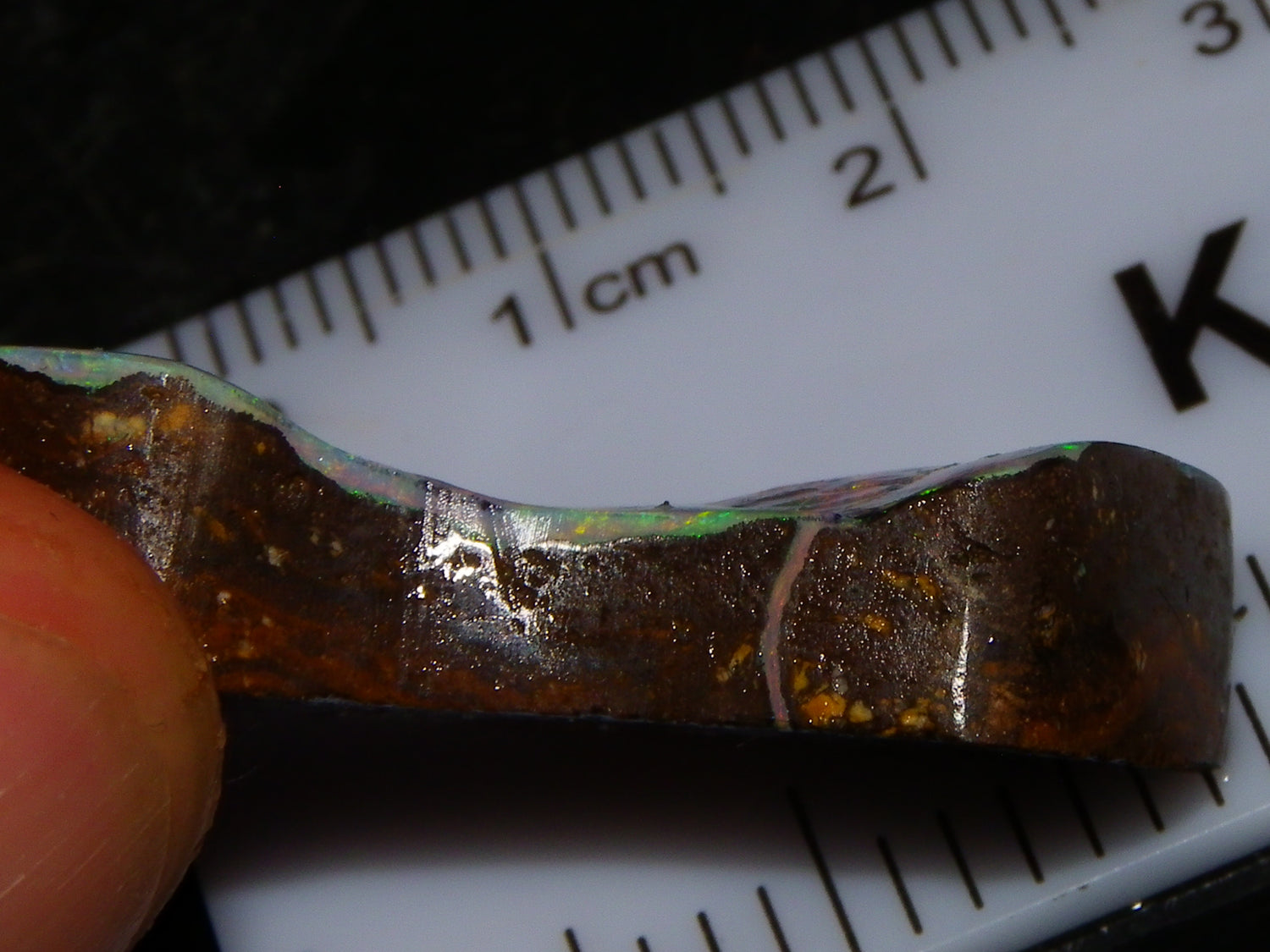 I have for sale a nice Rough/Preformed Boulder Opal from Queensland Australia. This one weighs 22.52cts and is 34x13x8mm. Its a weird shape, like a Keyhole, and waves, so has a bowl in the middle, and the ends go wider and thicker. It does have Multicolour Fires across the face. Some of the Black specks are Marker pen and will come out, there may be a couple of sandspots to work out of it. A dremmel is essential to finish this one. Will make a great pendant once cleaned up. Thanks for looking.