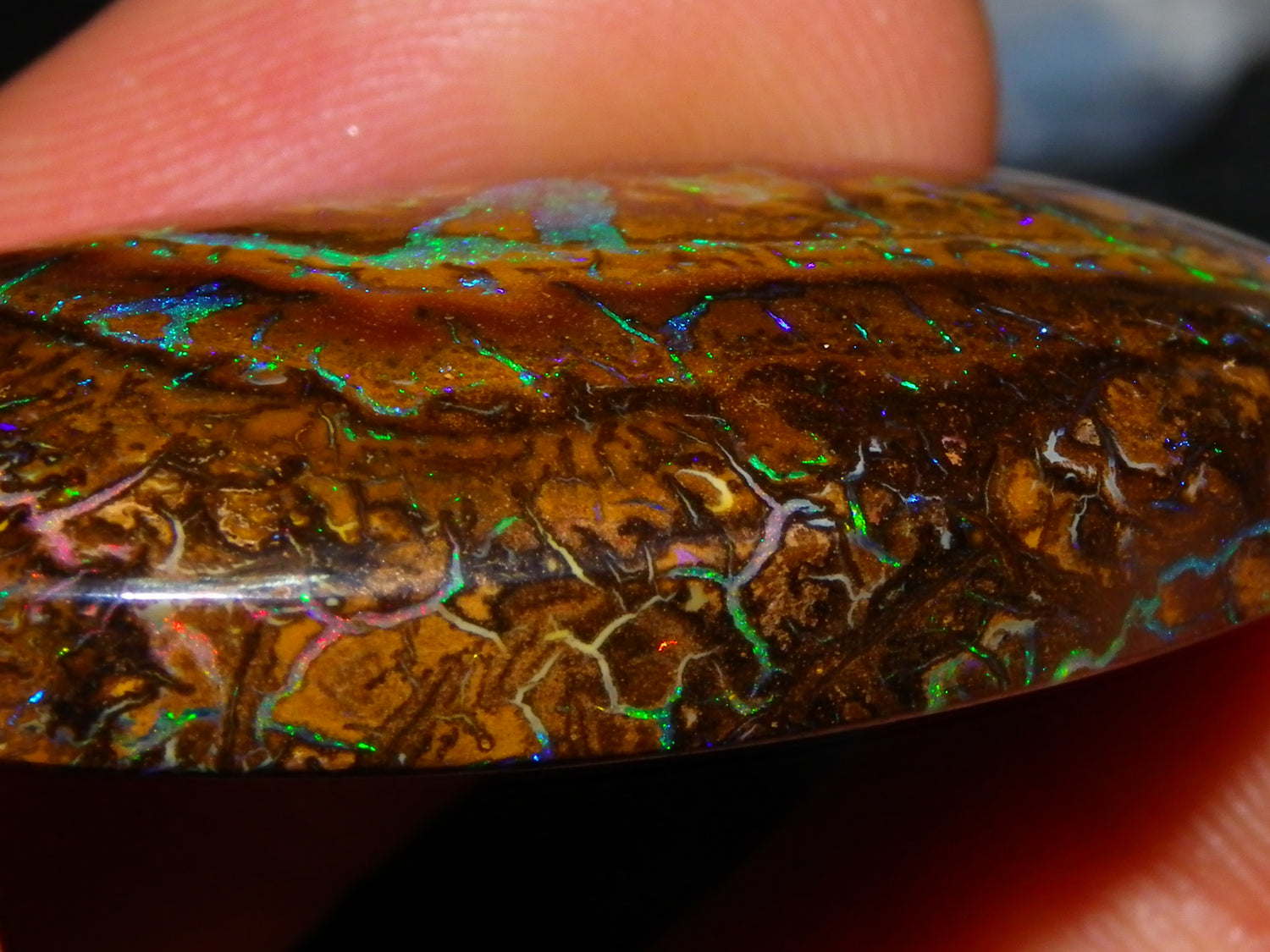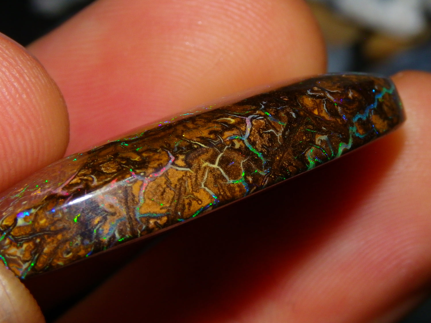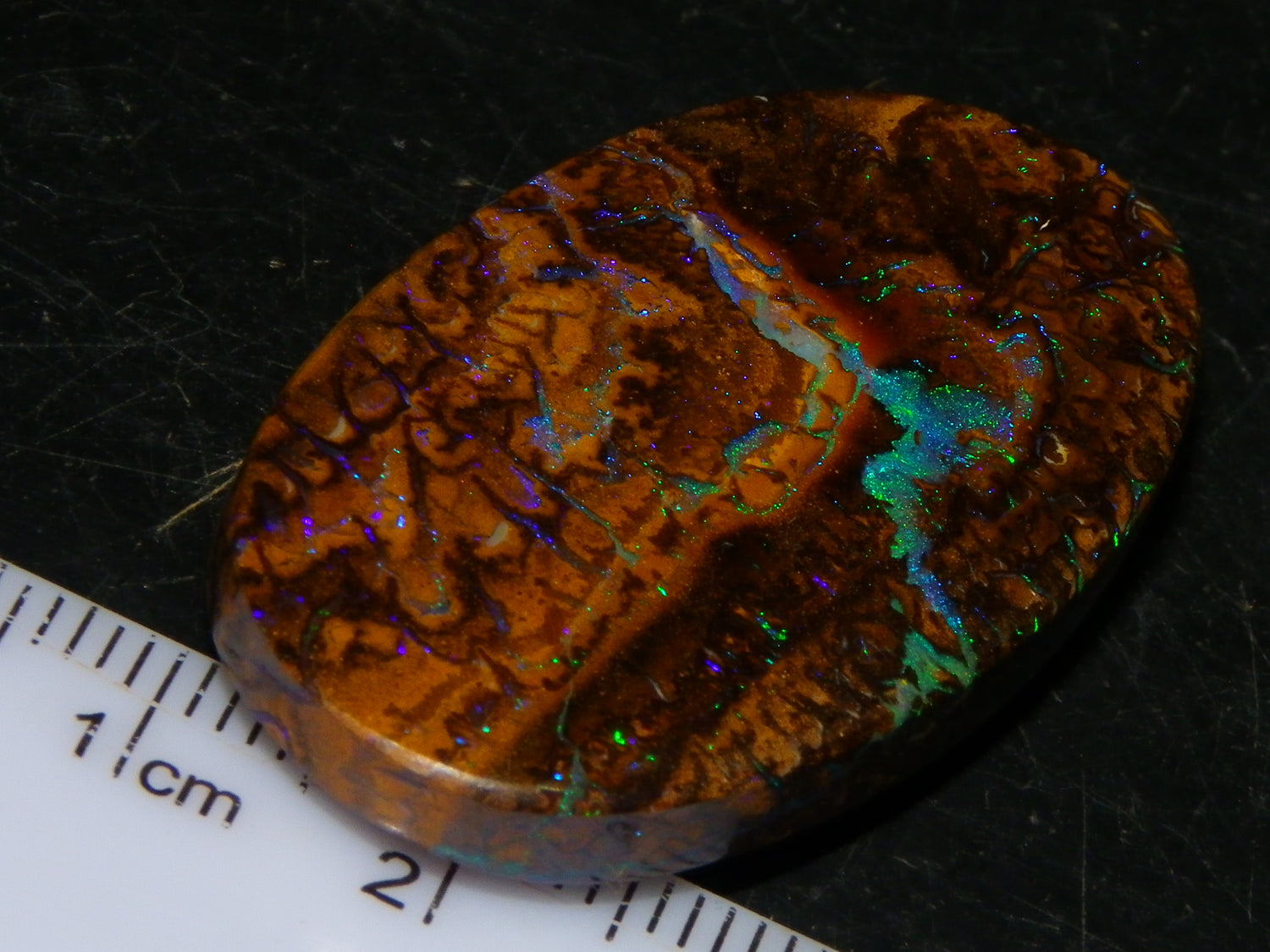 I have for sale a very nice and unique Koroit Opal Cab. This one weighs 61.1cts and is 39x22x7mm. Oval cut piece with excellent colour/patterns on both sides. This one has the Nut banding/concentric layers with Blue/Green Fires mixed through the piece in mostly small Veins/Pinfires and then the larger more unusual "U" shape in the middle. Similar on the back. Never seen one quite like this before. It will make a superb pendant, or add to a collection. Thanks for looking.