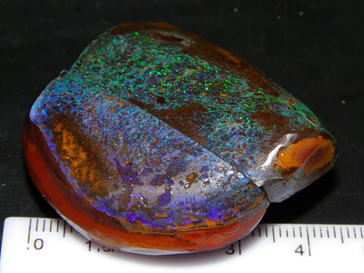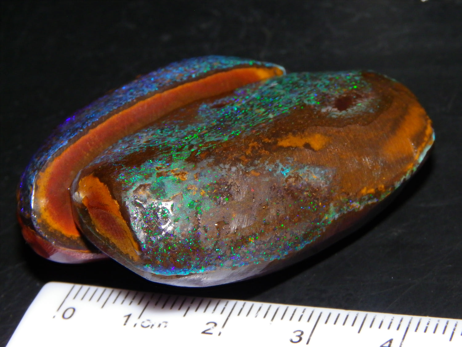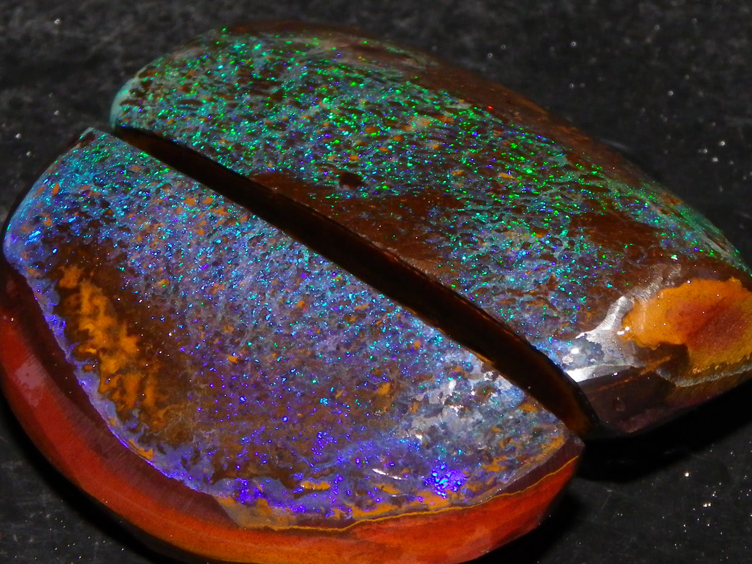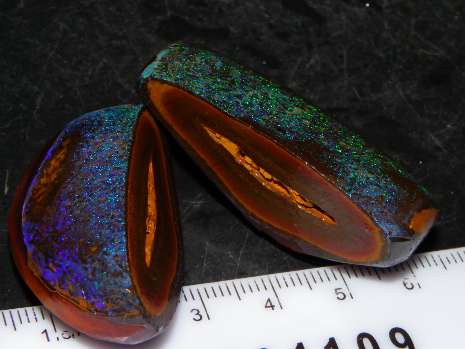 I have for sale a Rare and Unusual Sliced Koroit Opal Nut Pair/Specimens from Queensland Australia. These 2 weigh 267.5cts between them. They are an Ironstone Nut, with the Thin Blue/Green Skin exposed over a large part of the Top Faces, and sides on one. One has Nice Green Pinfires, the other has more Blue/Purples. It has been part polished aswell. With some time and work, more of the Skin can be cleaned up. Very unusual, full Nut Specimen Pair. Backs still rough, need to clean up to the thin skin,. Find another one,,. Thanks for looking,.,.