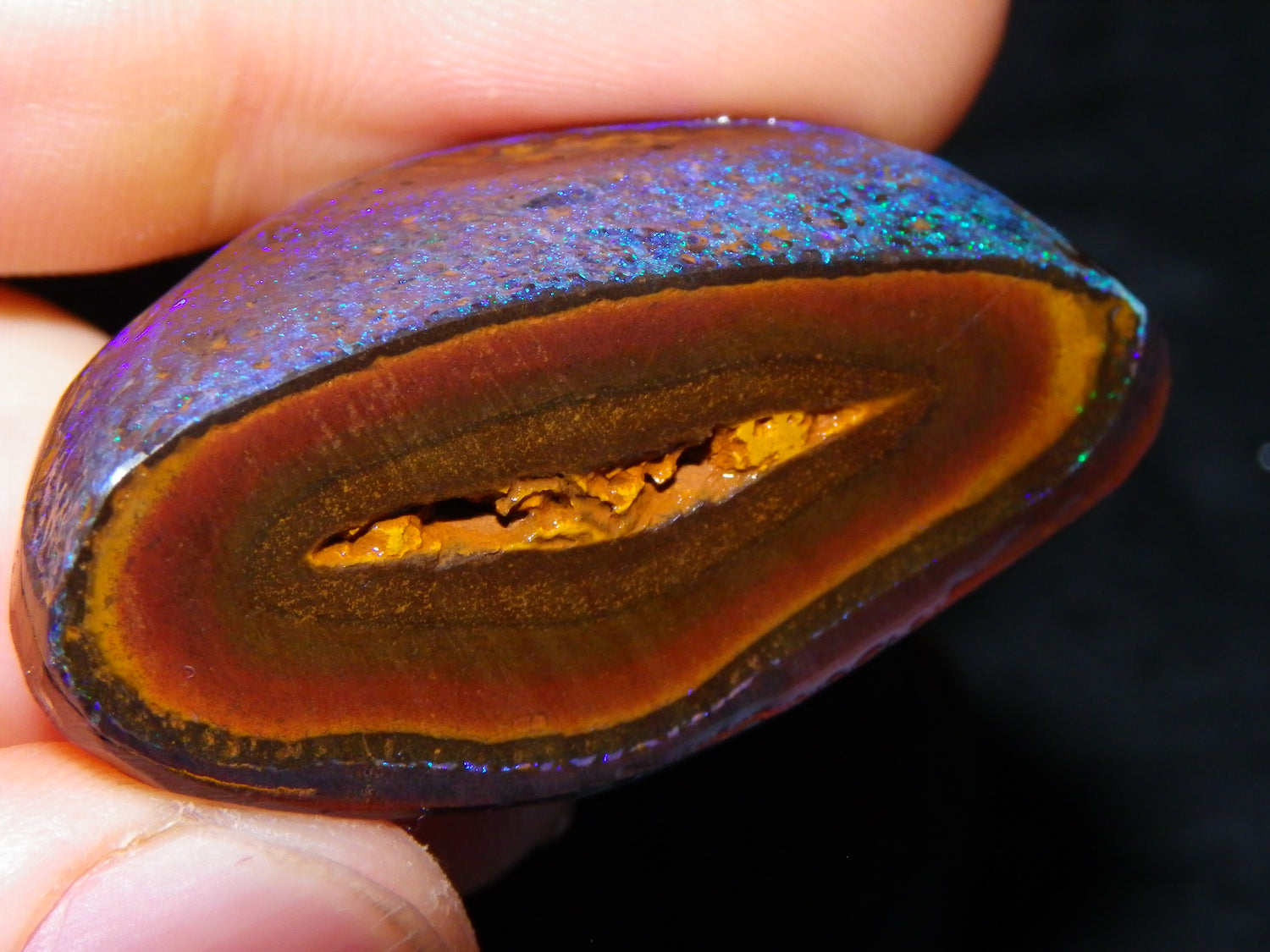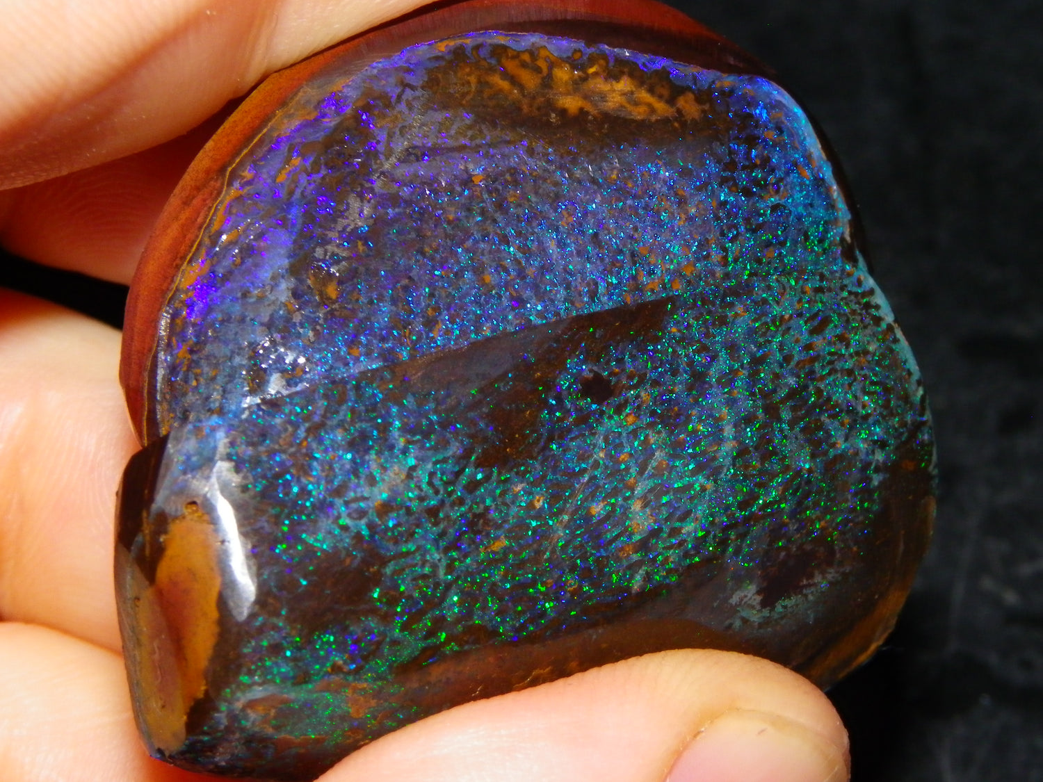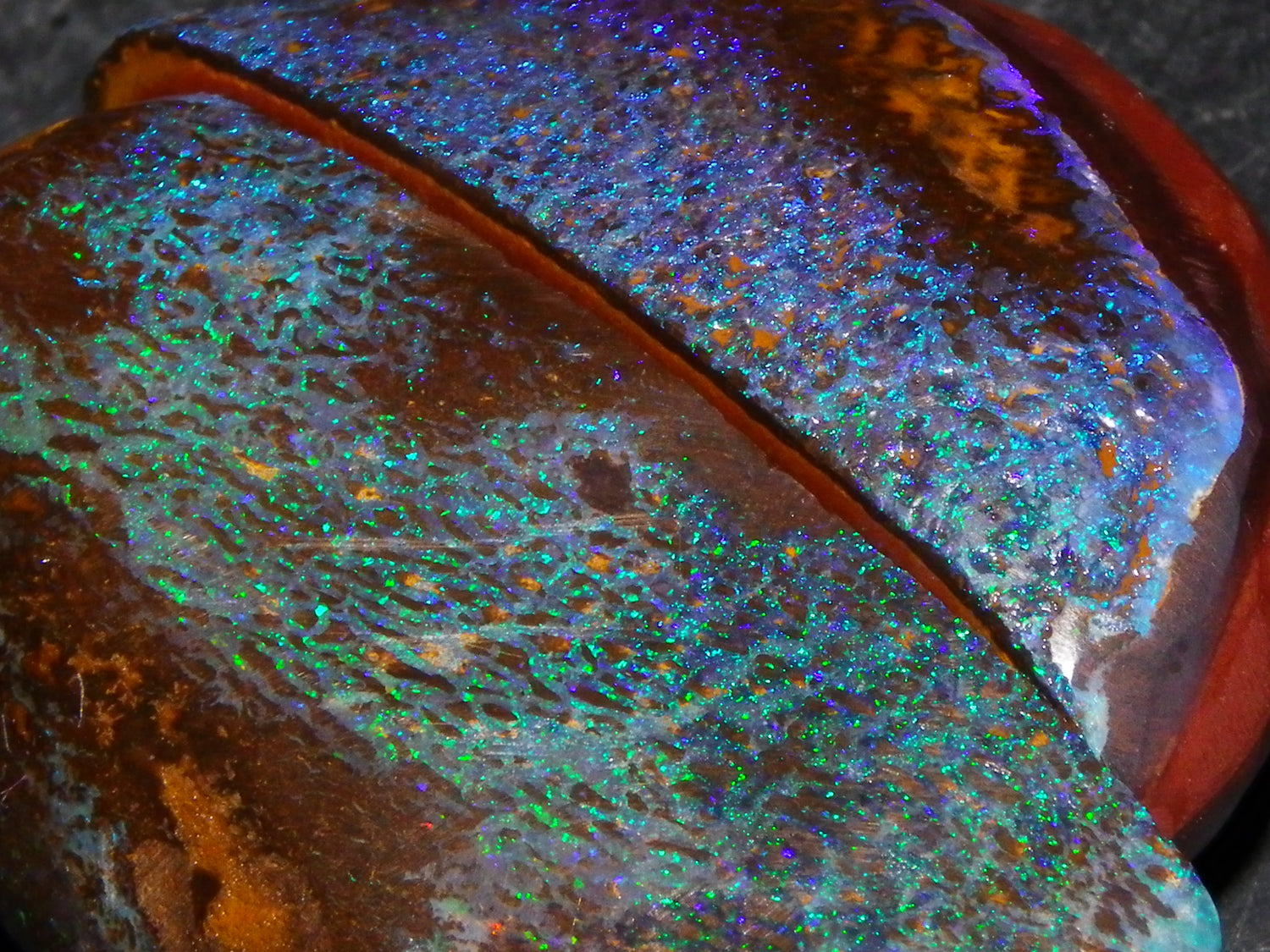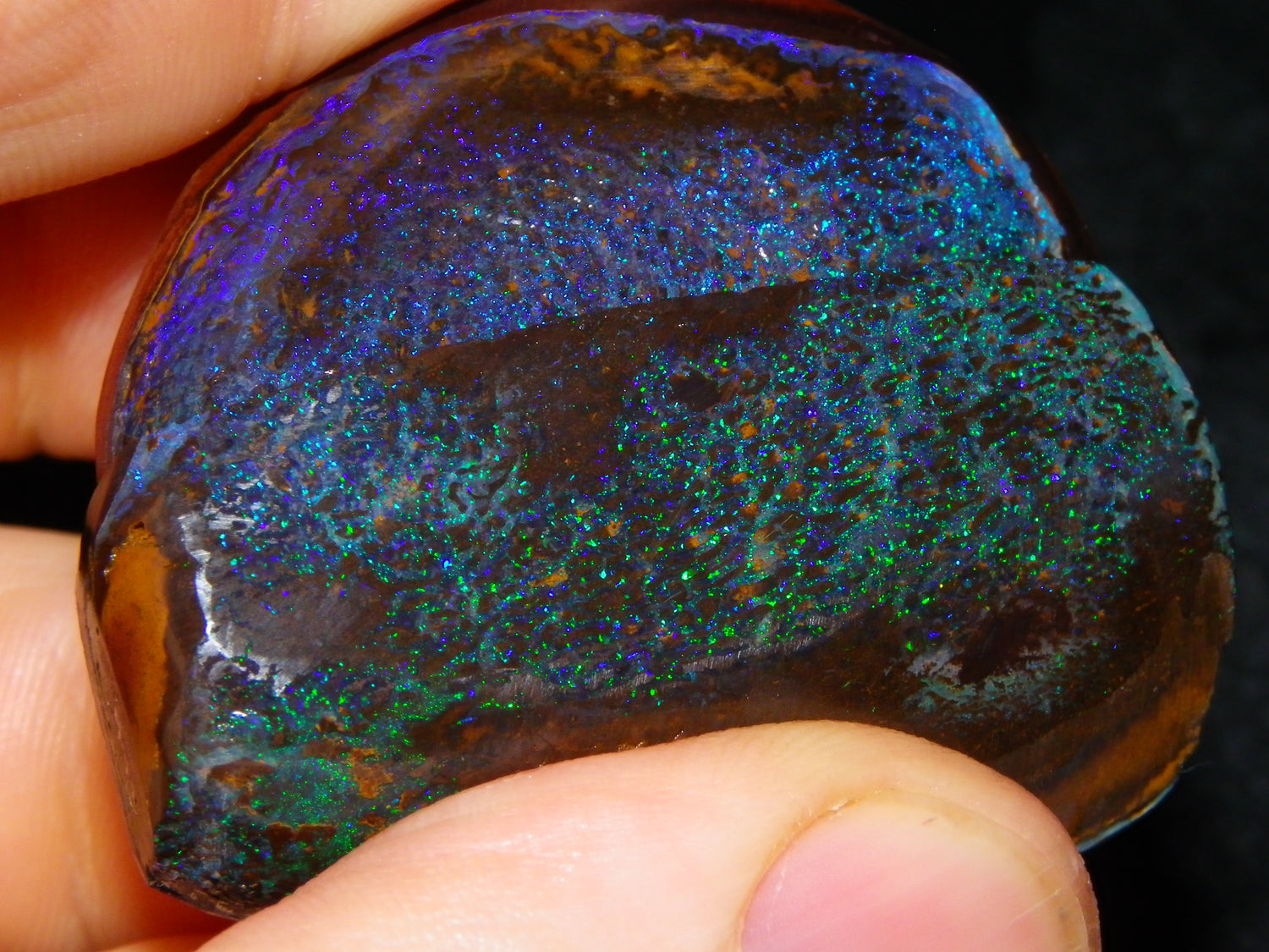 I have for sale a Rare and Unusual Sliced Koroit Opal Nut Pair/Specimens from Queensland Australia. These 2 weigh 267.5cts between them. They are an Ironstone Nut, with the Thin Blue/Green Skin exposed over a large part of the Top Faces, and sides on one. One has Nice Green Pinfires, the other has more Blue/Purples. It has been part polished aswell. With some time and work, more of the Skin can be cleaned up. Very unusual, full Nut Specimen Pair. Backs still rough, need to clean up to the thin skin,. Find another one,,. Thanks for looking,.,.
